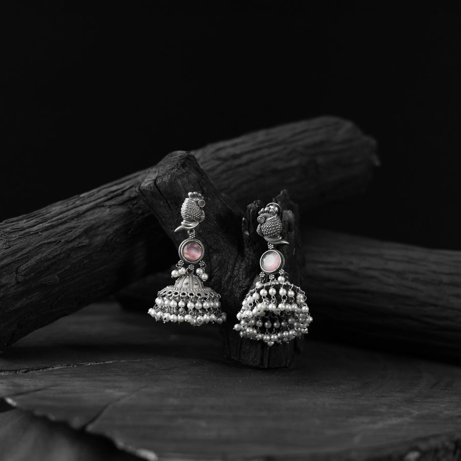 Oxidised handcrafted light pink earrings made with a blend of metal, stones, pearls, beads, and fine detailing. Perfect for festive occasions, weddings, casual outings, office wear, or vacations. Their elegant black and silver tones pair beautifully with everything from casual jeans and flowy dresses to chic office ensembles. A meaningful gift for mother, sister, wife, or girlfriend adding a beautiful touch of tradition to every moment.