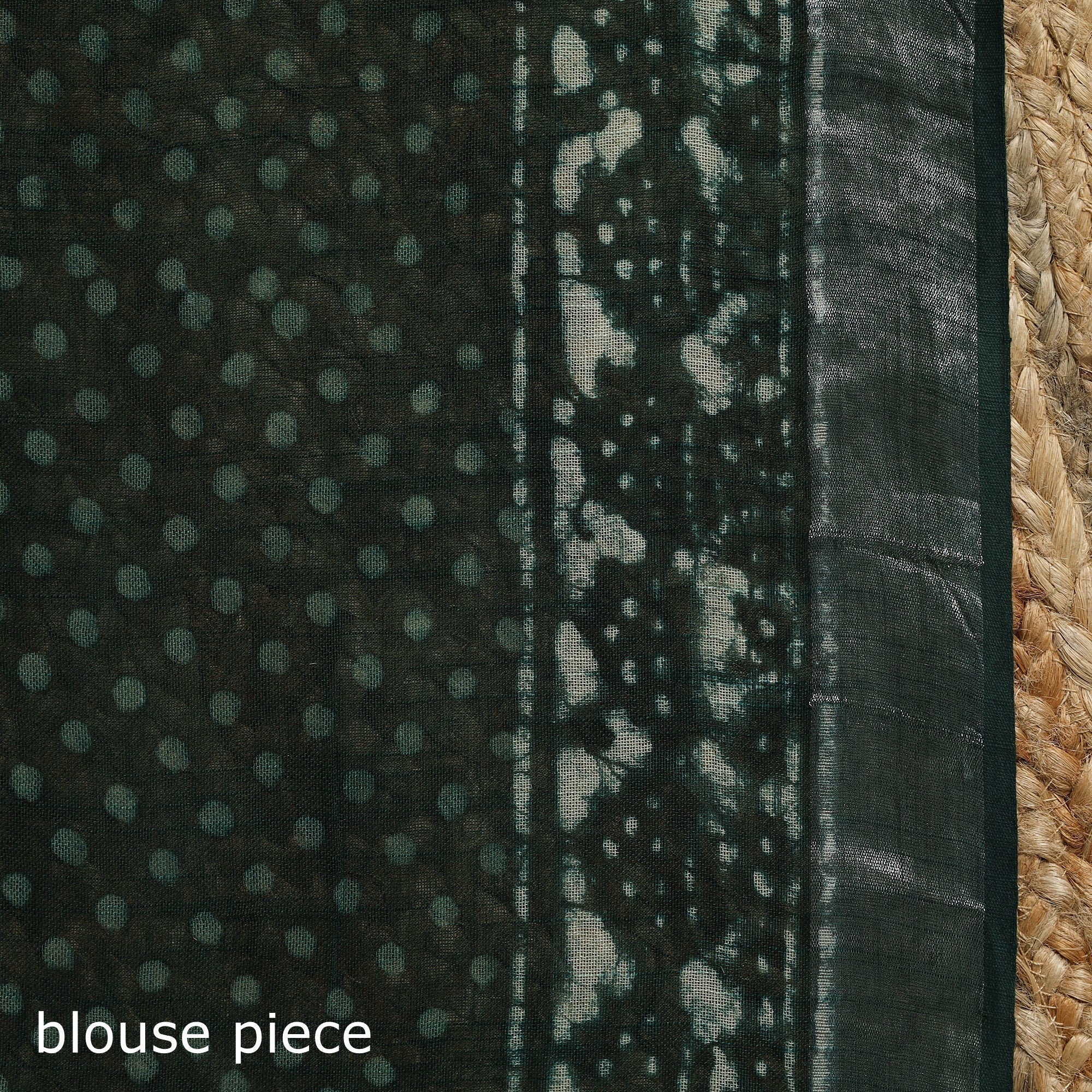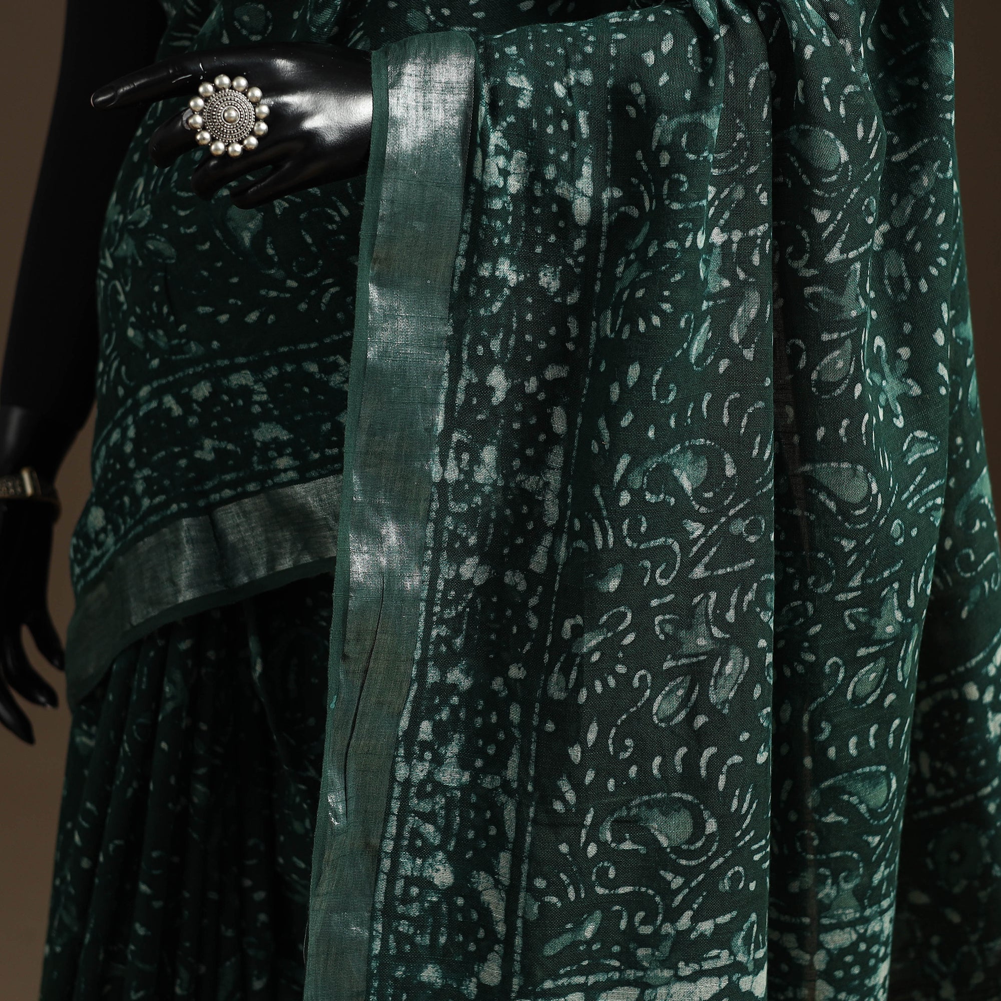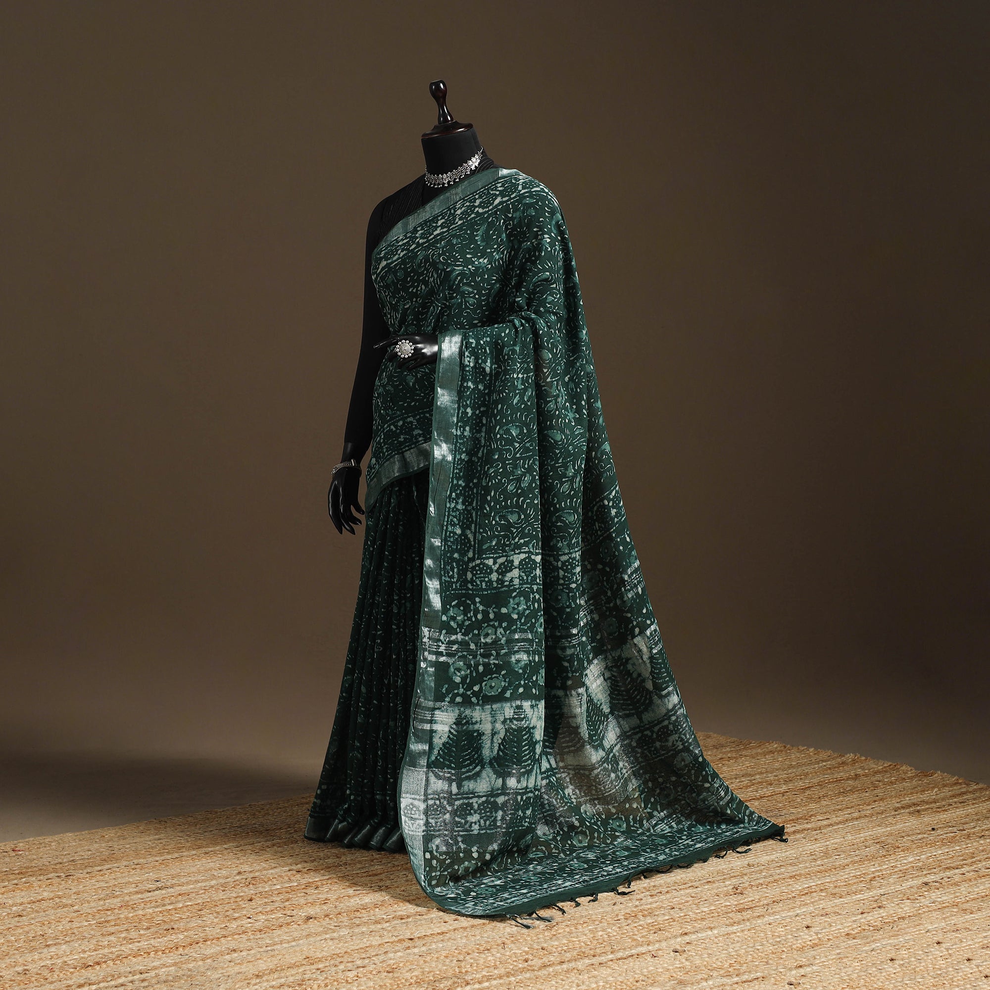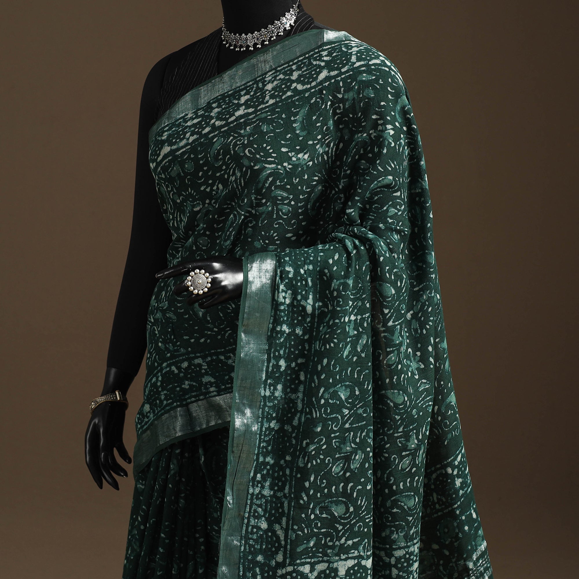 This green linen saree with zari border features traditional bagru block printing, known for its bold patterns. Made using hand-carved wooden blocks and natural dyes, it has a breathable texture and a graceful drape. Originating from Bagru, a village near Jaipur in Rajasthan, this printing style has been practiced for generations. Suitable for both everyday wear and special occasions, it beautifully blends comfort and style.