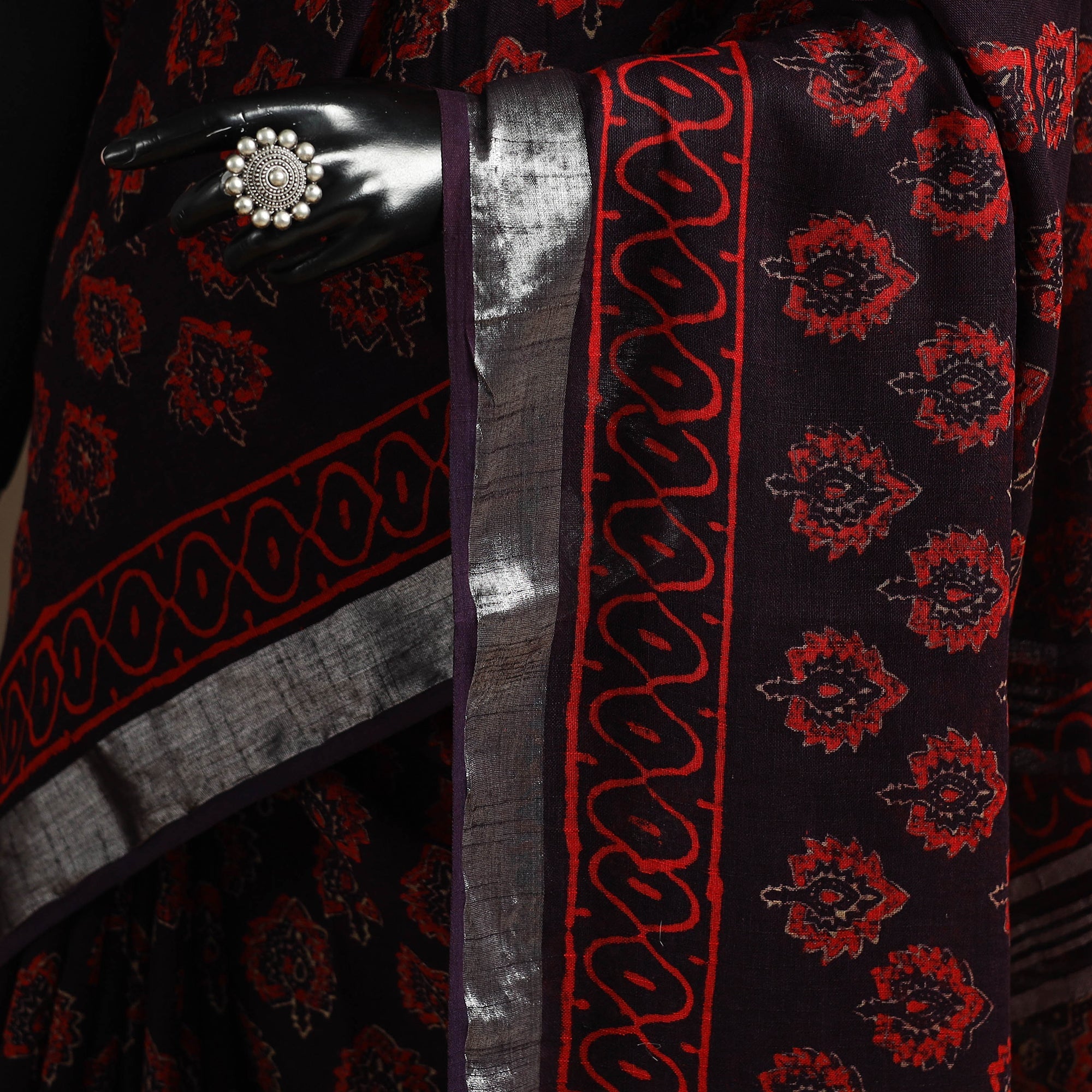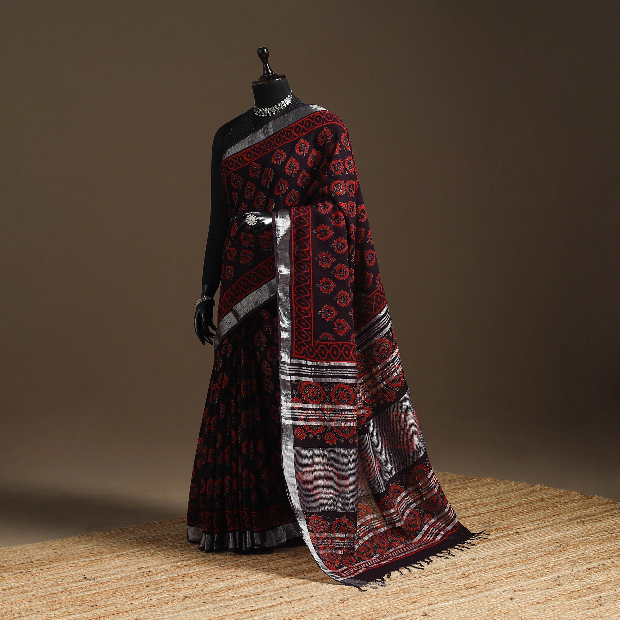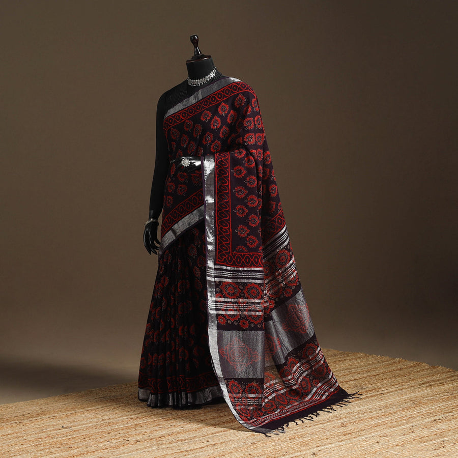 This red linen saree with zari border features traditional bagru block printing, known for its bold patterns. Made using hand-carved wooden blocks and natural dyes, it has a breathable texture and a graceful drape. Originating from Bagru, a village near Jaipur in Rajasthan, this printing style has been practiced for generations. Suitable for both everyday wear and special occasions, it beautifully blends comfort and style.