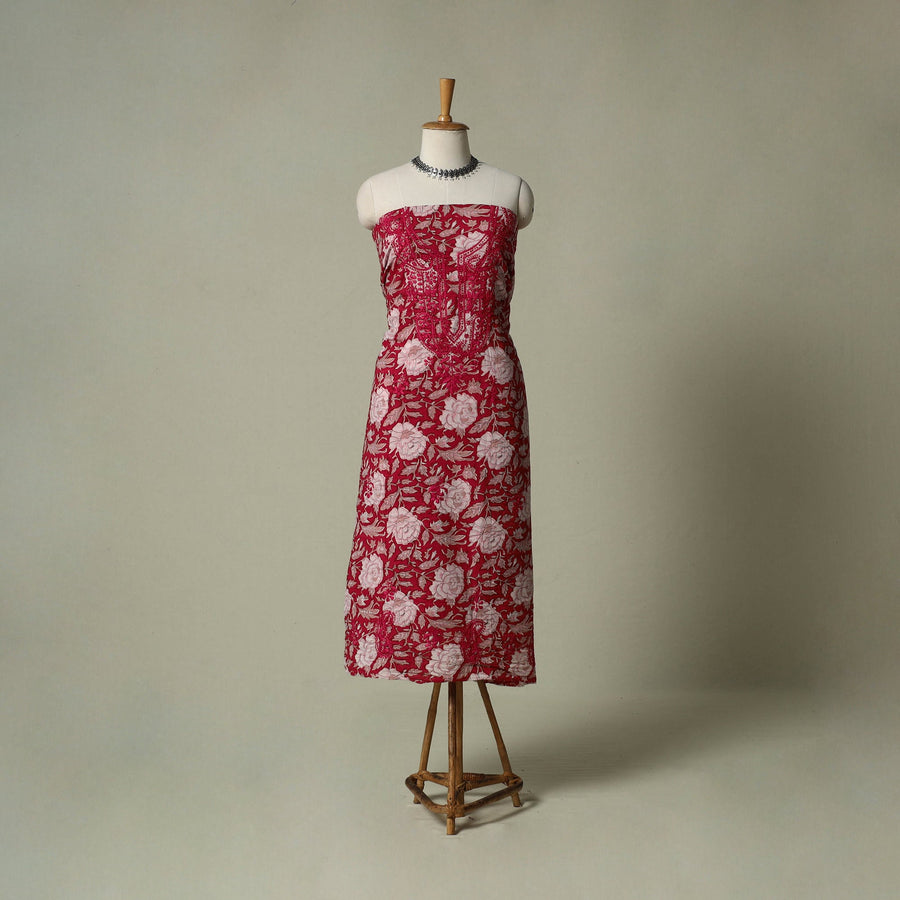 Lucknowi chikankari cotton sanganeri unstitched kurta material beautifully brings together two centuries old crafts delicate chikankari hand embroidery with traditional sanganeri hand block printing. While chikankari involves fine, detailed needlework done by hand, Sanganeri printing uses hand-carved wooden blocks to create intricate floral patterns. Crafted by skilled artisans, it can be tailored to suit your style, making it perfect for both occasions and refined everyday wear.