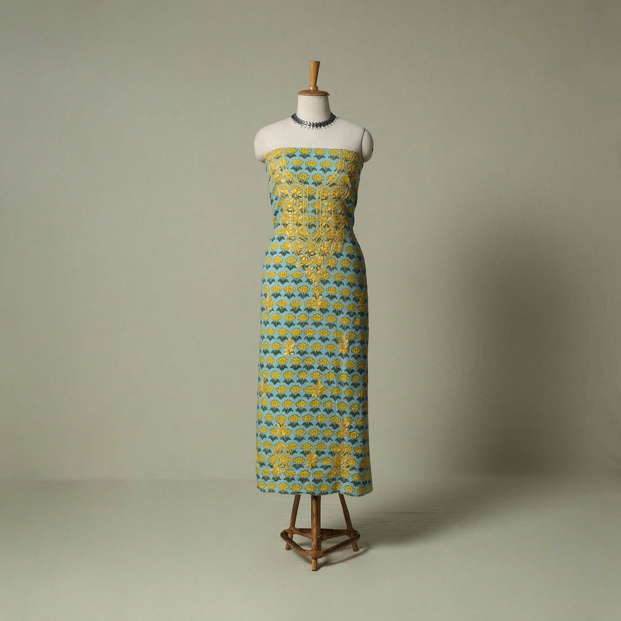 Lucknowi chikankari cotton sanganeri unstitched kurta material beautifully brings together two centuries old crafts delicate chikankari hand embroidery with traditional sanganeri hand block printing. While chikankari involves fine, detailed needlework done by hand, Sanganeri printing uses hand-carved wooden blocks to create intricate floral patterns. Crafted by skilled artisans, it can be tailored to suit your style, making it perfect for both occasions and refined everyday wear.