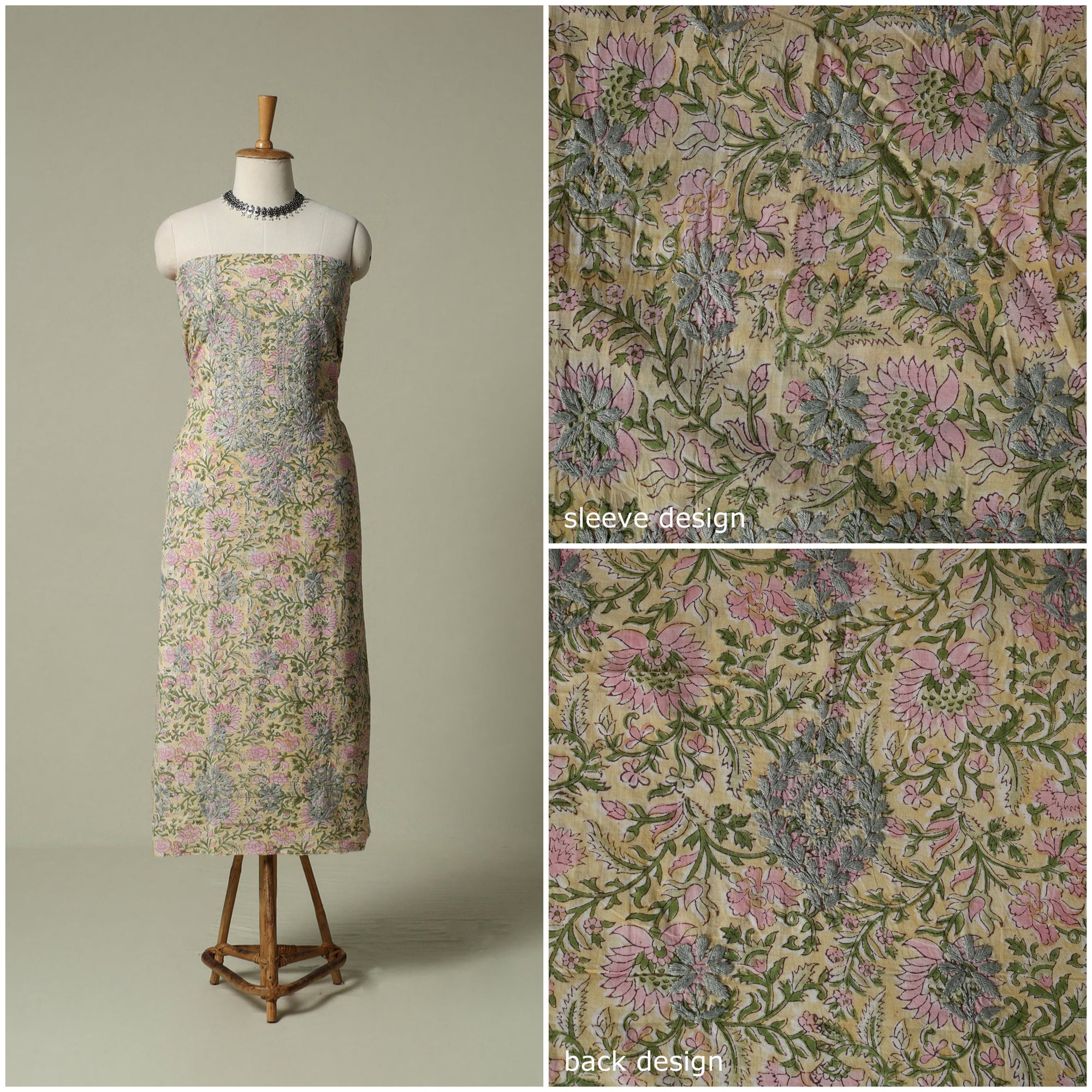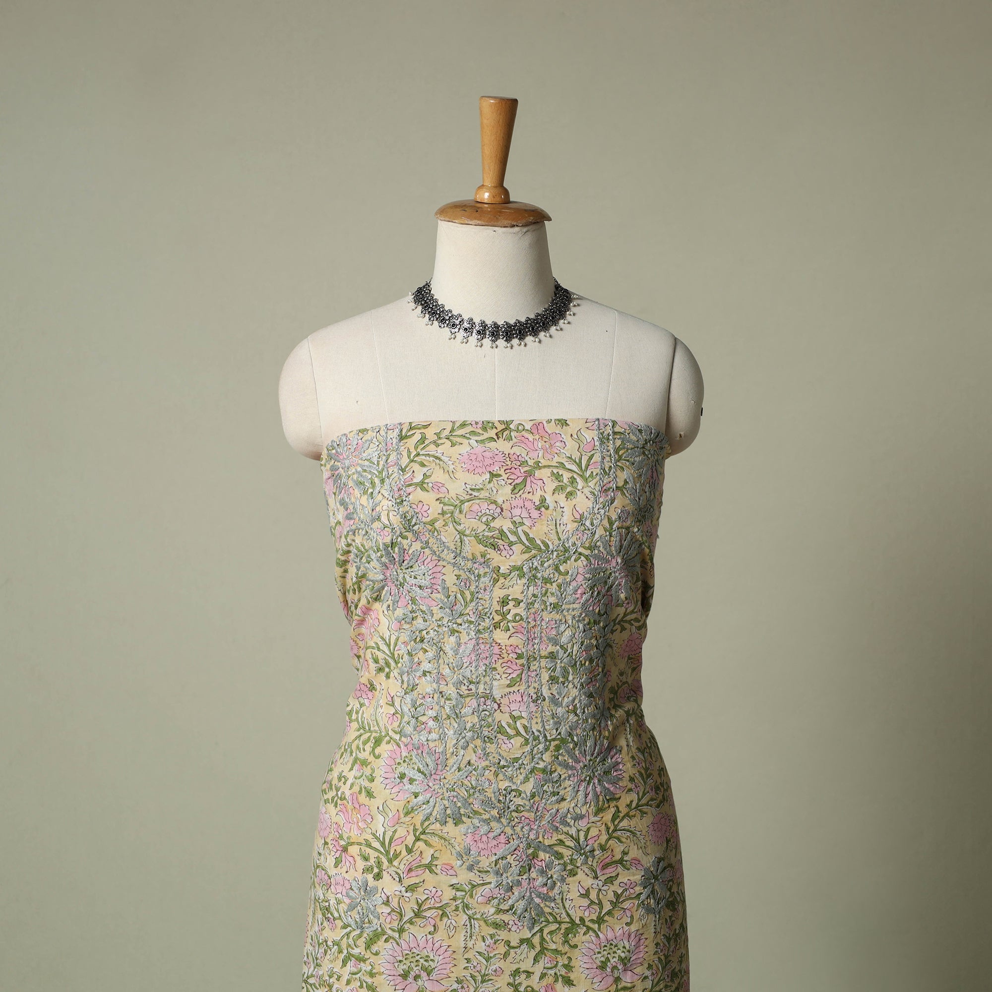Lucknowi chikankari cotton sanganeri unstitched kurta material beautifully brings together two centuries old crafts delicate chikankari hand embroidery with traditional sanganeri hand block printing. While chikankari involves fine, detailed needlework done by hand, Sanganeri printing uses hand-carved wooden blocks to create intricate floral patterns. Crafted by skilled artisans, it can be tailored to suit your style, making it perfect for both occasions and refined everyday wear.