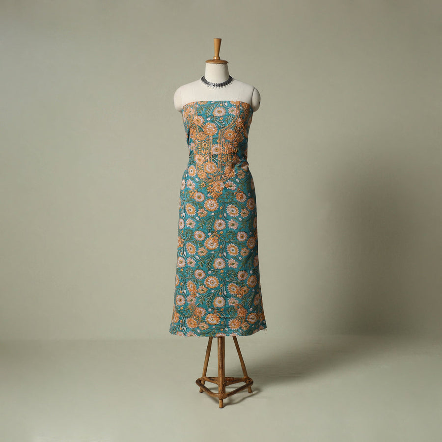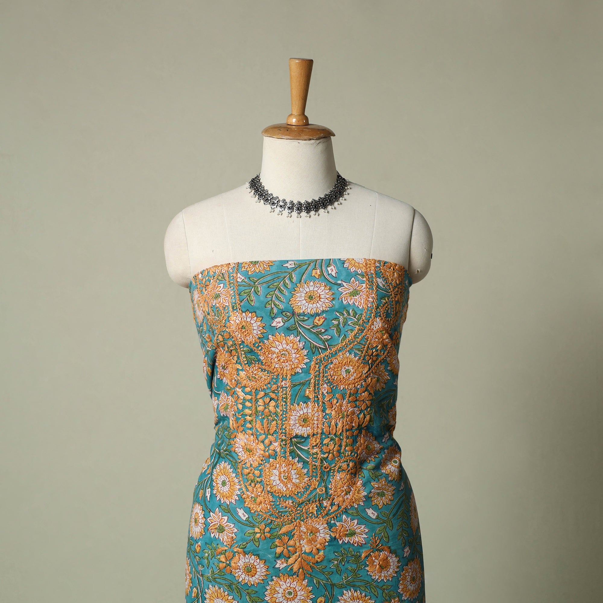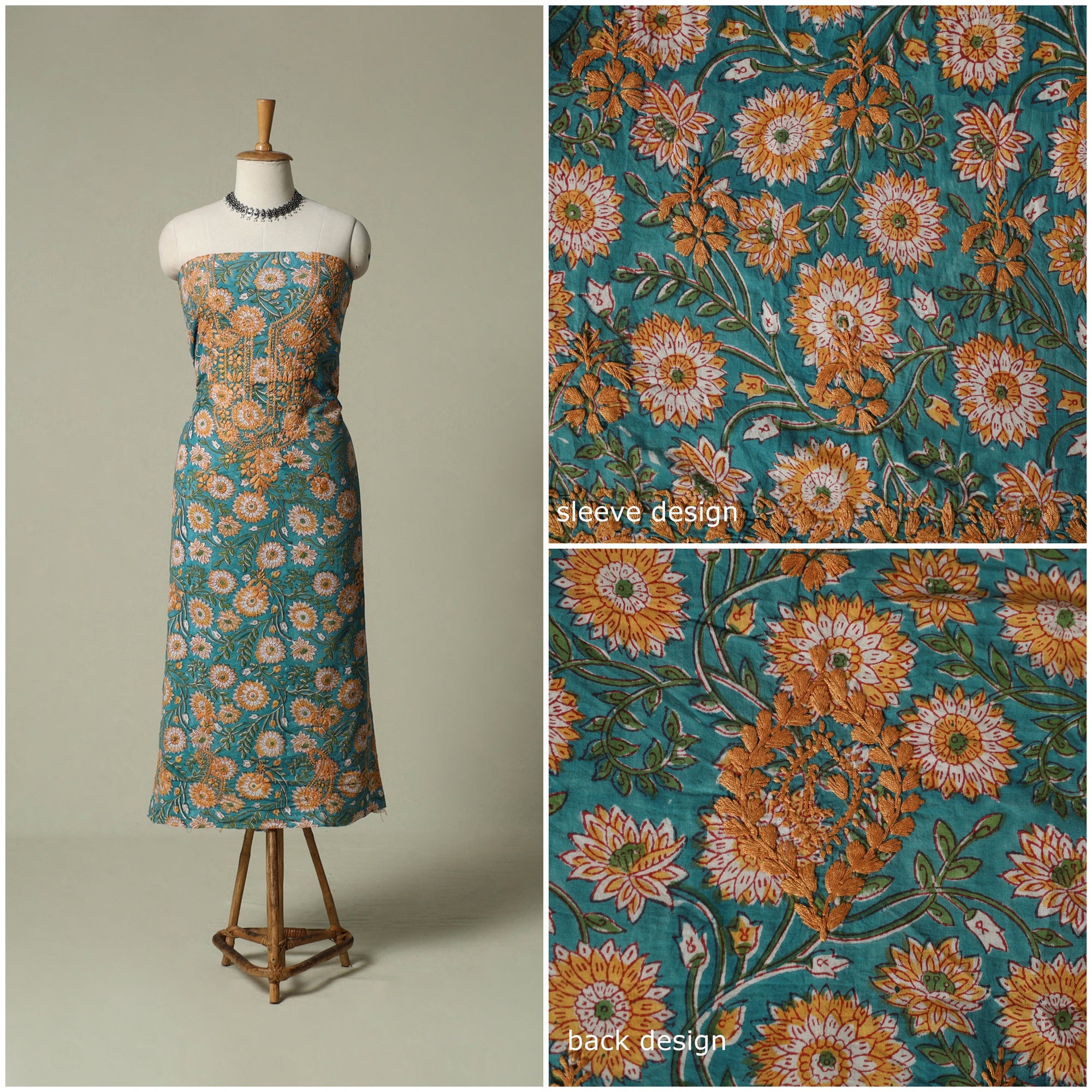 Lucknowi chikankari cotton sanganeri unstitched kurta material beautifully brings together two centuries old crafts delicate chikankari hand embroidery with traditional sanganeri hand block printing. While chikankari involves fine, detailed needlework done by hand, Sanganeri printing uses hand-carved wooden blocks to create intricate floral patterns. Crafted by skilled artisans, it can be tailored to suit your style, making it perfect for both occasions and refined everyday wear.
