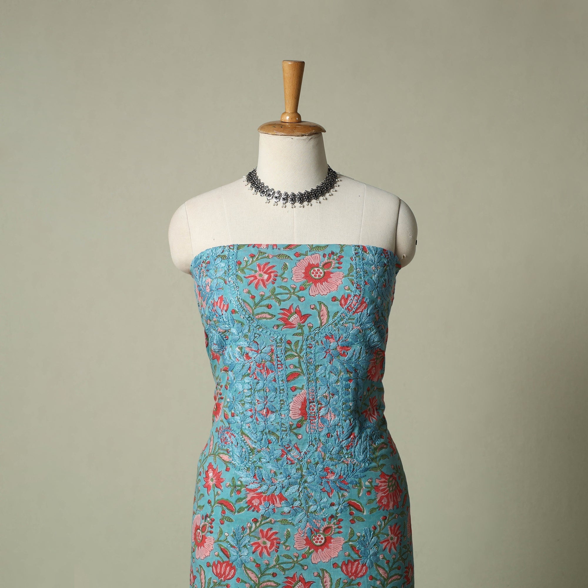 | Material | Lucknowi chikankari cotton sanganeri unstitched kurta material beautifully brings together two centuries old crafts delicate chikankari hand embroidery with traditional sanganeri hand block printing. While chikankari involves fine, detailed needlework done by hand, Sanganeri printing uses hand-carved wooden blocks to create intricate floral patterns. Crafted by skilled artisans, it can be tailored to suit your style, making it perfect for both occasions and refined everyday wear. |
