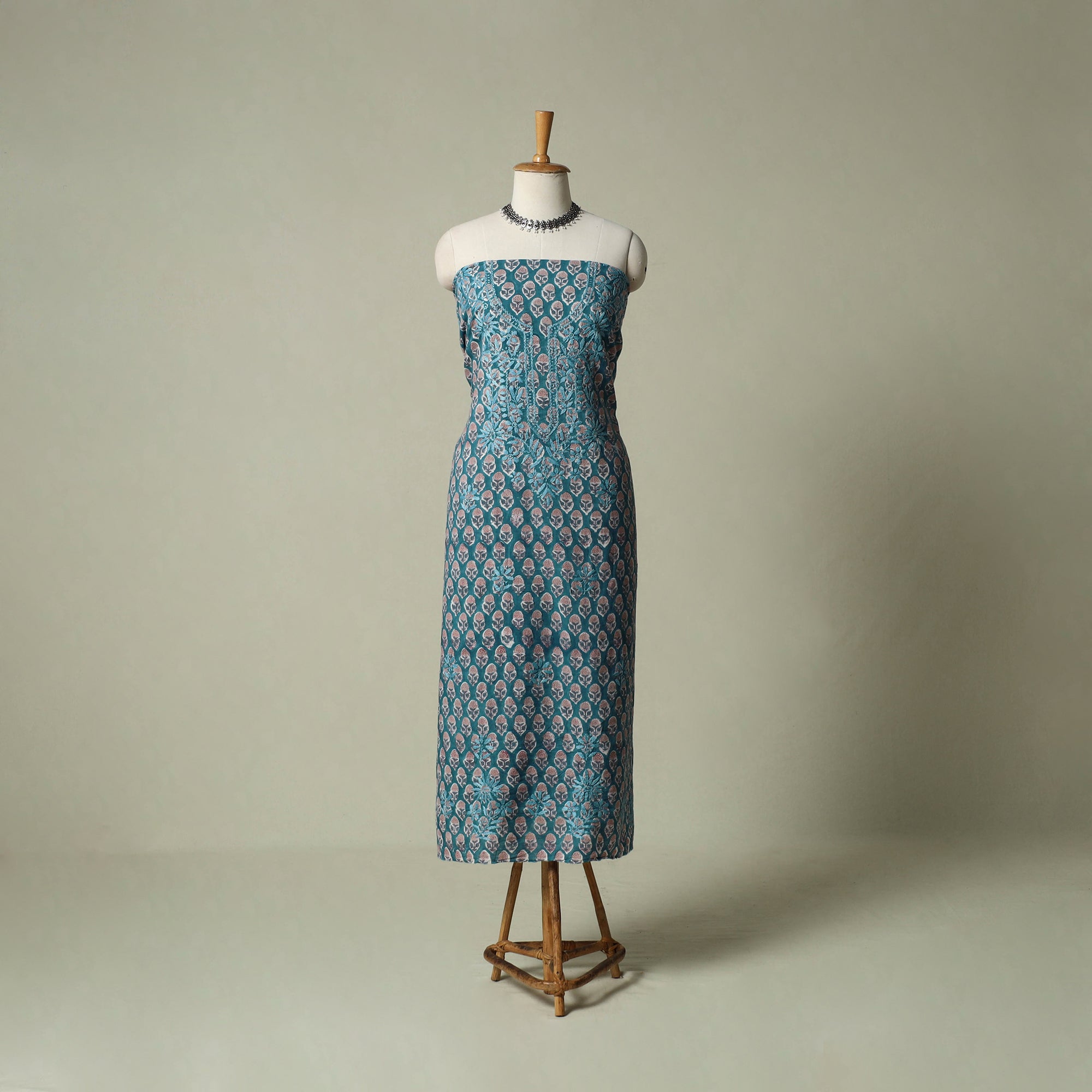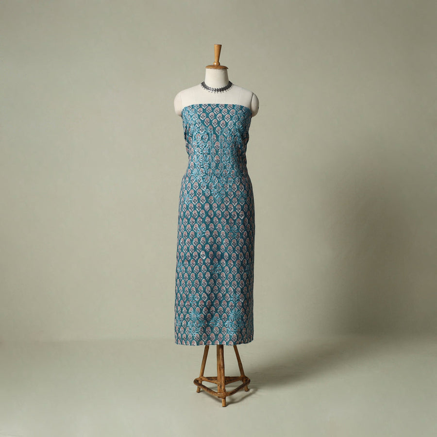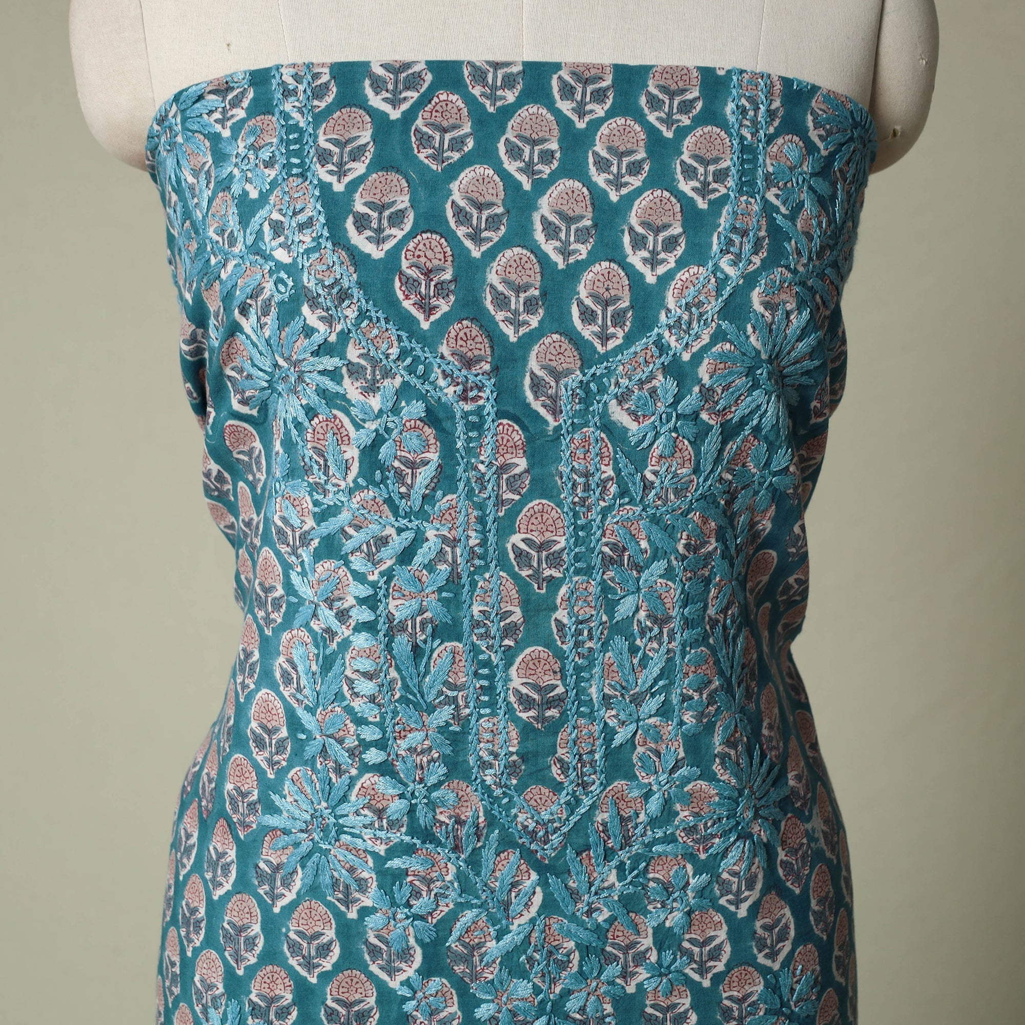 Lucknowi chikankari cotton sanganeri unstitched kurta material beautifully brings together two centuries old crafts delicate chikankari hand embroidery with traditional sanganeri hand block printing. While chikankari involves fine, detailed needlework done by hand, Sanganeri printing uses hand-carved wooden blocks to create intricate floral patterns. Crafted by skilled artisans, it can be tailored to suit your style, making it perfect for both occasions and refined everyday wear.