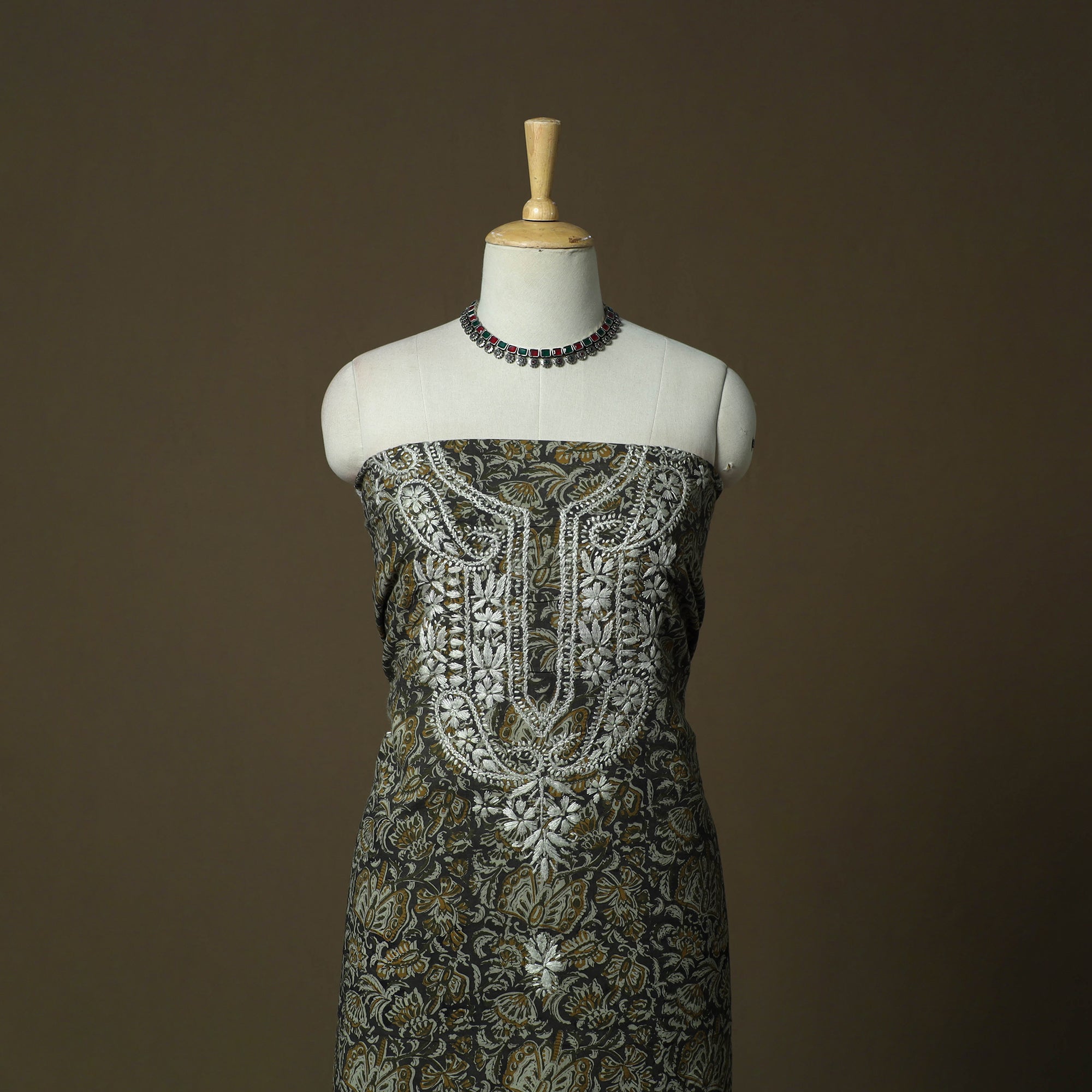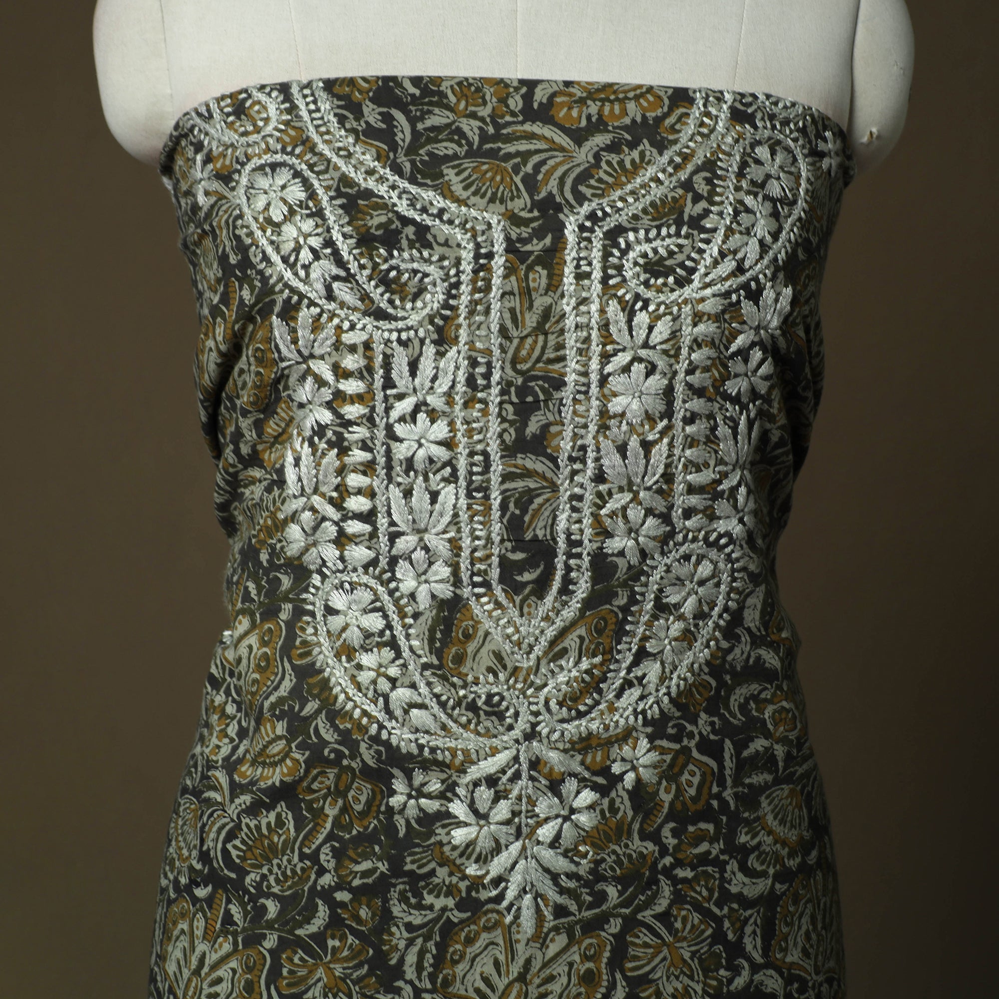 Lucknowi Chikankari Hand Work Bagru Block Print Unstitched Kurta Material (2.5M) 02