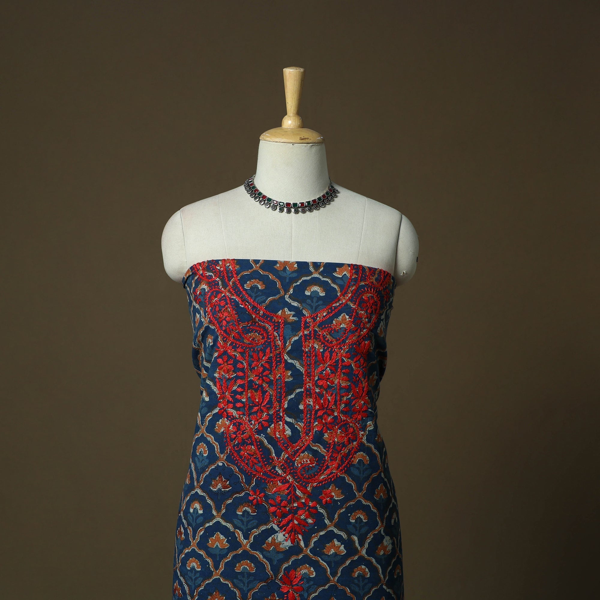 • Lucknowi chikankari hand work bagru block print unstitched