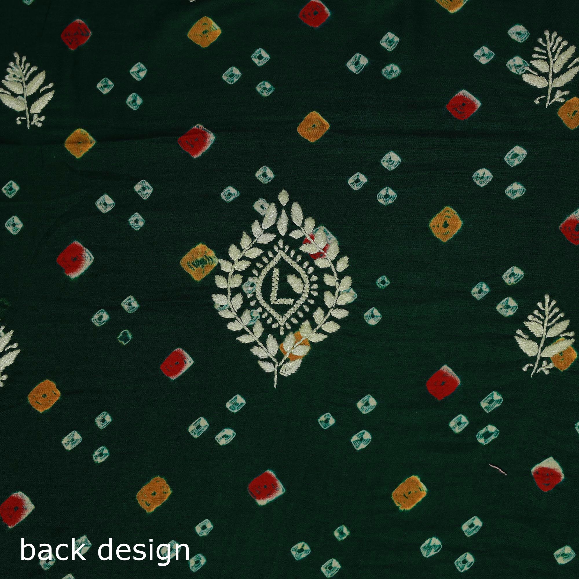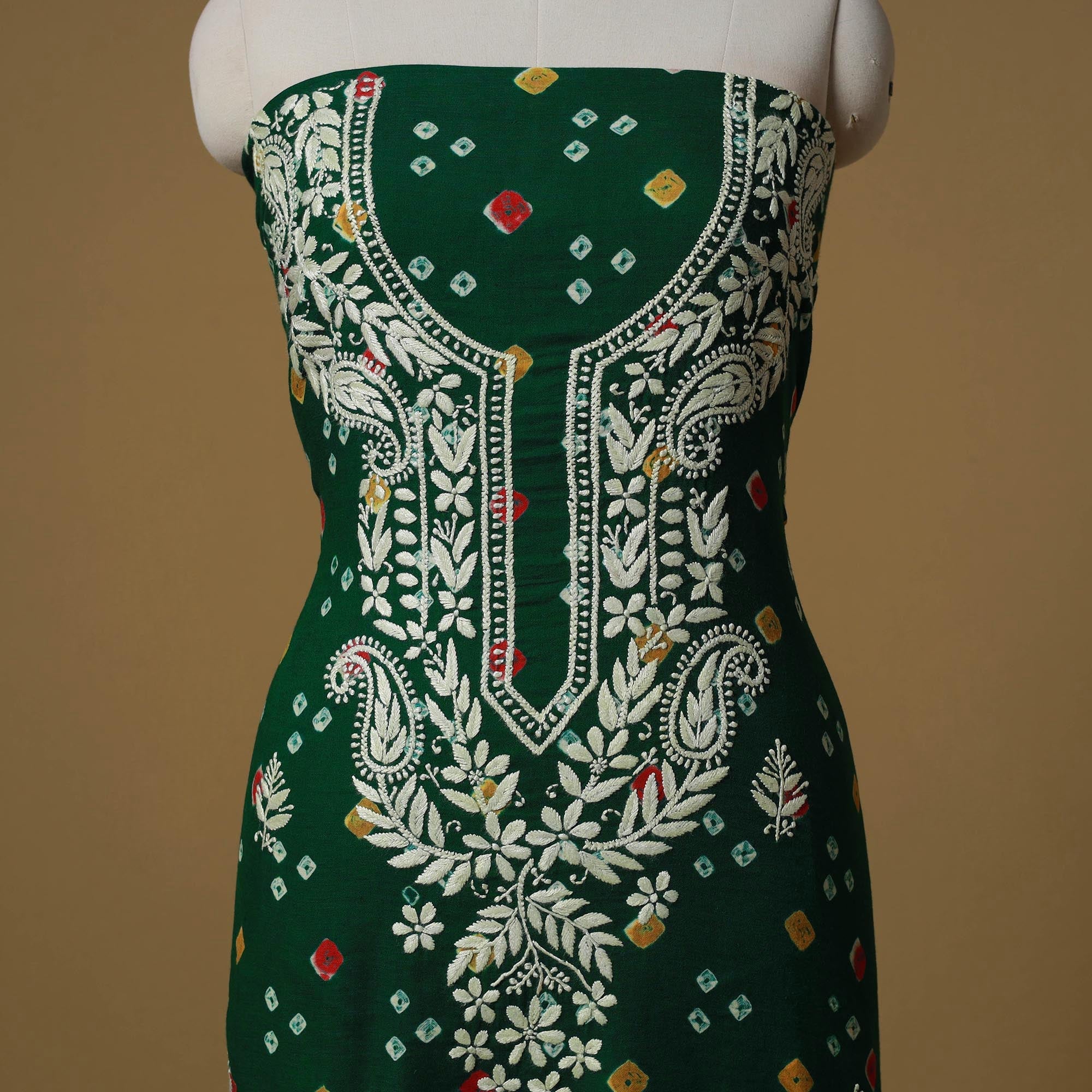 Lucknowi chikankari cotton bandhani unstitched kurta material showcases the elegance of traditional embroidery from Lucknow. Known for its intricate motifs such as florals and jaali, the chikankari work is done using subtle white and pastel threads, with most of the time spent on detailed hand embroidery. This piece beautifully blends fine chikankari embroidery by Lamiya Creation artisans with bandhani tie-dye pattern. It is ideal for gatherings as well as graceful everyday wear.