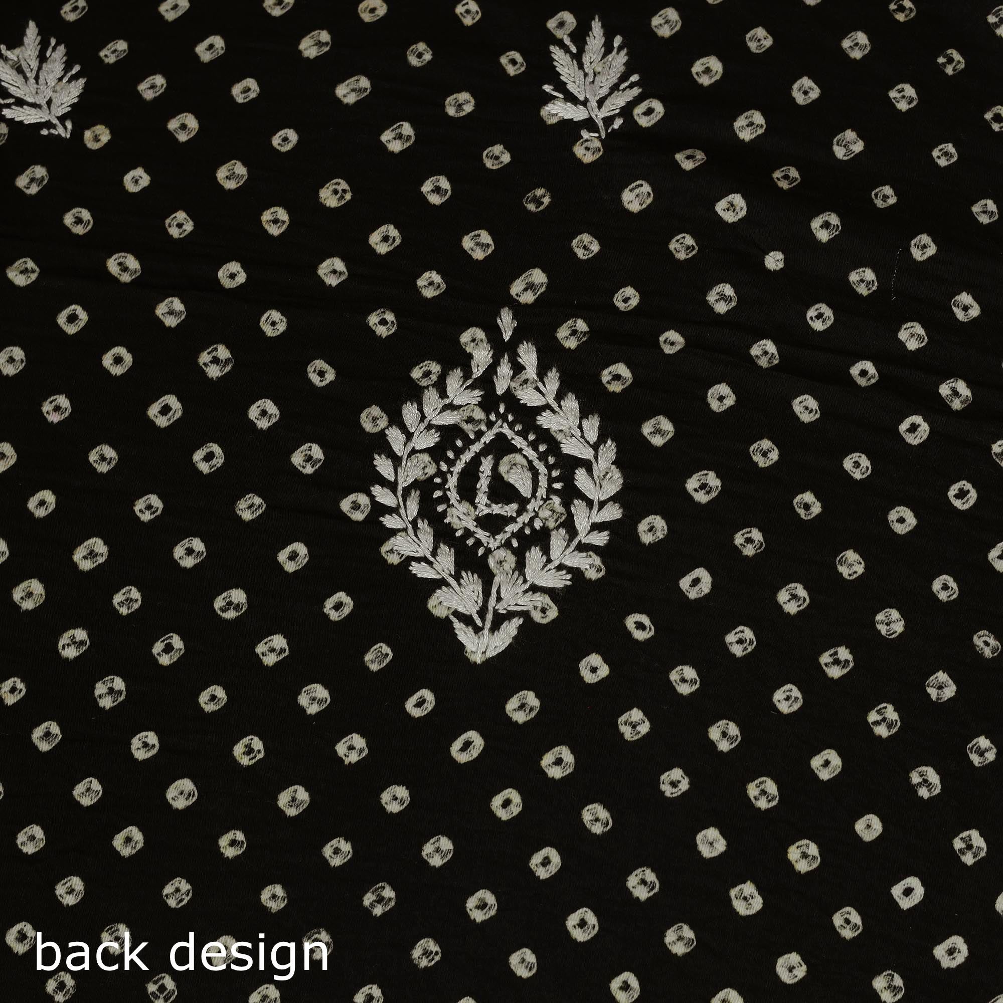 Lucknowi chikankari cotton bandhani unstitched kurta material showcases the elegance of traditional embroidery from Lucknow. Known for its intricate motifs such as florals and jaali, the chikankari work is done using subtle white and pastel threads, with most of the time spent on detailed hand embroidery. This piece beautifully blends fine chikankari embroidery by Lamiya Creation artisans with bandhani tie-dye pattern. It is ideal for gatherings as well as graceful everyday wear.