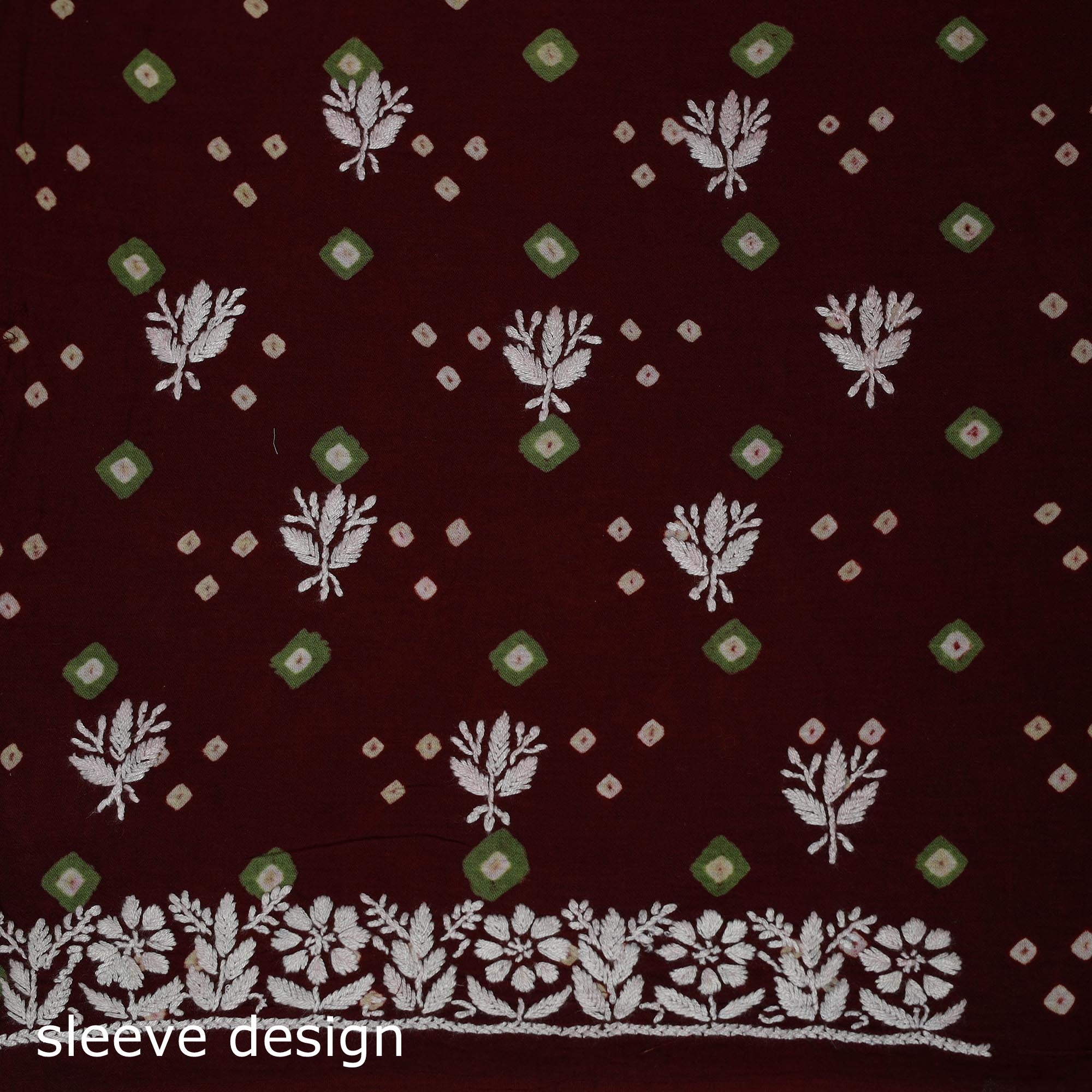 Lucknowi chikankari cotton bandhani unstitched kurta material showcases the elegance of traditional embroidery from Lucknow. Known for its intricate motifs such as florals and jaali, the chikankari work is done using subtle white and pastel threads, with most of the time spent on detailed hand embroidery. This piece beautifully blends fine chikankari embroidery by Lamiya Creation artisans with bandhani tie-dye pattern. It is ideal for gatherings as well as graceful everyday wear.
