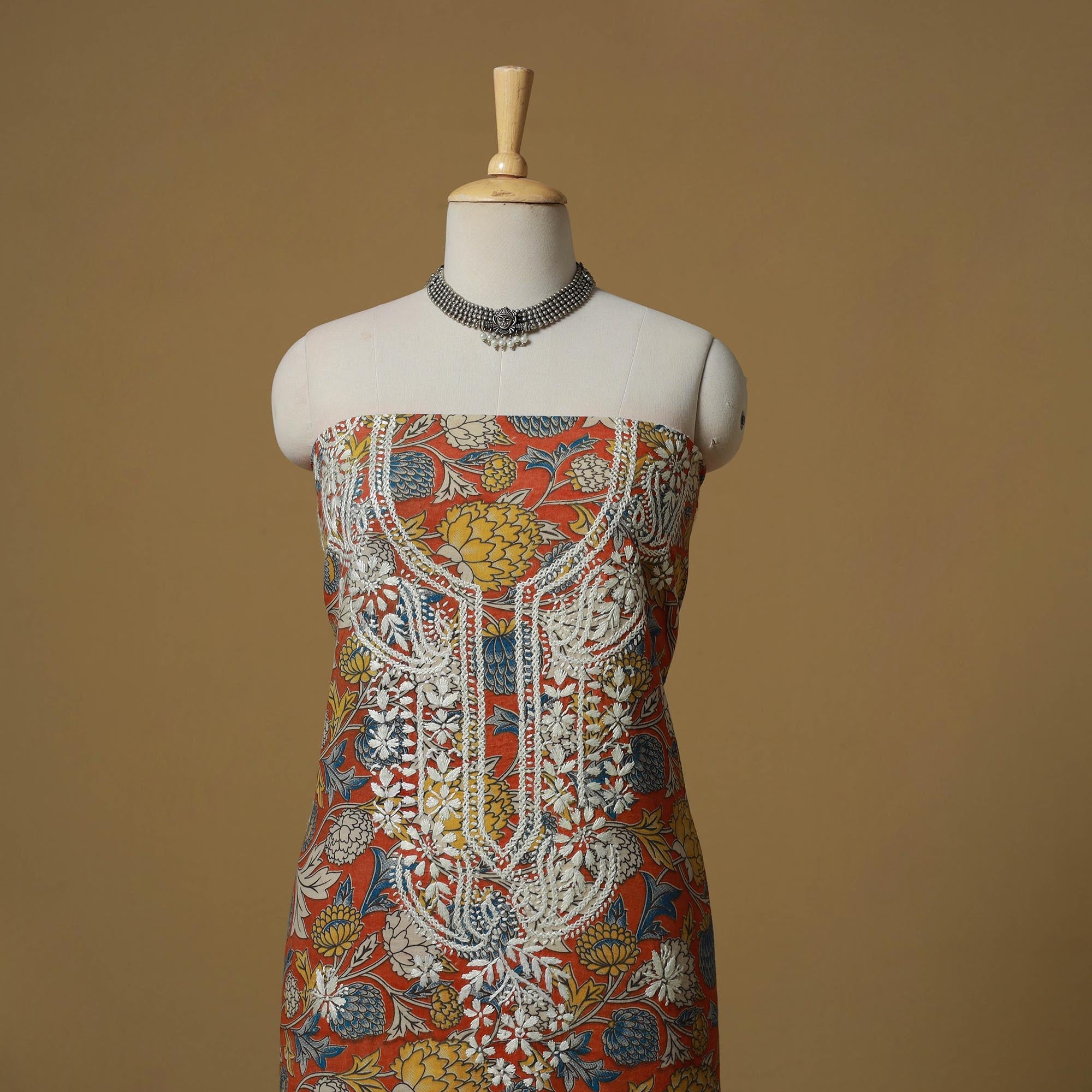 Lucknowi chikankari cotton kalamkari unstitched kurta material showcases the elegance of traditional embroidery from Lucknow. Known for its intricate motifs such as florals and jaali, the chikankari work is done using subtle white and pastel threads, with most of the time spent on detailed hand embroidery. This piece beautifully blends fine chikankari embroidery by Lamiya Creation artisans with intricate kalamkari screen printing. It is ideal for festive gatherings as well as graceful everyday wear.