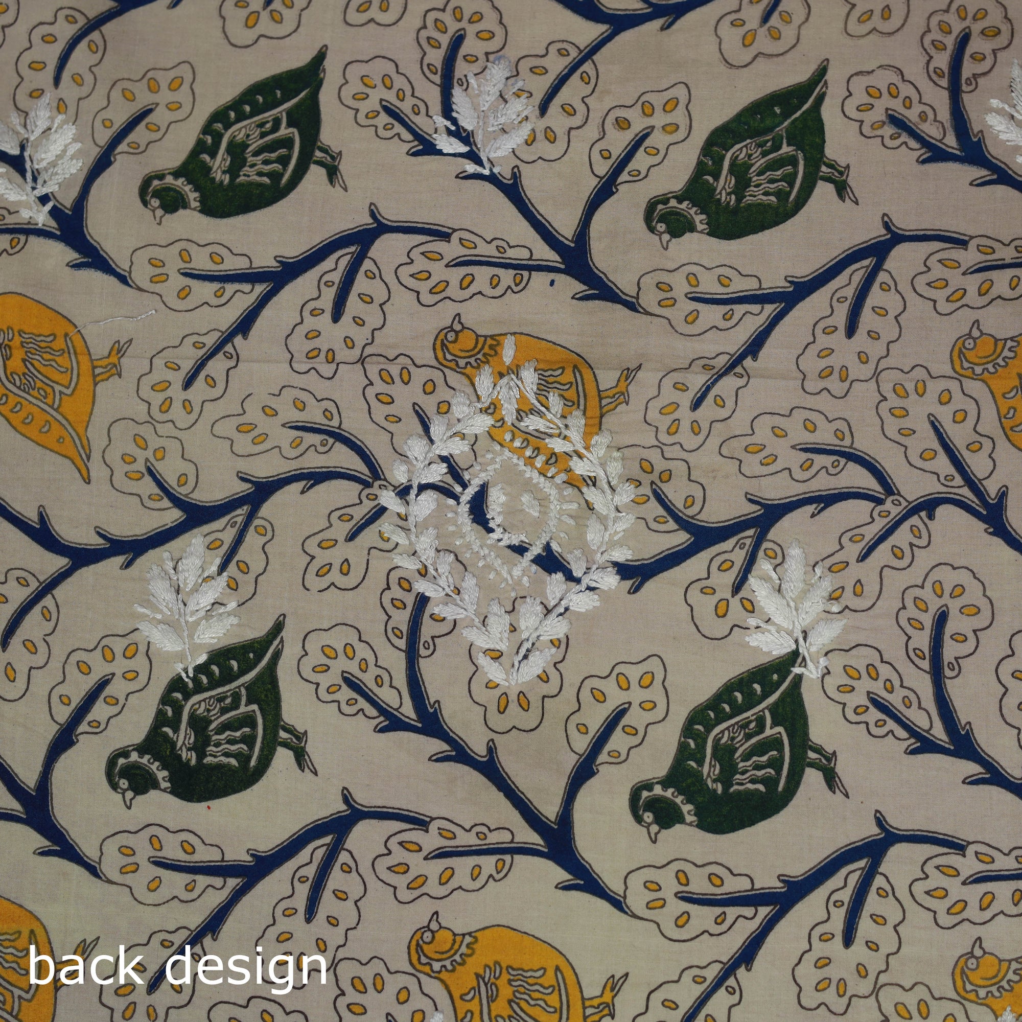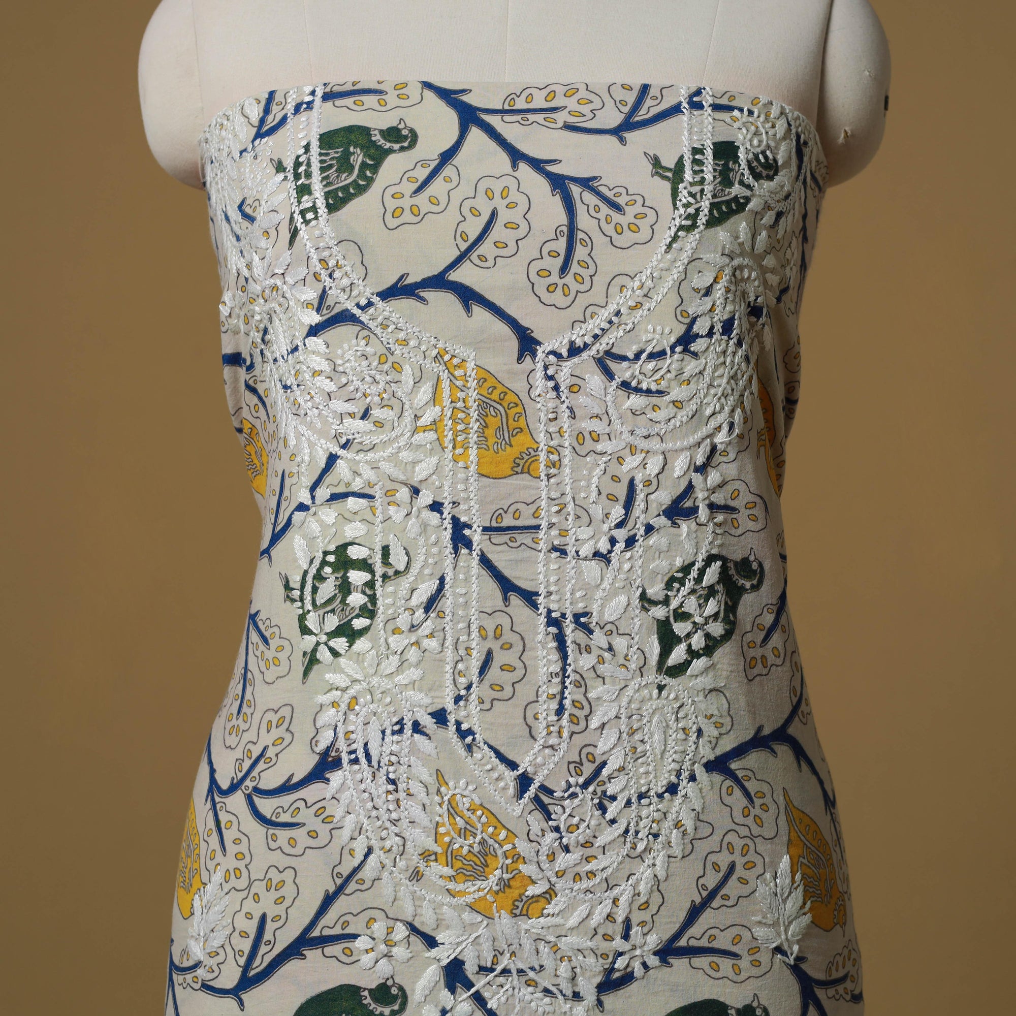 Lucknowi chikankari cotton kalamkari unstitched kurta material showcases the elegance of traditional embroidery from Lucknow. Known for its intricate motifs such as florals and jaali, the chikankari work is done using subtle white and pastel threads, with most of the time spent on detailed hand embroidery. This piece beautifully blends fine chikankari embroidery by Lamiya Creation artisans with intricate kalamkari screen printing. It is ideal for festive gatherings as well as graceful everyday wear.