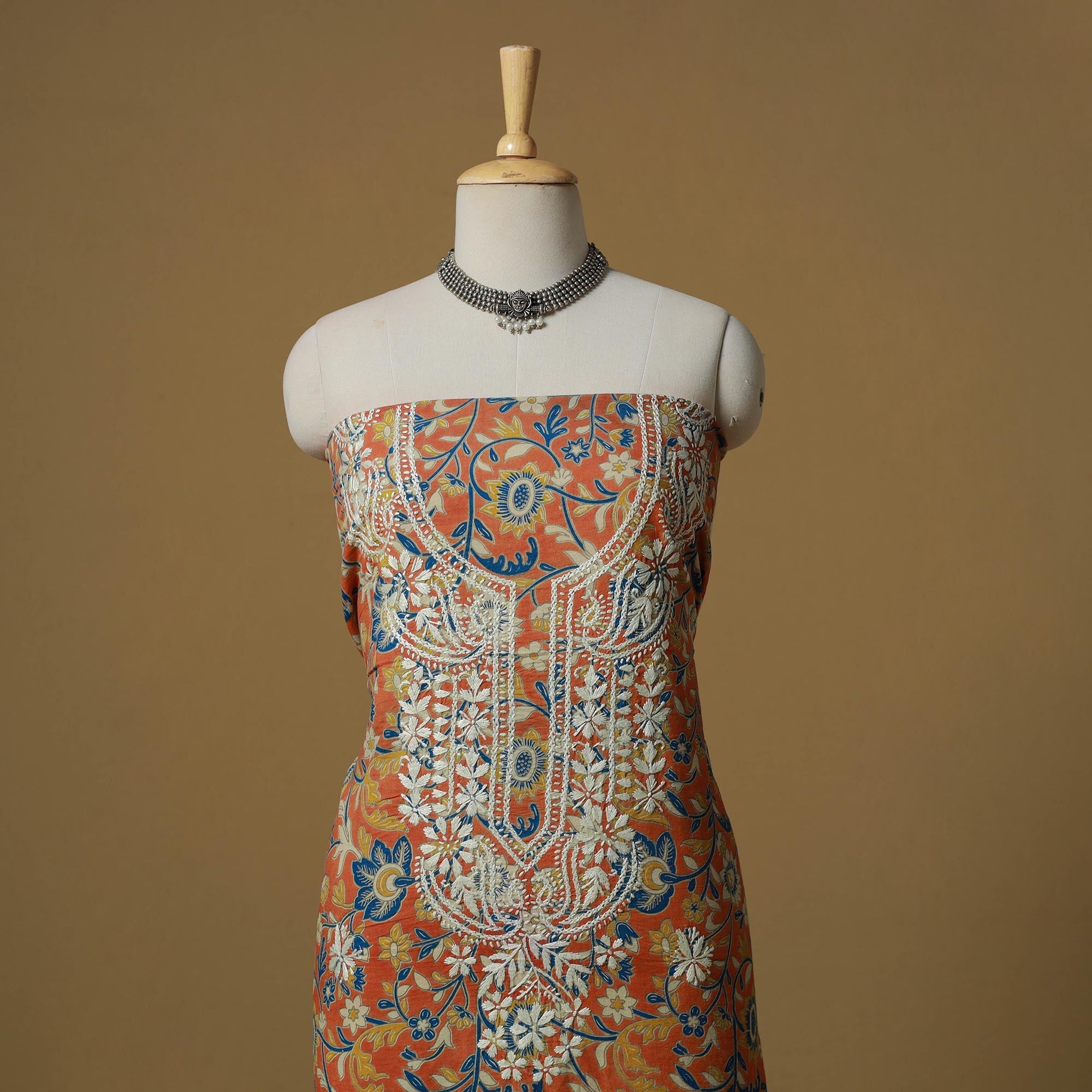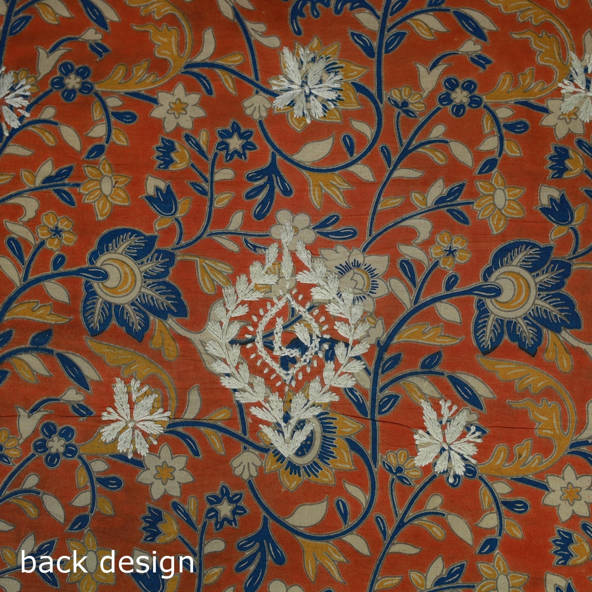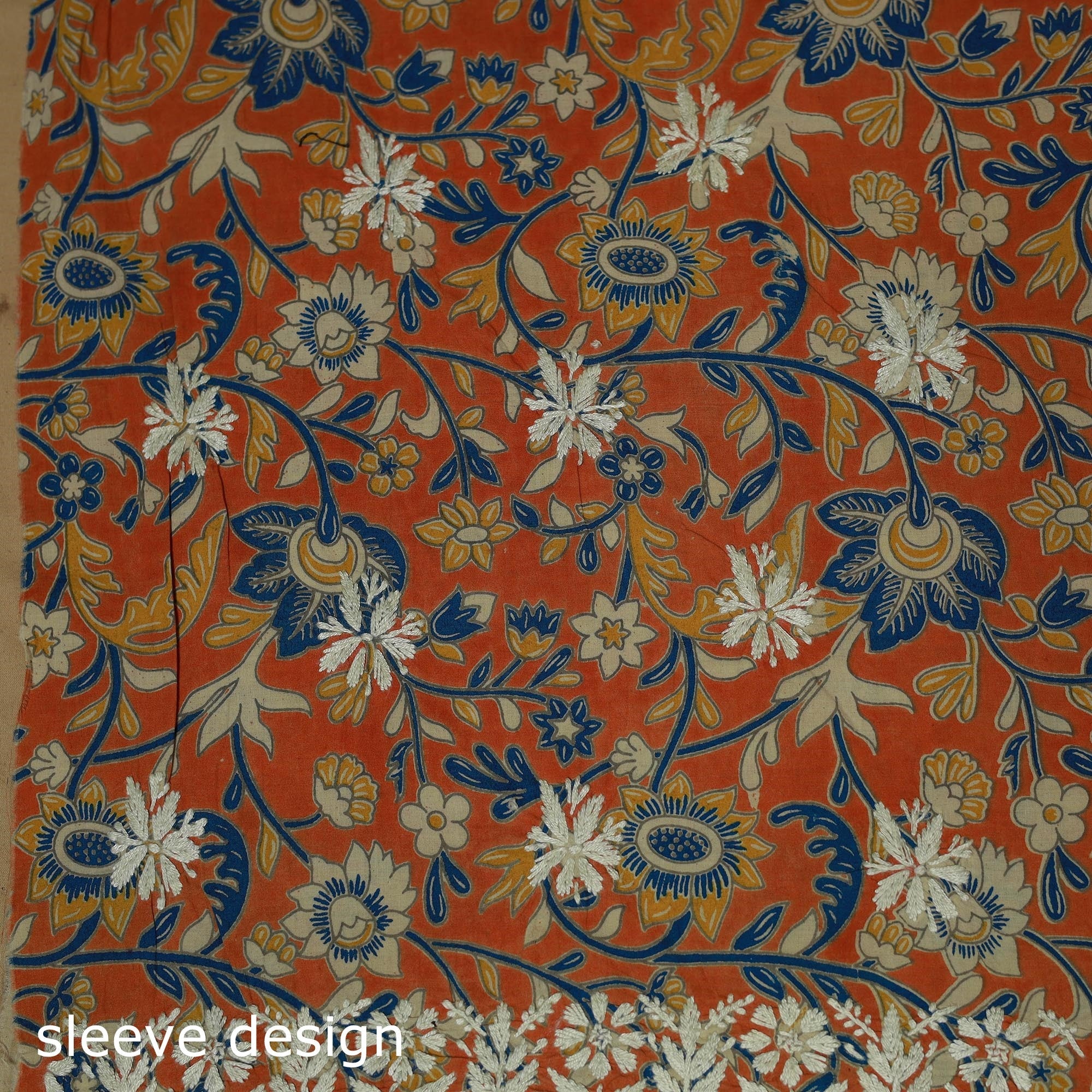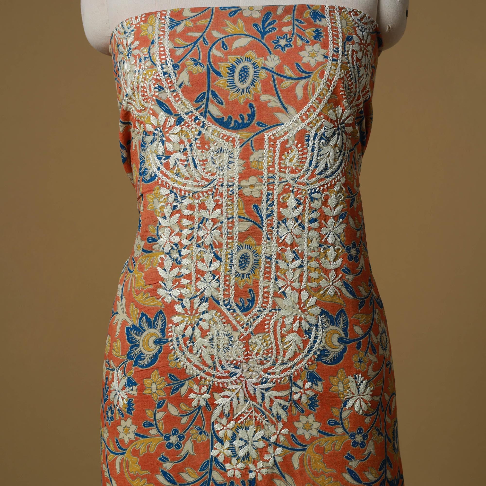Lucknowi chikankari cotton kalamkari unstitched kurta material showcases the elegance of traditional embroidery from Lucknow. Known for its intricate motifs such as florals and jaali, the chikankari work is done using subtle white and pastel threads, with most of the time spent on detailed hand embroidery. This piece beautifully blends fine chikankari embroidery by Lamiya Creation artisans with intricate kalamkari screen printing. It is ideal for festive gatherings as well as graceful everyday wear.