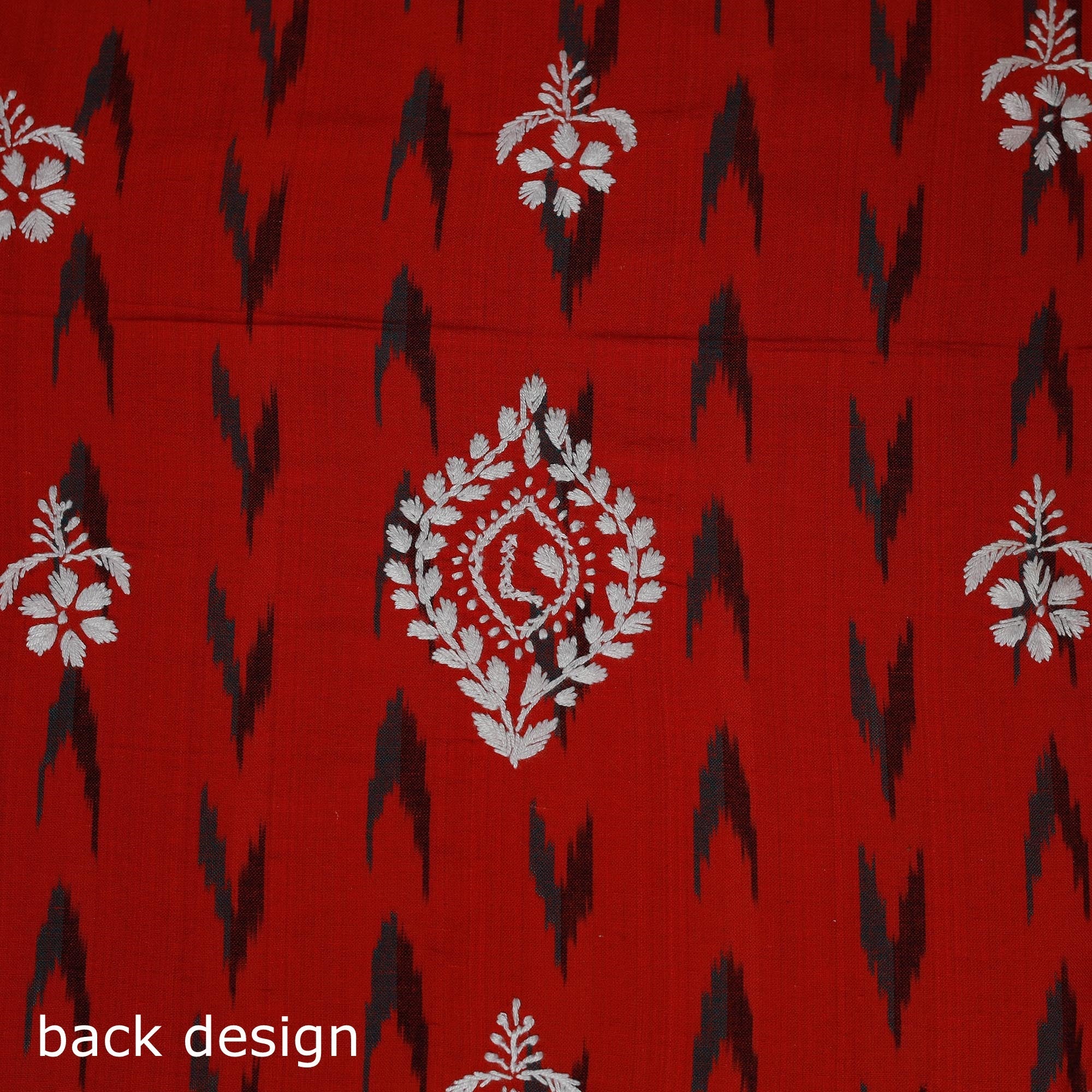 Lucknowi chikankari cotton pochampally ikat unstitched kurta material showcases the elegance of traditional embroidery from Lucknow. Known for its intricate motifs such as florals and jaali, the chikankari work is done using subtle white and pastel threads, with most of the time spent on detailed hand embroidery. This piece beautifully blends fine chikankari embroidery by Lamiya Creation artisans with pochampally ikat weaving. It is ideal for festive gatherings as well as graceful everyday wear.