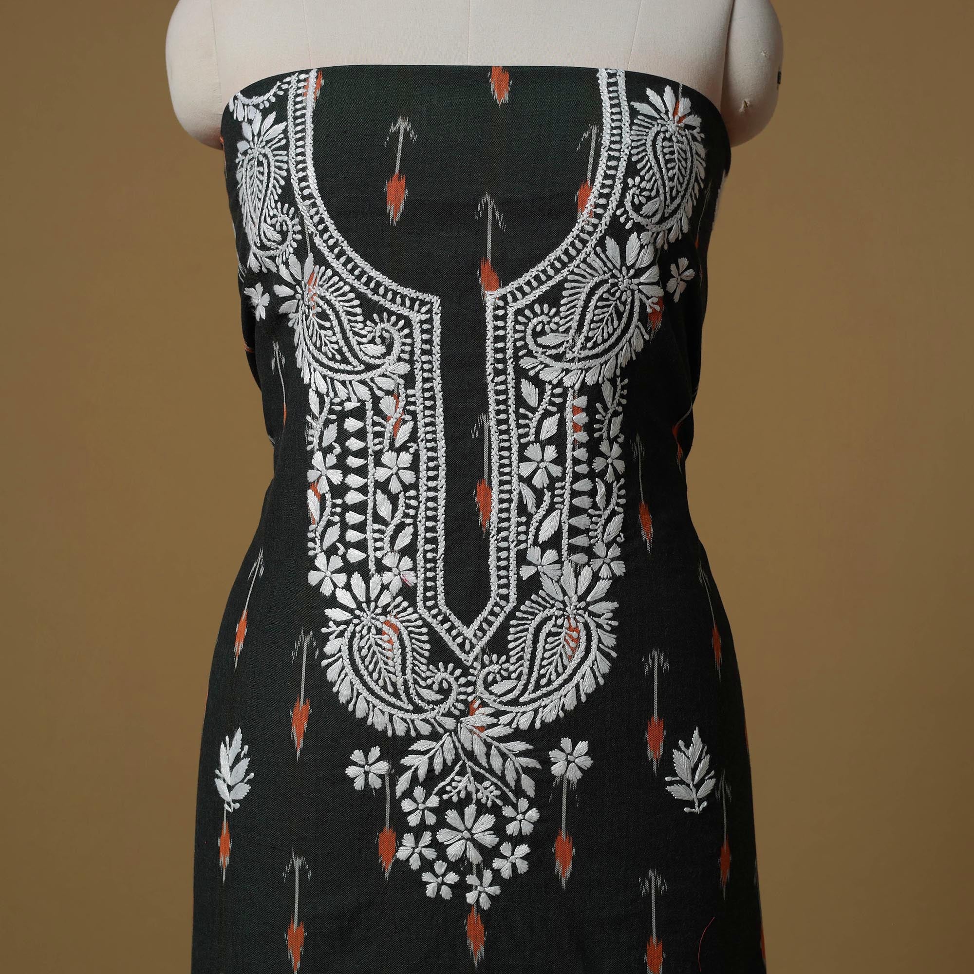 Lucknowi chikankari cotton pochampally ikat unstitched kurta material showcases the elegance of traditional embroidery from Lucknow. Known for its intricate motifs such as florals and jaali, the chikankari work is done using subtle white and pastel threads, with most of the time spent on detailed hand embroidery. This piece beautifully blends fine chikankari embroidery by Lamiya Creation artisans with pochampally ikat weaving. It is ideal for festive gatherings as well as graceful everyday wear.