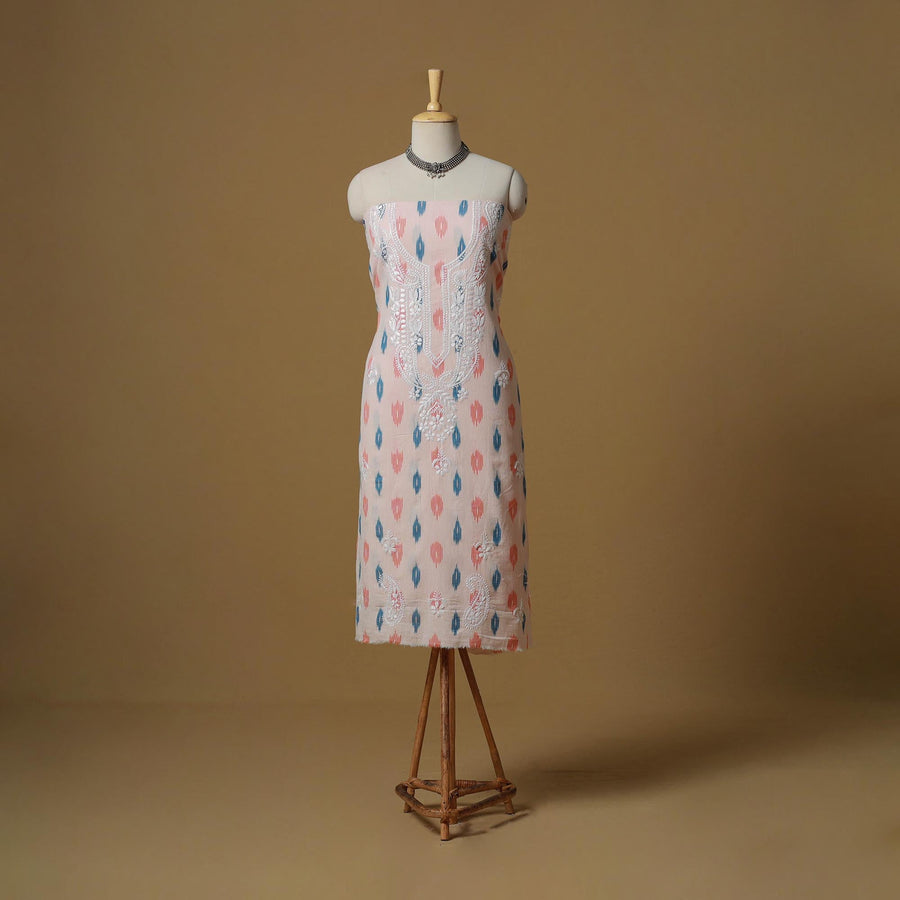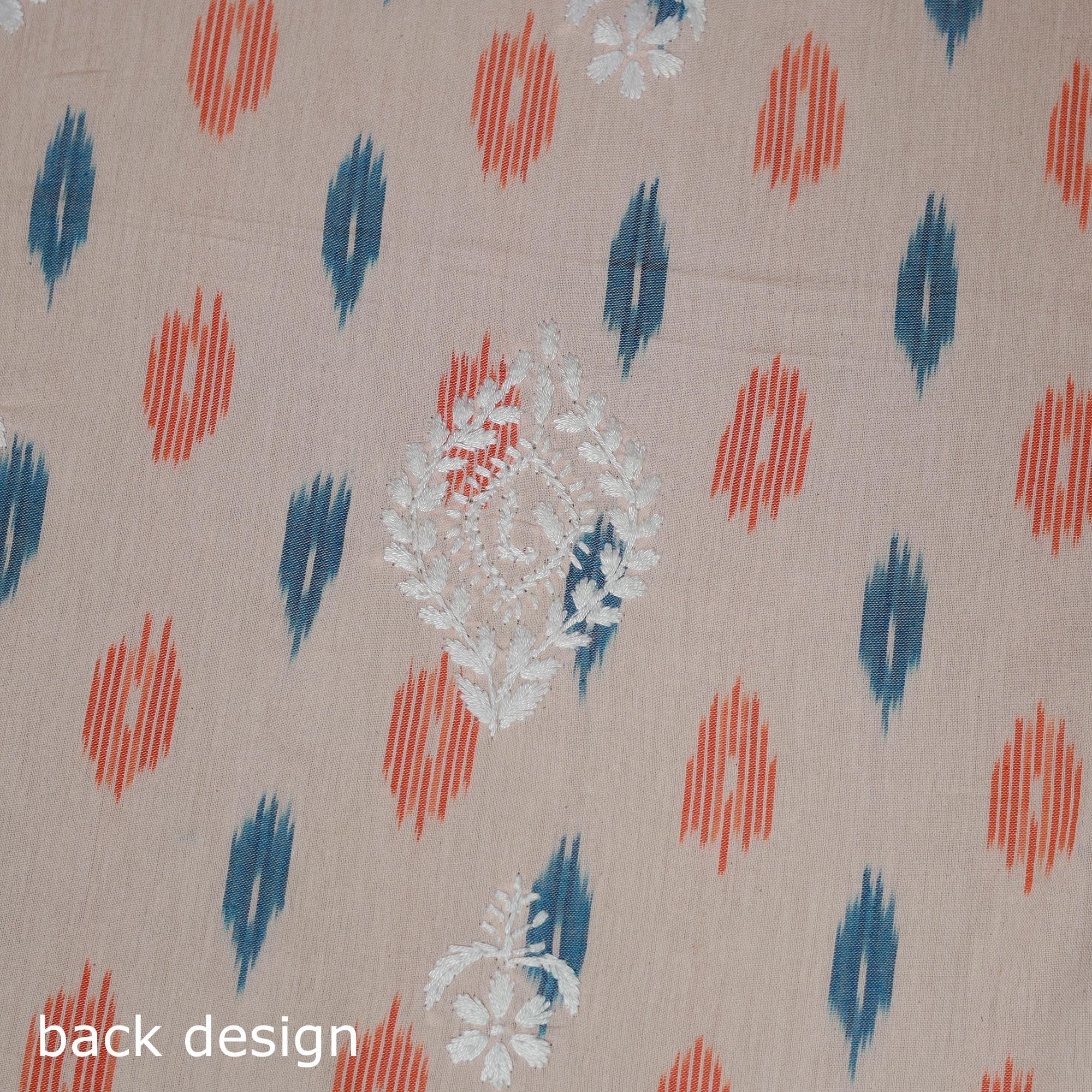 Lucknowi chikankari cotton pochampally ikat unstitched kurta material showcases the elegance of traditional embroidery from Lucknow. Known for its intricate motifs such as florals and jaali, the chikankari work is done using subtle white and pastel threads, with most of the time spent on detailed hand embroidery. This piece beautifully blends fine chikankari embroidery by Lamiya Creation artisans with pochampally ikat weaving. It is ideal for festive gatherings as well as graceful everyday wear.