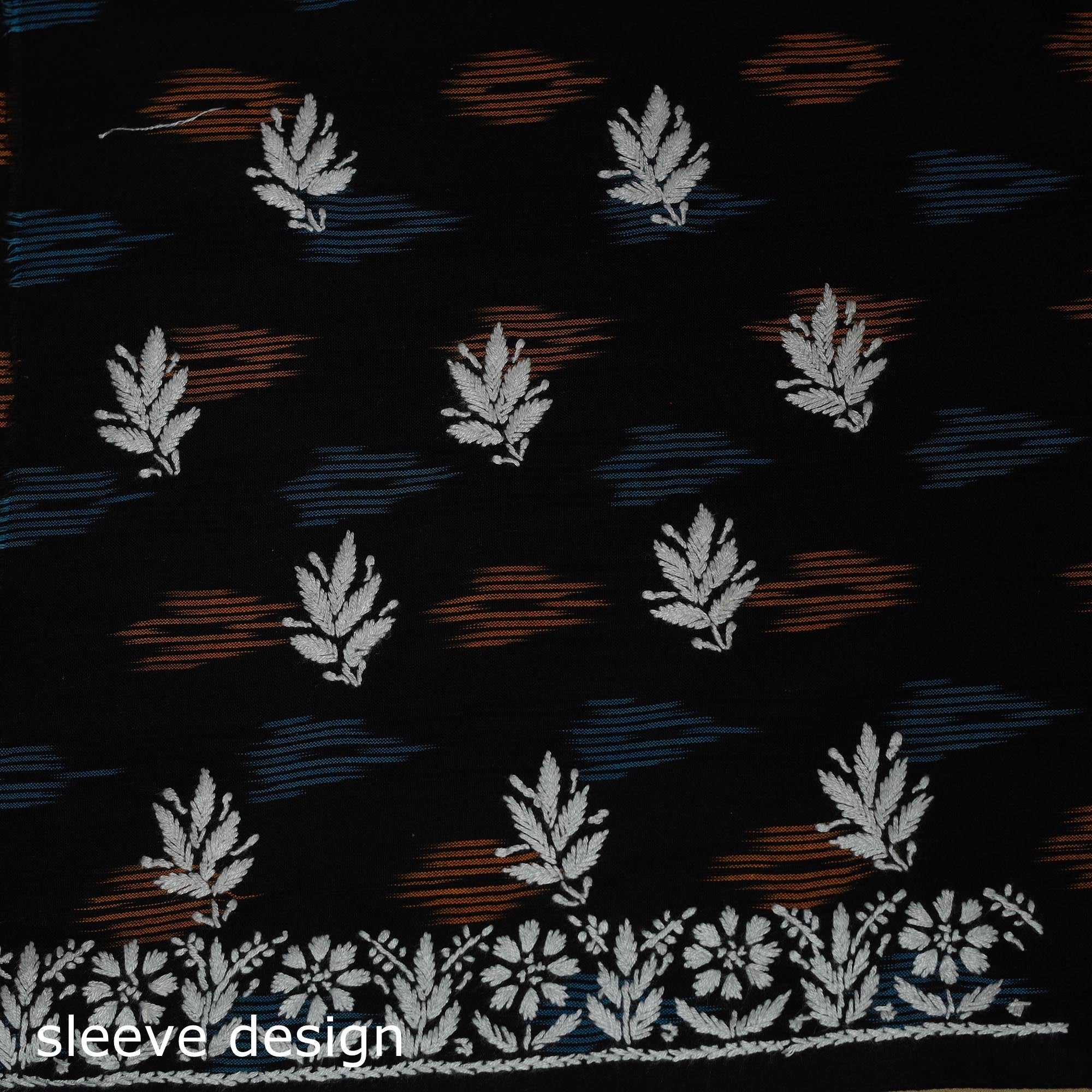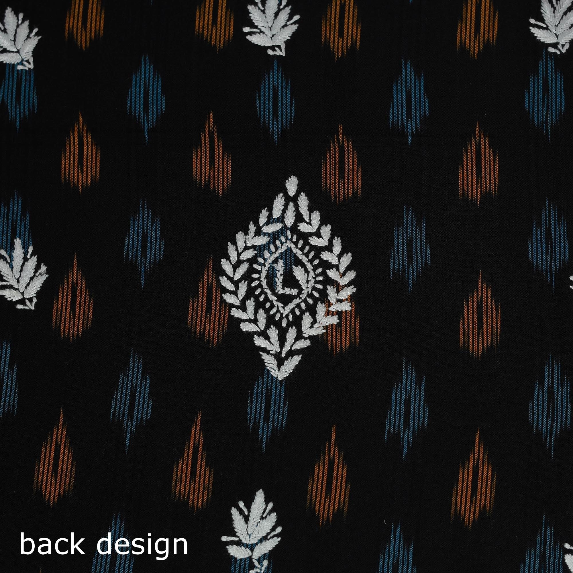Lucknowi chikankari cotton pochampally ikat unstitched kurta material showcases the elegance of traditional embroidery from Lucknow. Known for its intricate motifs such as florals and jaali, the chikankari work is done using subtle white and pastel threads, with most of the time spent on detailed hand embroidery. This piece beautifully blends fine chikankari embroidery by Lamiya Creation artisans with pochampally ikat weaving. It is ideal for festive gatherings as well as graceful everyday wear.