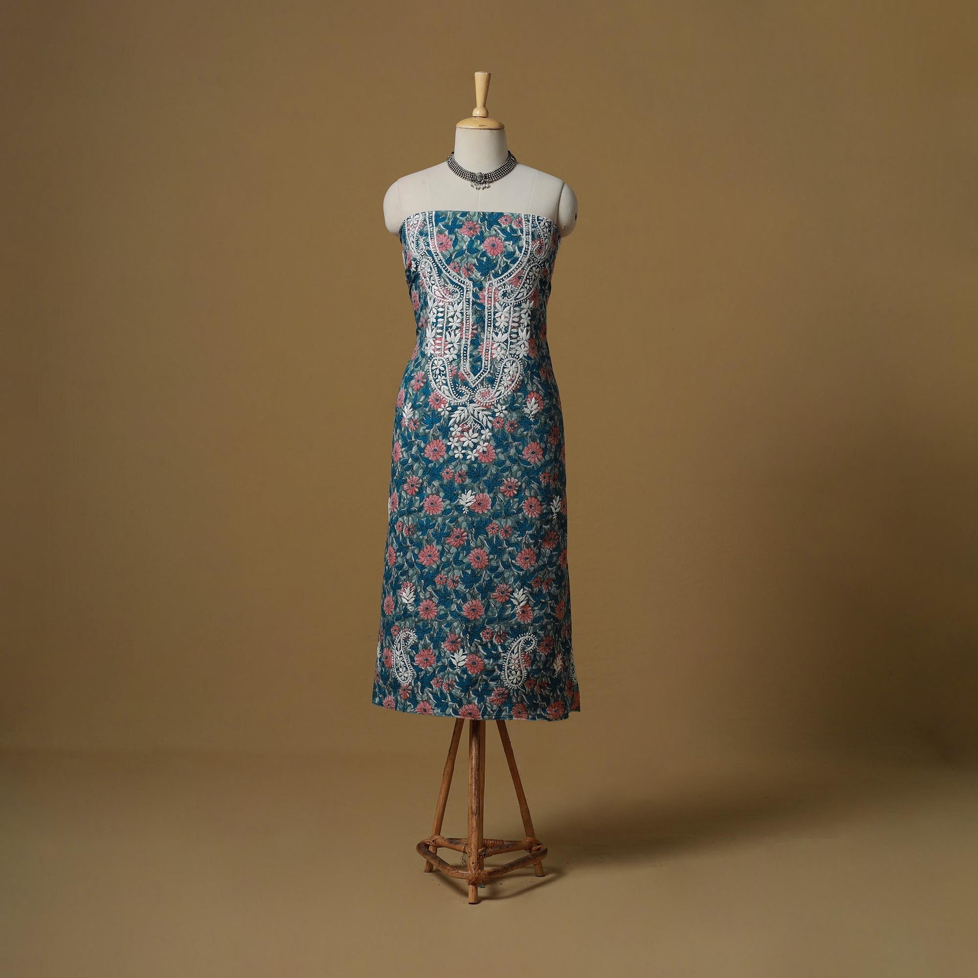 Lucknowi chikankari cotton sanganeri unstitched kurta material showcases the elegance of traditional embroidery from Lucknow. Known for its intricate motifs such as florals and jaali, the chikankari work is done using subtle white and pastel threads, with most of the time spent on detailed hand embroidery. This piece beautifully blends fine chikankari embroidery by Lamiya Creation artisans with delicate Sanganeri block prints. It is ideal for festive gatherings as well as graceful everyday wear.