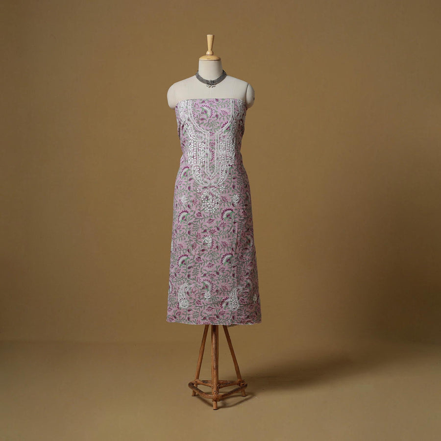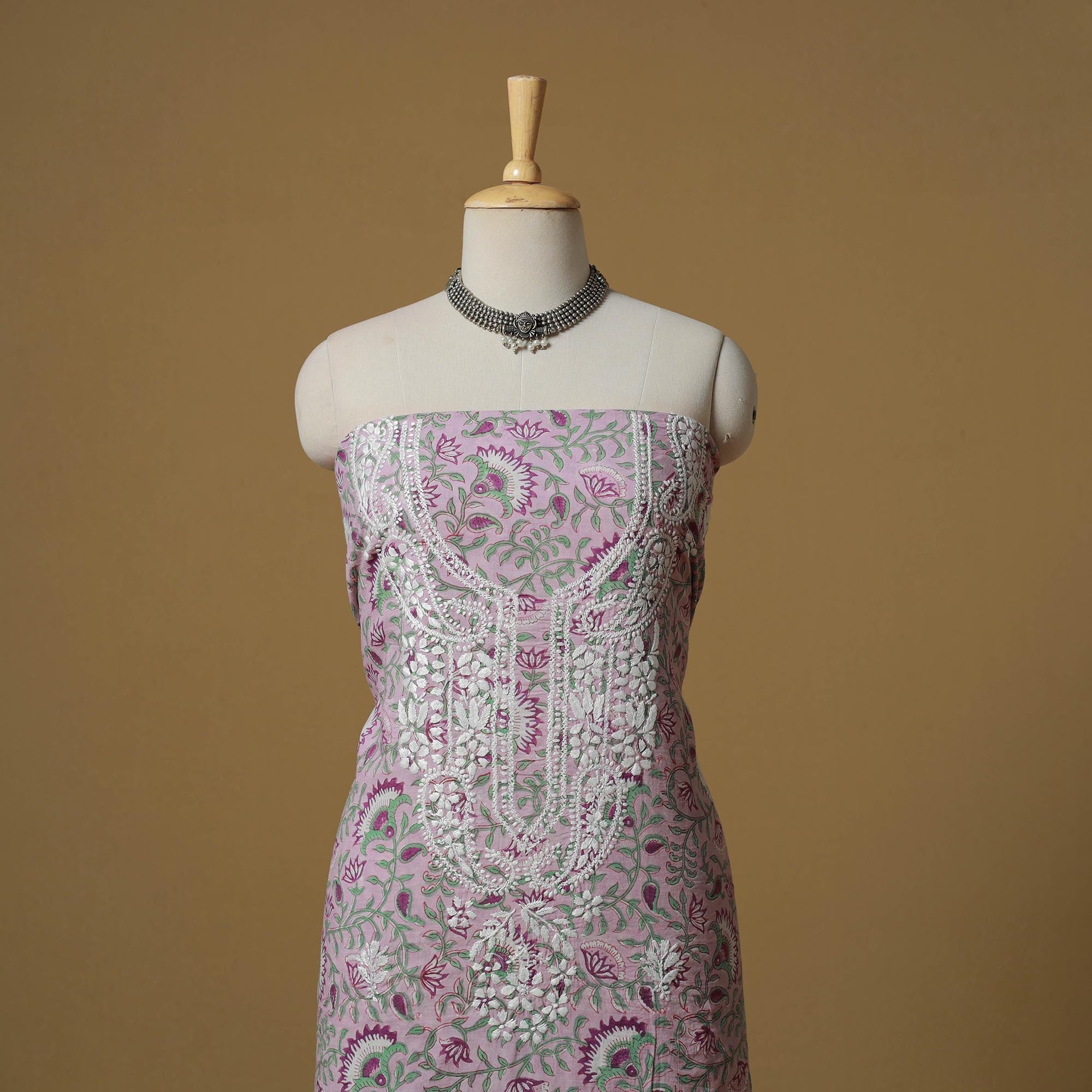 Lucknowi chikankari cotton sanganeri unstitched kurta material showcases the elegance of traditional embroidery from Lucknow. Known for its intricate motifs such as florals and jaali, the chikankari work is done using subtle white and pastel threads, with most of the time spent on detailed hand embroidery. This piece beautifully blends fine chikankari embroidery by Lamiya Creation artisans with delicate Sanganeri block prints. It is ideal for festive gatherings as well as graceful everyday wear.