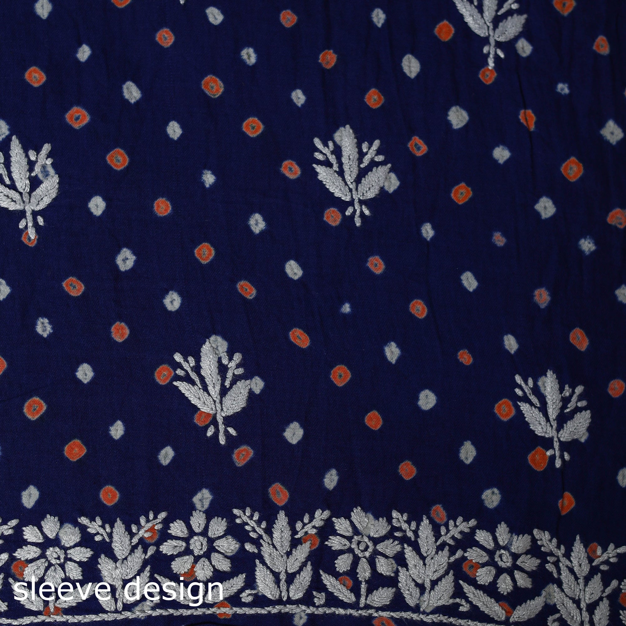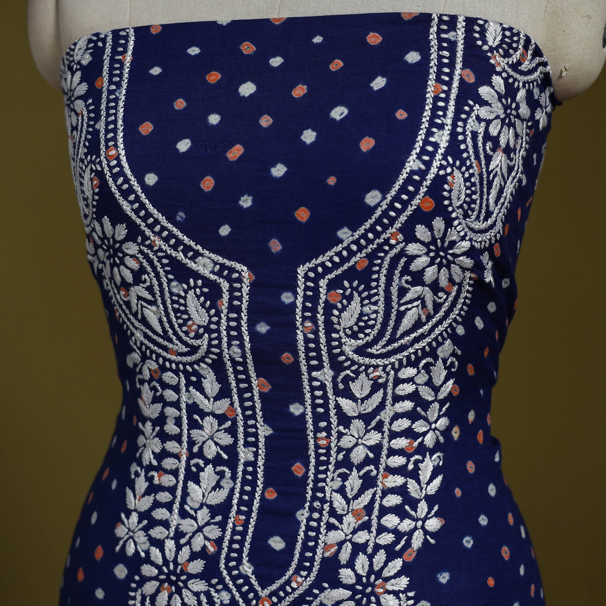 This blue lucknowi chikankari cotton bandhani tie-dye unstitched kurta material combines the refined charm of traditional Chikankari hand embroidery with the lively appeal of Bandhani patterns. The delicate needlework from Lucknow blends effortlessly with the dotted tie-dye design, creating a fabric that feels both graceful and sophisticated. Perfect for festive occasions or elevated everyday wear, it can be tailored to your preferred style for a polished and timeless look.
