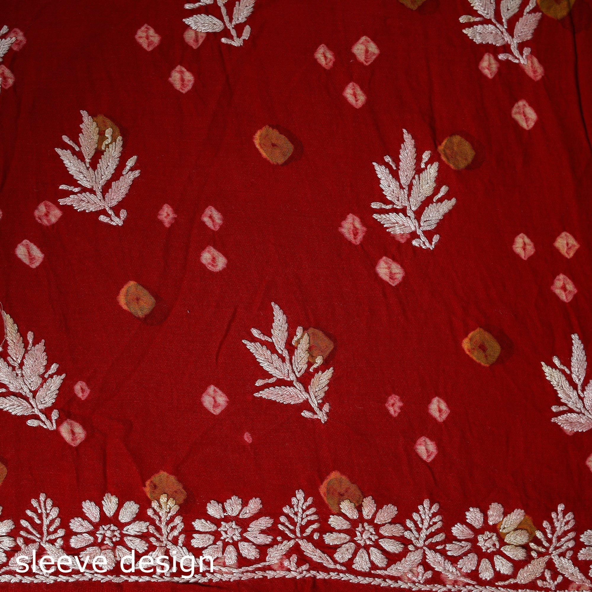 This red lucknowi chikankari cotton bandhani tie-dye unstitched kurta material combines the refined charm of traditional Chikankari hand embroidery with the lively appeal of Bandhani patterns. The delicate needlework from Lucknow blends effortlessly with the dotted tie-dye design, creating a fabric that feels both graceful and sophisticated. Perfect for festive occasions or elevated everyday wear, it can be tailored to your preferred style for a polished and timeless look.