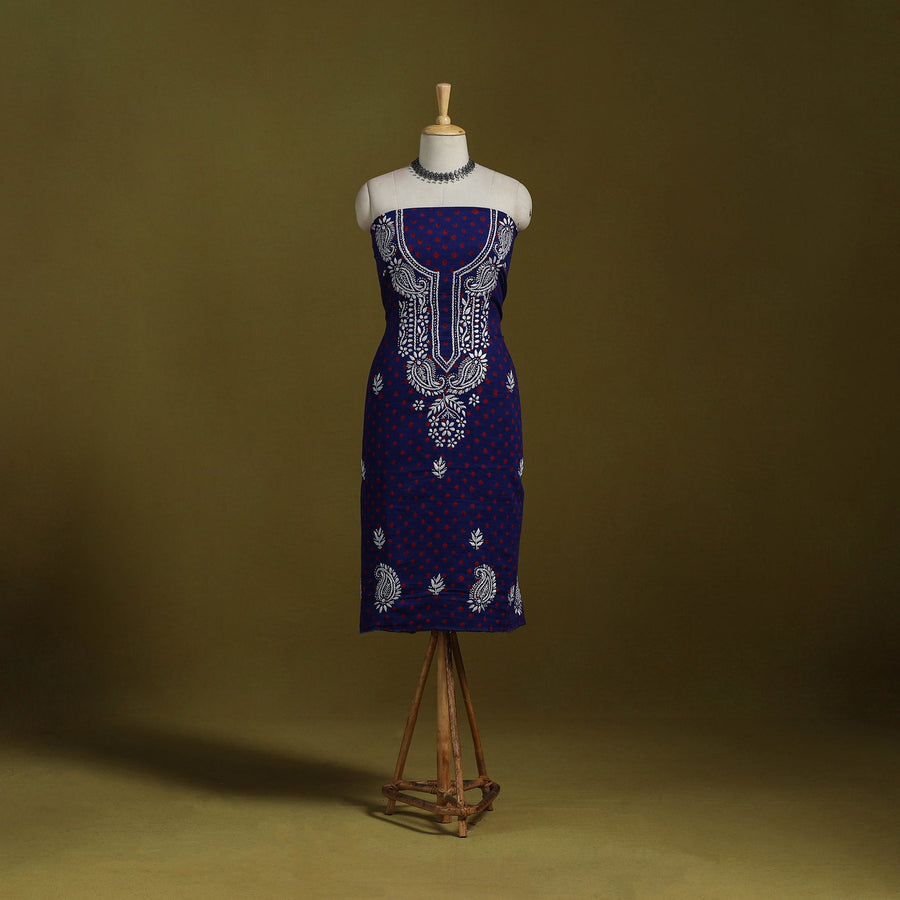 This blue lucknowi chikankari cotton bandhani tie-dye unstitched kurta material combines the refined charm of traditional Chikankari hand embroidery with the lively appeal of Bandhani patterns. The delicate needlework from Lucknow blends effortlessly with the dotted tie-dye design, creating a fabric that feels both graceful and sophisticated. Perfect for festive occasions or elevated everyday wear, it can be tailored to your preferred style for a polished and timeless look.