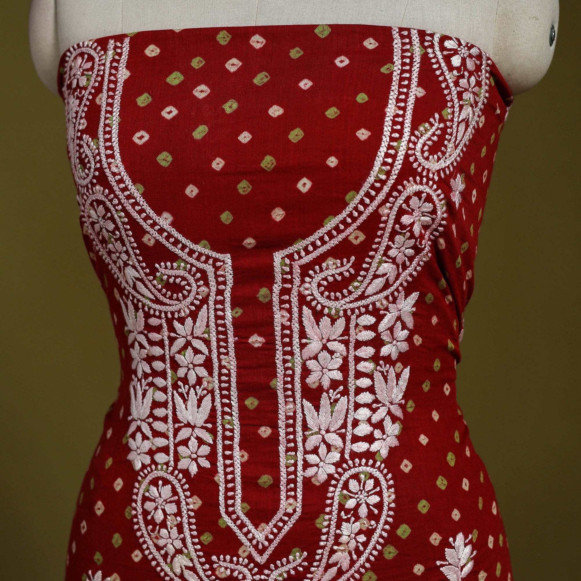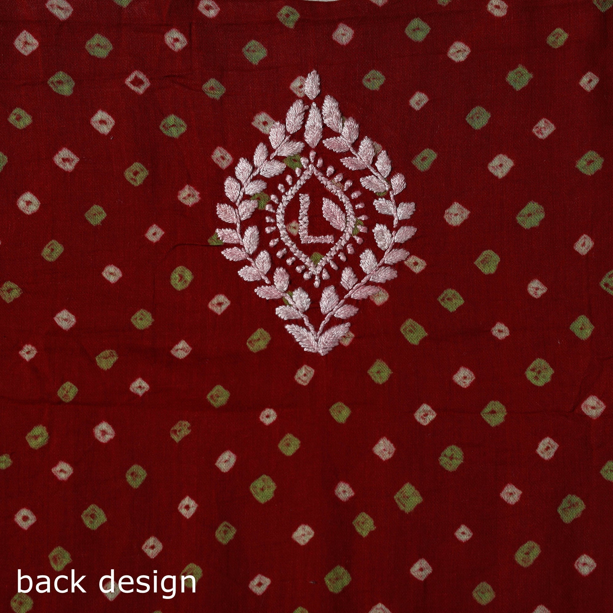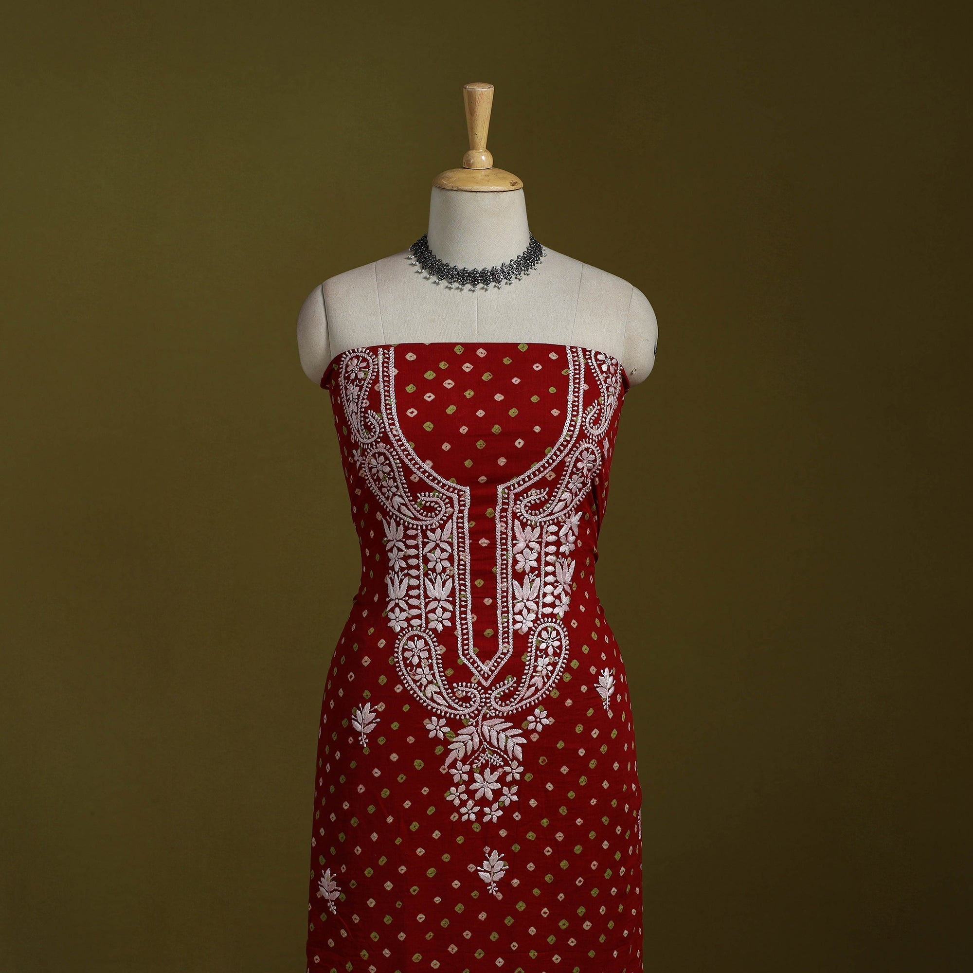 This maroon lucknowi chikankari cotton bandhani tie-dye unstitched kurta material combines the refined charm of traditional Chikankari hand embroidery with the lively appeal of Bandhani patterns. The delicate needlework from Lucknow blends effortlessly with the dotted tie-dye design, creating a fabric that feels both graceful and sophisticated. Perfect for festive occasions or elevated everyday wear, it can be tailored to your preferred style for a polished and timeless look.