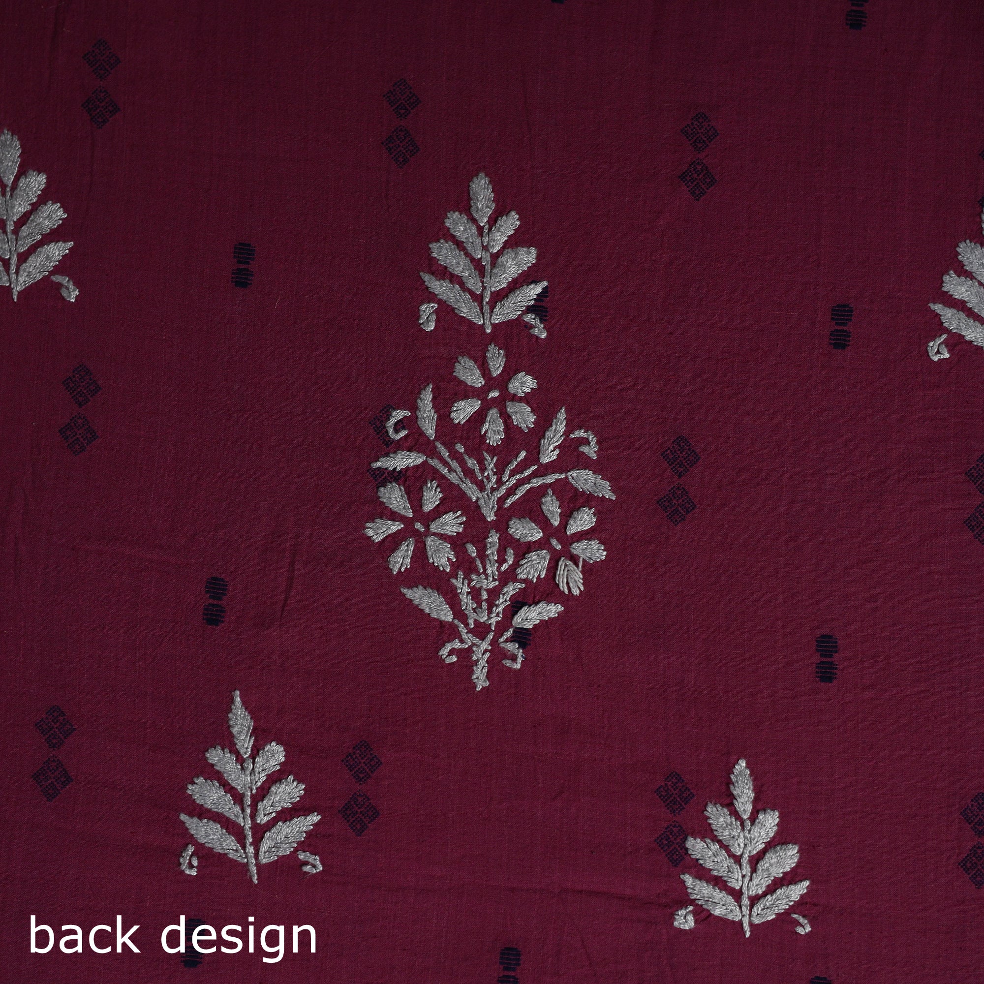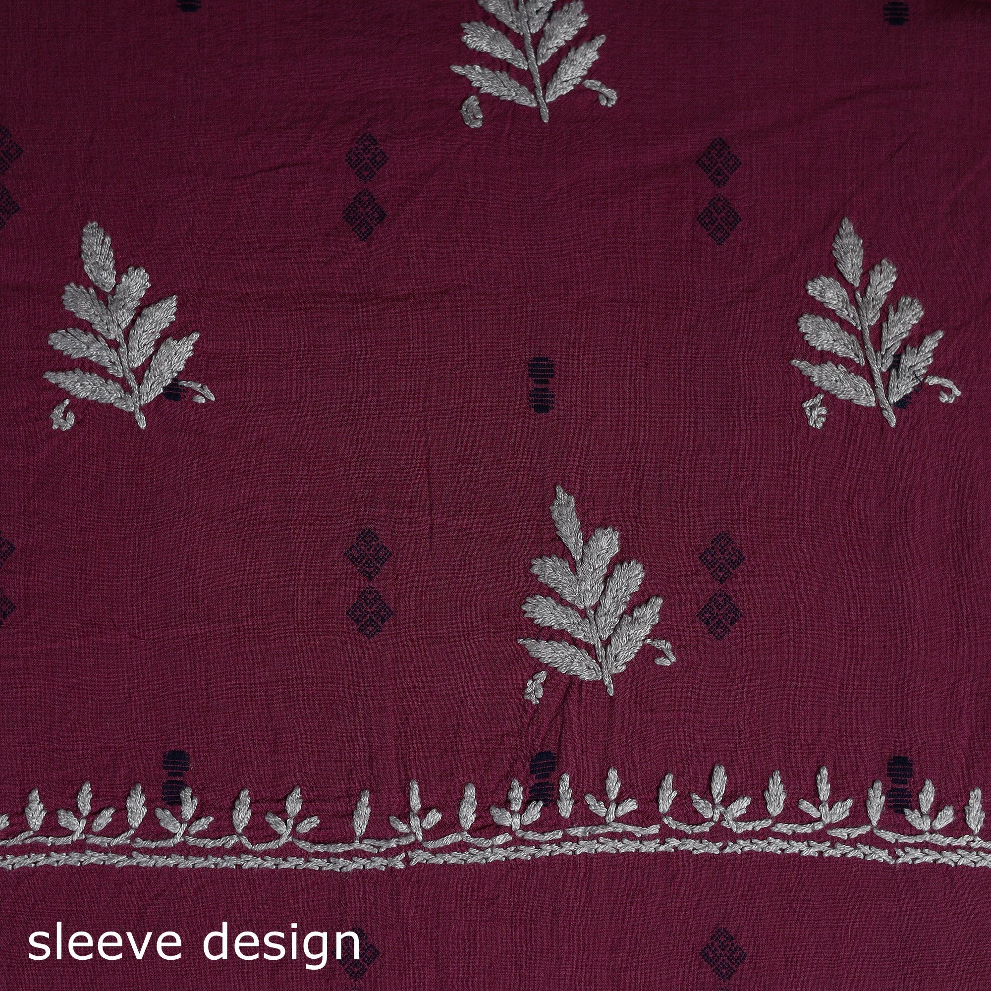 This purple lucknowi chikankari cotton jacquard unstitched kurta material brings together the refined charm of Chikankari hand embroidery and the rich texture of jacquard weaving. The delicate needlework from Lucknow blends beautifully with the woven patterns, giving the fabric a graceful and sophisticated appeal. Ideal for festive occasions or elevated everyday wear, it can be tailored to your preferred style.