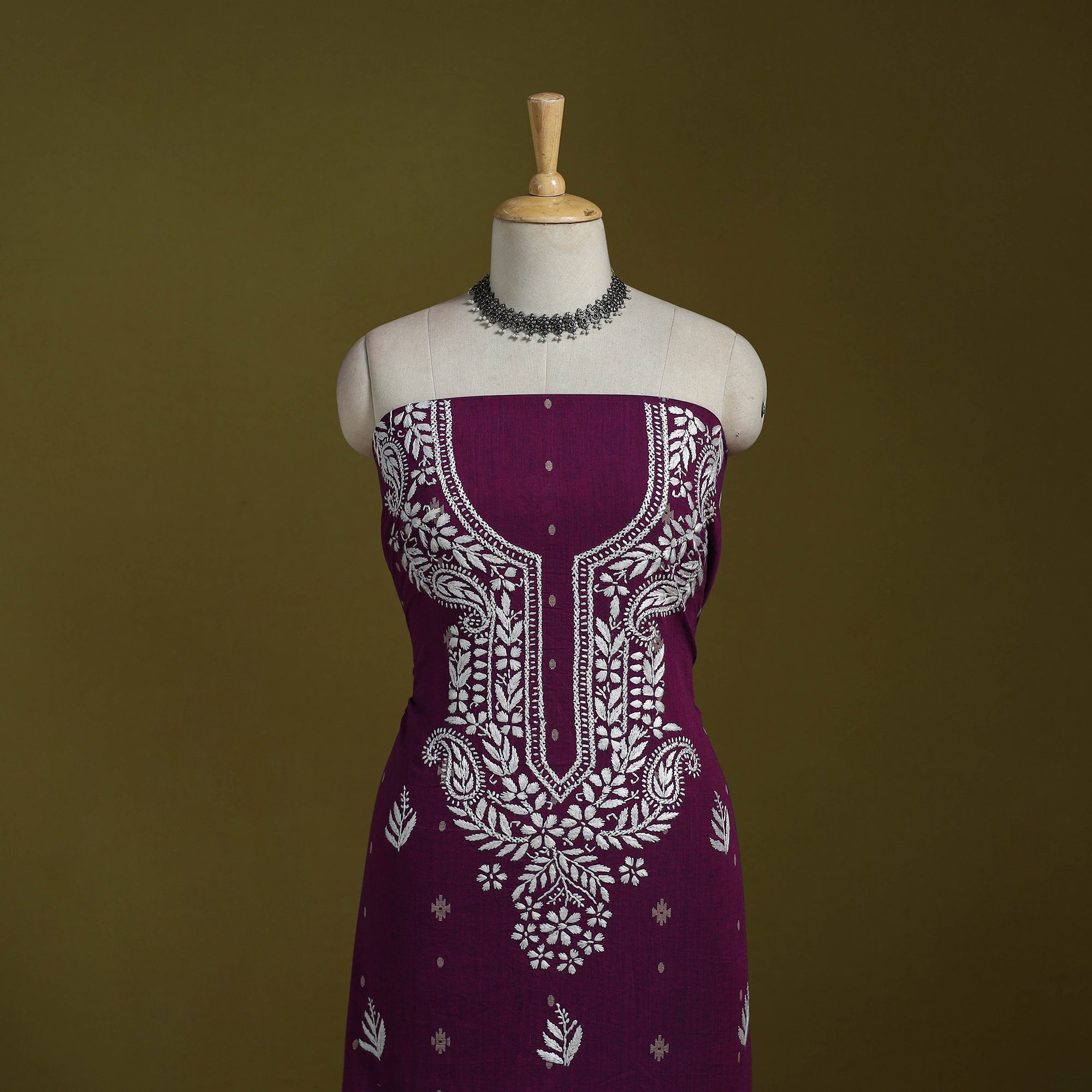 This purple lucknowi chikankari cotton jacquard unstitched kurta material brings together the refined charm of Chikankari hand embroidery and the rich texture of jacquard weaving. The delicate needlework from Lucknow blends beautifully with the woven patterns, giving the fabric a graceful and sophisticated appeal. Ideal for festive occasions or elevated everyday wear, it can be tailored to your preferred style.