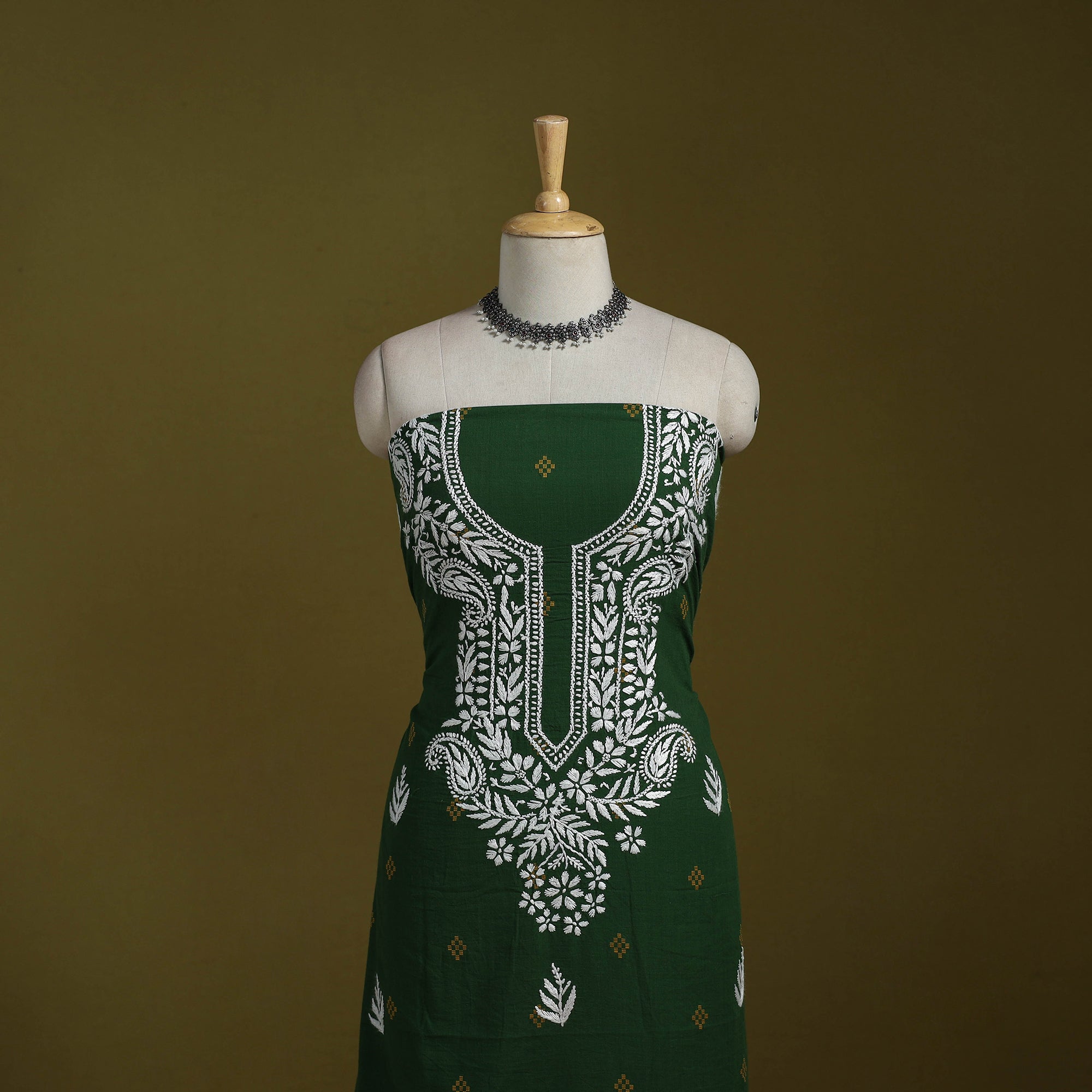 This green lucknowi chikankari cotton jacquard unstitched kurta material brings together the refined charm of Chikankari hand embroidery and the rich texture of jacquard weaving. The delicate needlework from Lucknow blends beautifully with the woven patterns, giving the fabric a graceful and sophisticated appeal. Ideal for festive occasions or elevated everyday wear, it can be tailored to your preferred style.