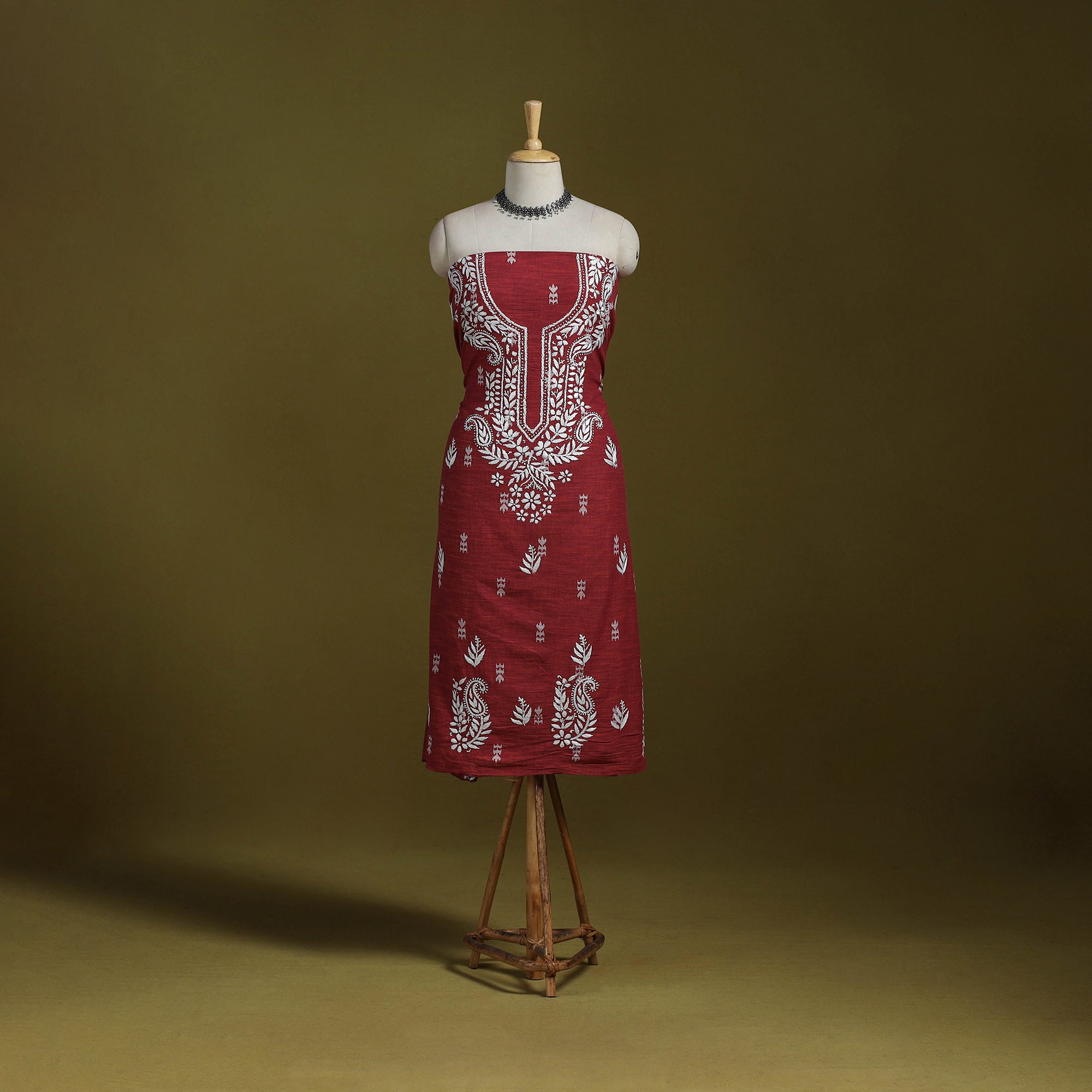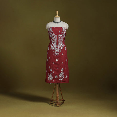 Red - Lucknowi Chikankari Work Jacquard Unstitched Kurta Material (2.5M) 12