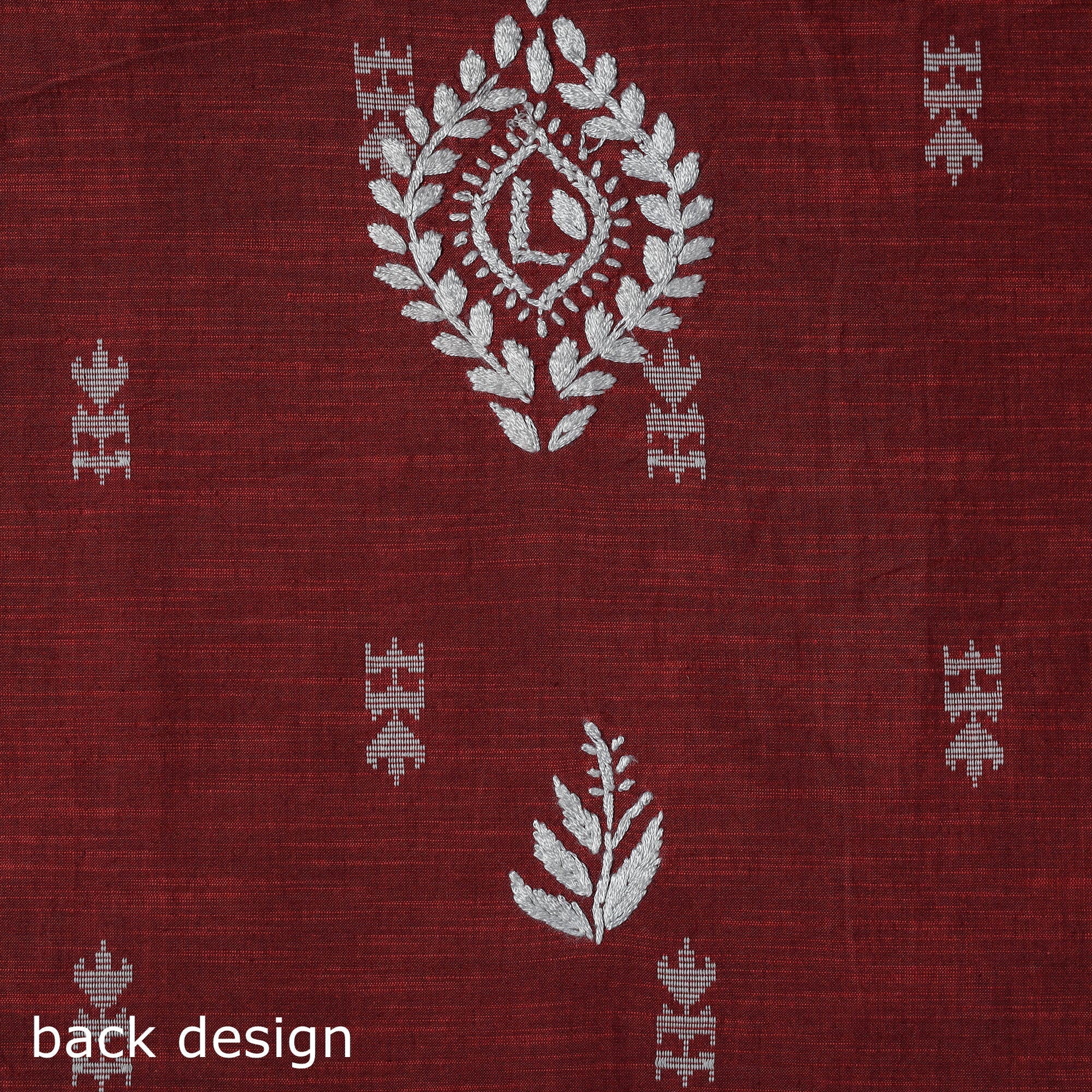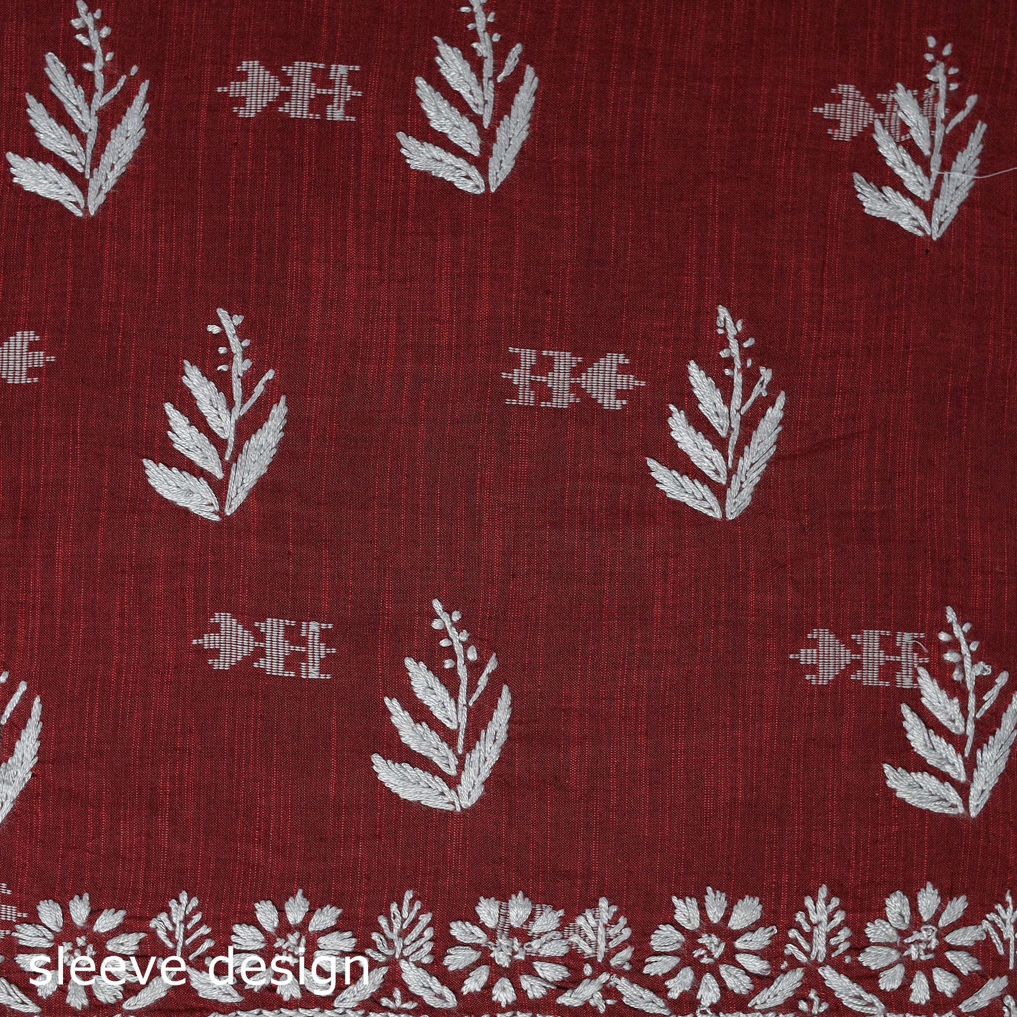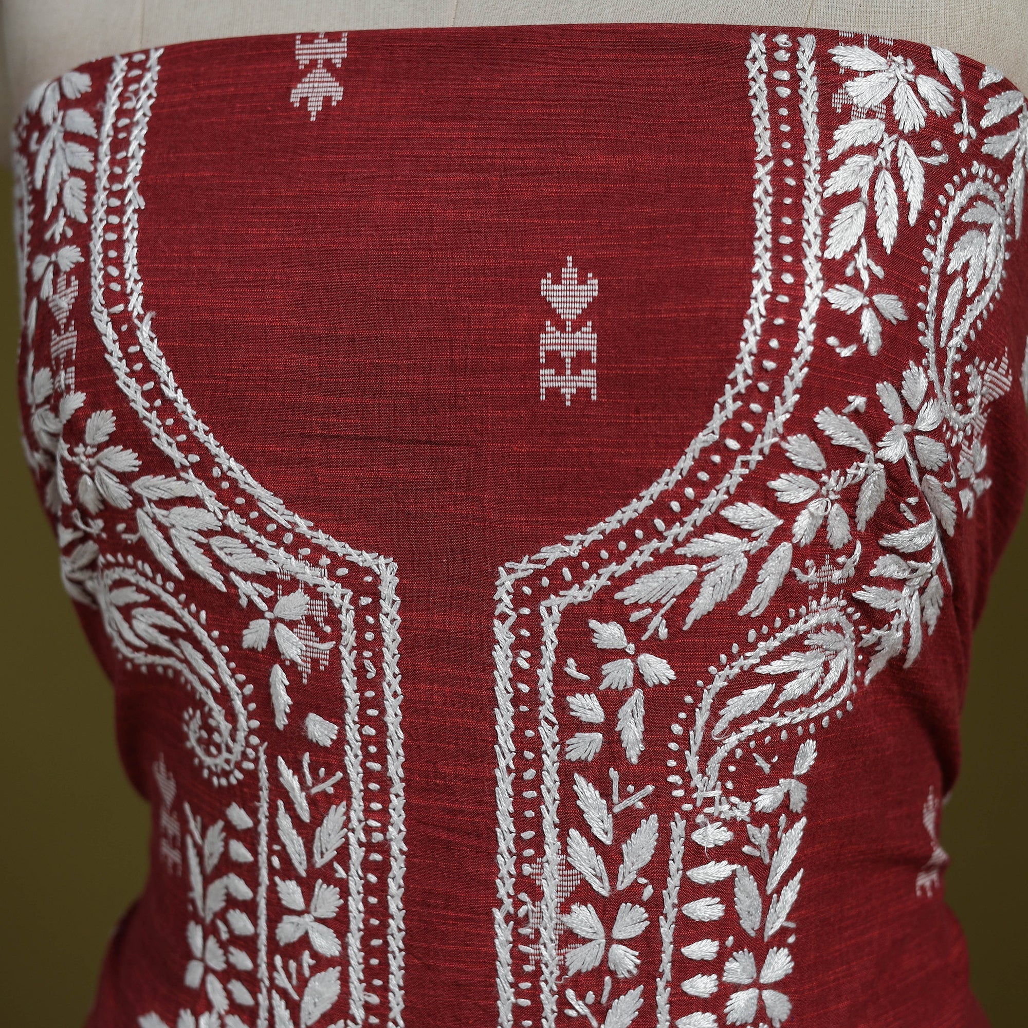 This red lucknowi chikankari cotton jacquard unstitched kurta material brings together the refined charm of Chikankari hand embroidery and the rich texture of jacquard weaving. The delicate needlework from Lucknow blends beautifully with the woven patterns, giving the fabric a graceful and sophisticated appeal. Ideal for festive occasions or elevated everyday wear, it can be tailored to your preferred style.