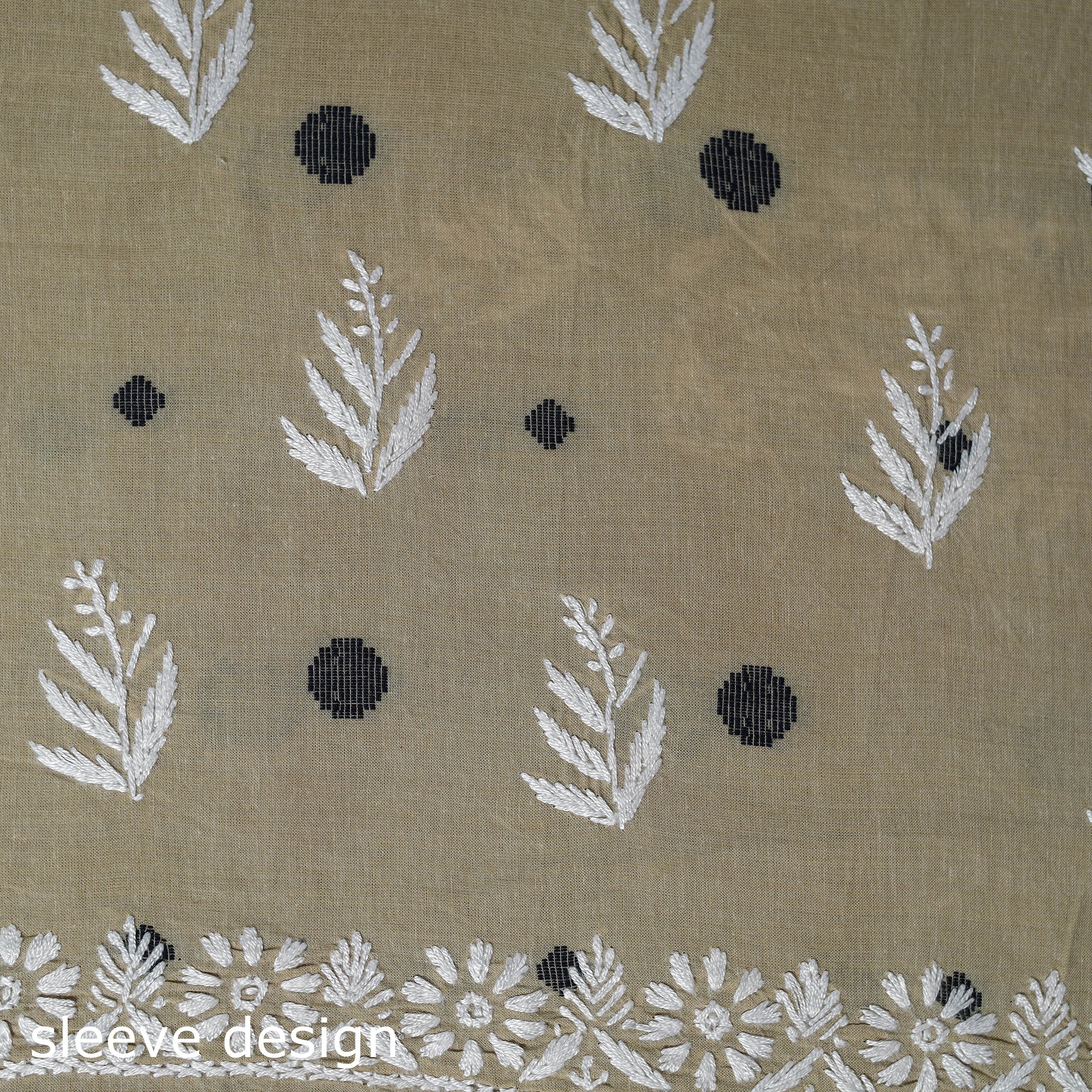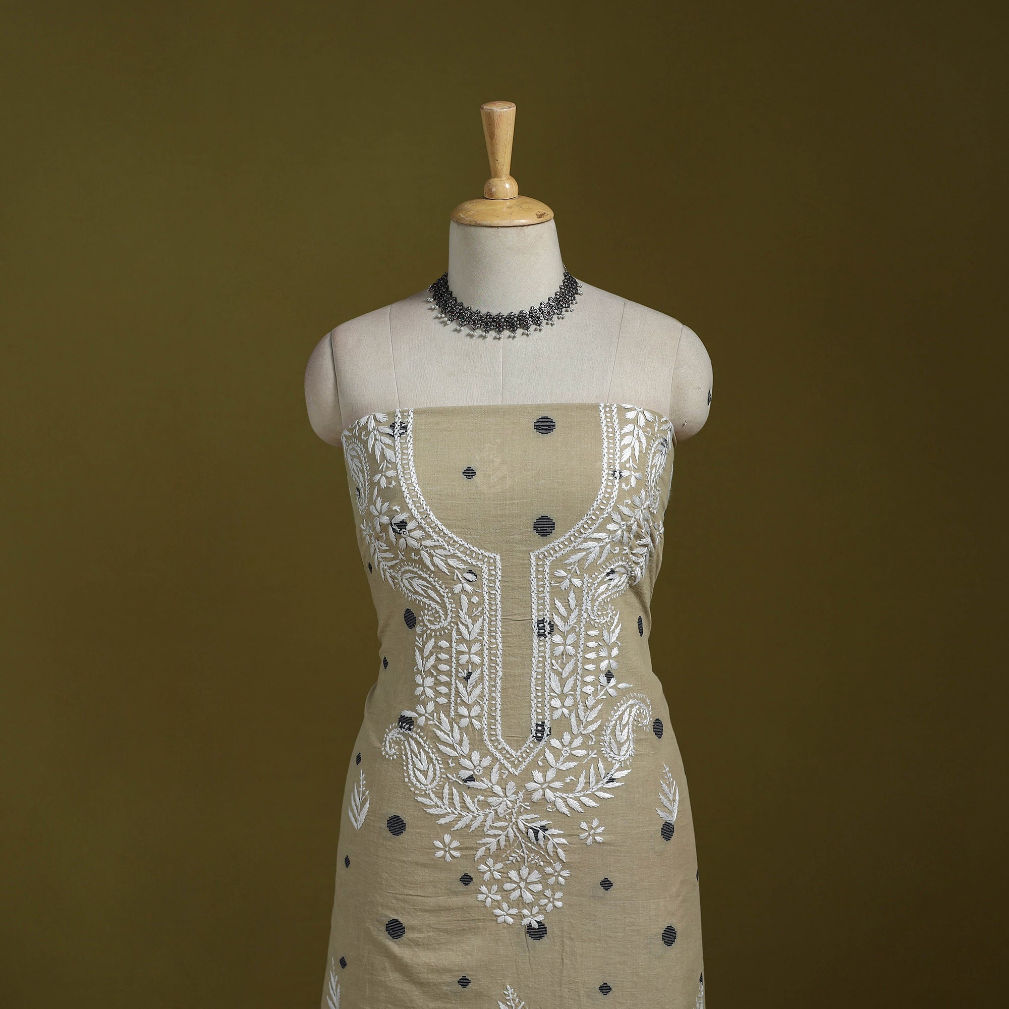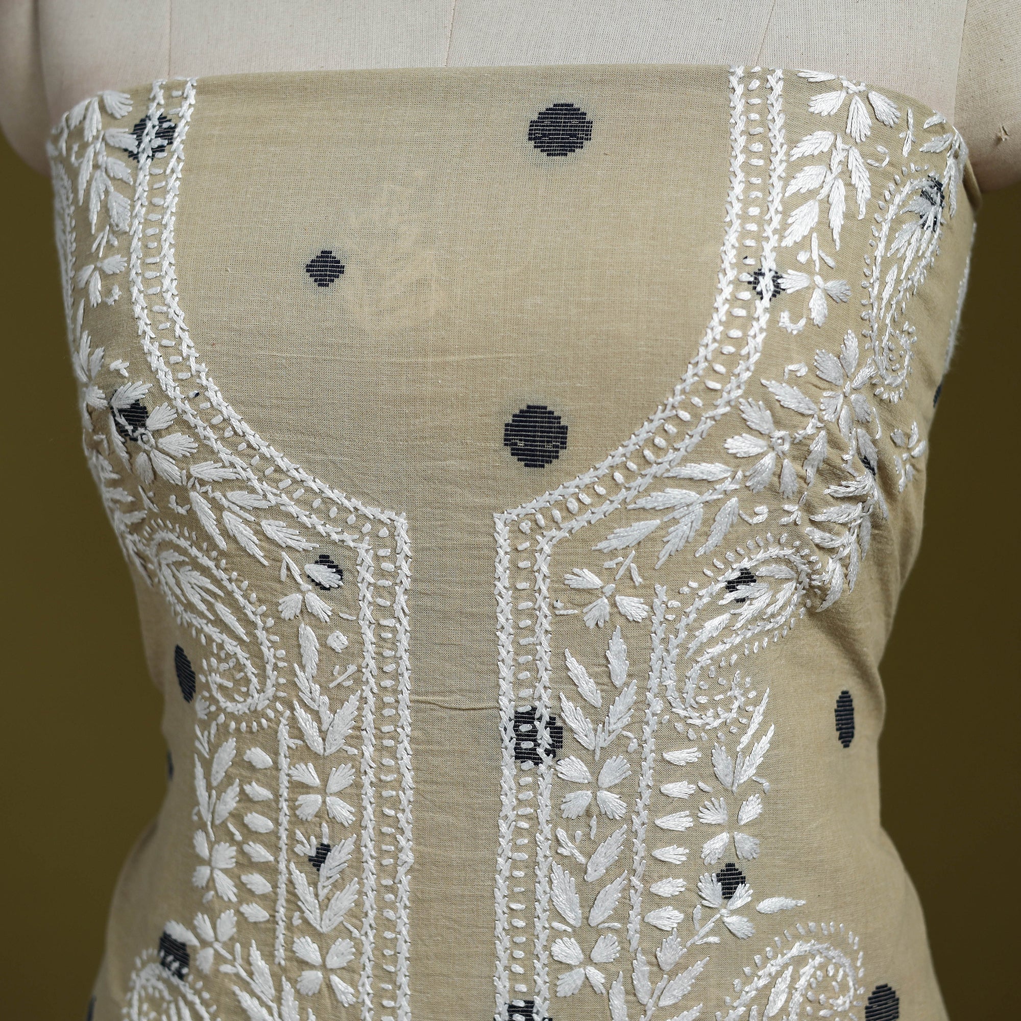 This beige lucknowi chikankari cotton jacquard unstitched kurta material brings together the refined charm of Chikankari hand embroidery and the rich texture of jacquard weaving. The delicate needlework from Lucknow blends beautifully with the woven patterns, giving the fabric a graceful and sophisticated appeal. Ideal for festive occasions or elevated everyday wear, it can be tailored to your preferred style.
