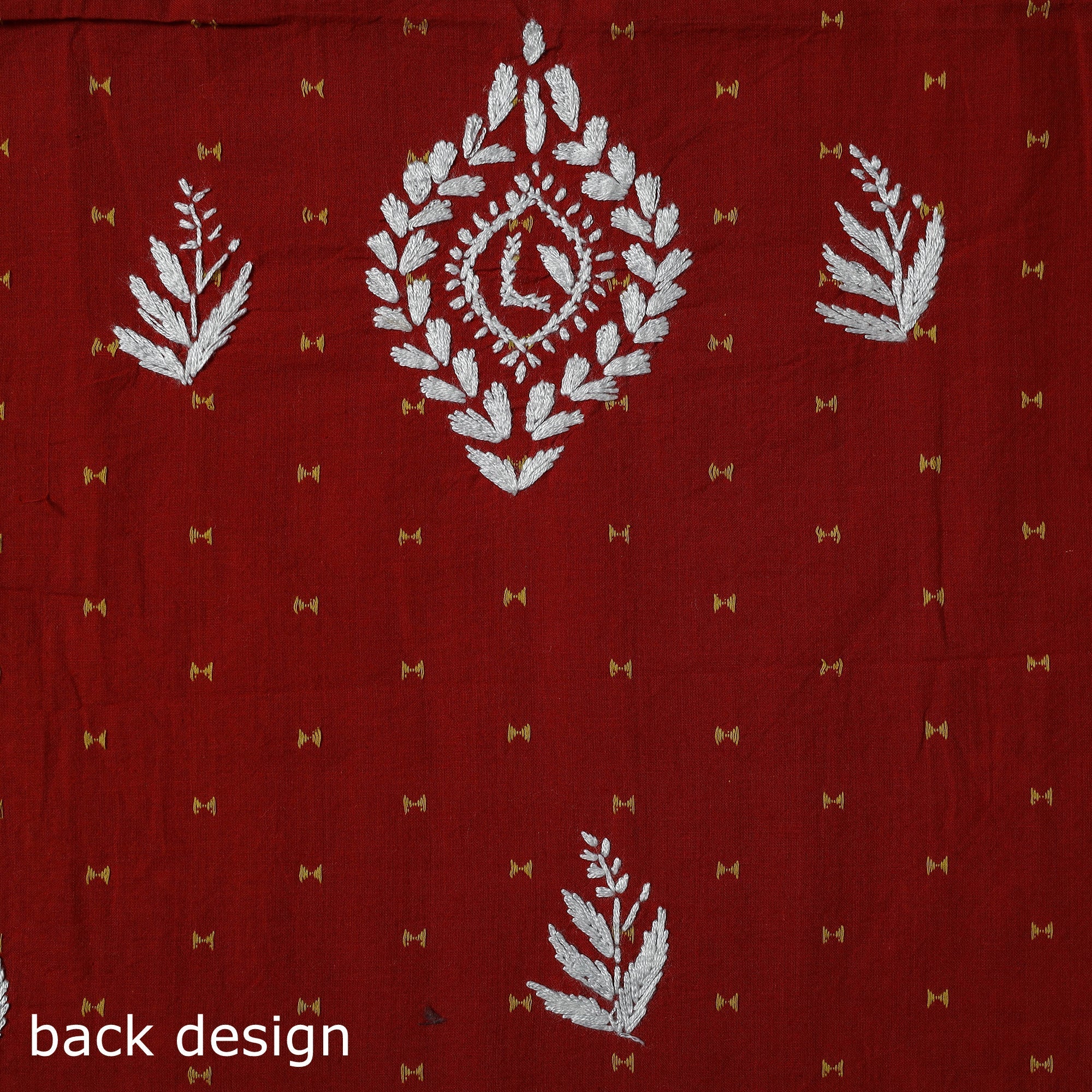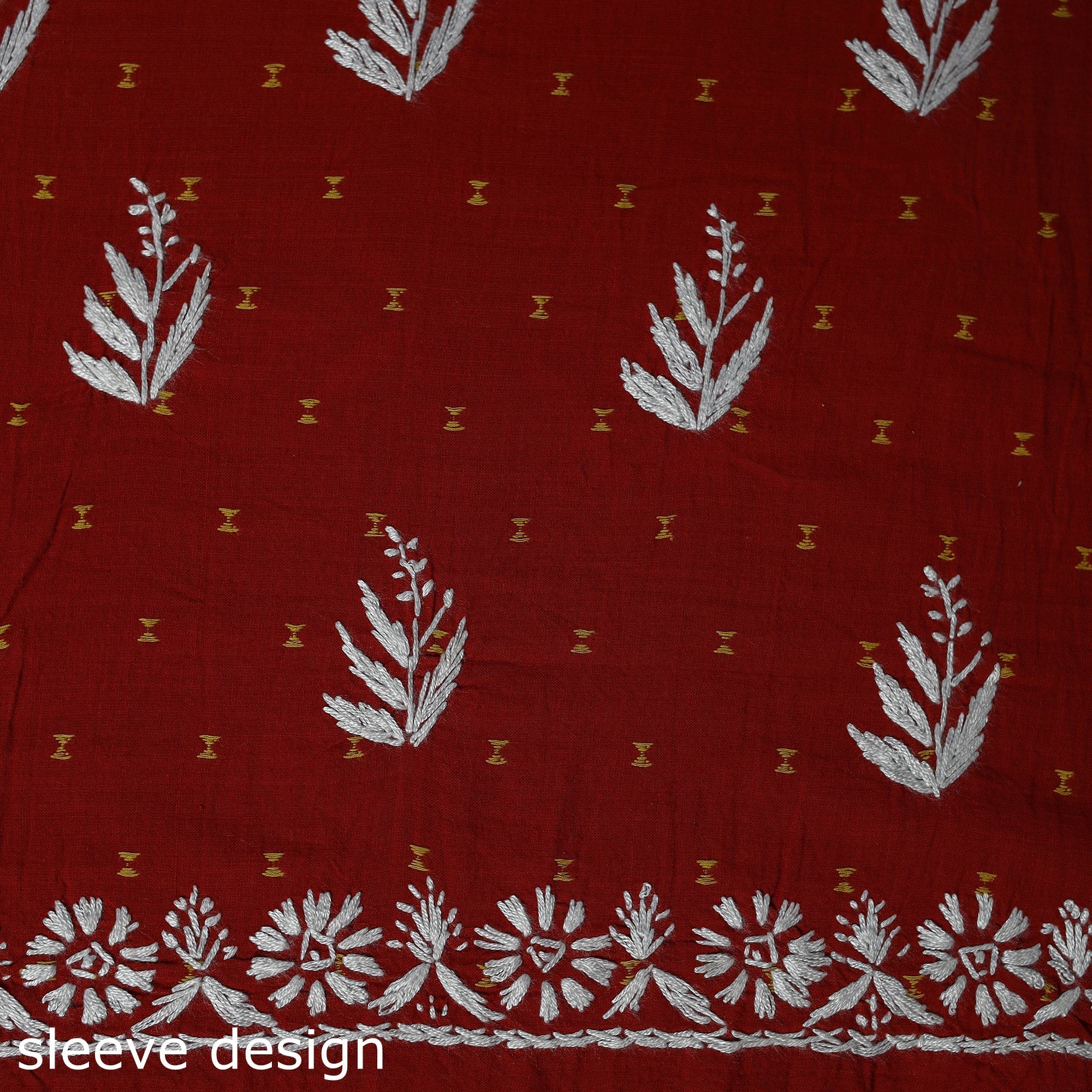 This red lucknowi chikankari cotton jacquard unstitched kurta material brings together the refined charm of Chikankari hand embroidery and the rich texture of jacquard weaving. The delicate needlework from Lucknow blends beautifully with the woven patterns, giving the fabric a graceful and sophisticated appeal. Ideal for festive occasions or elevated everyday wear, it can be tailored to your preferred style.
