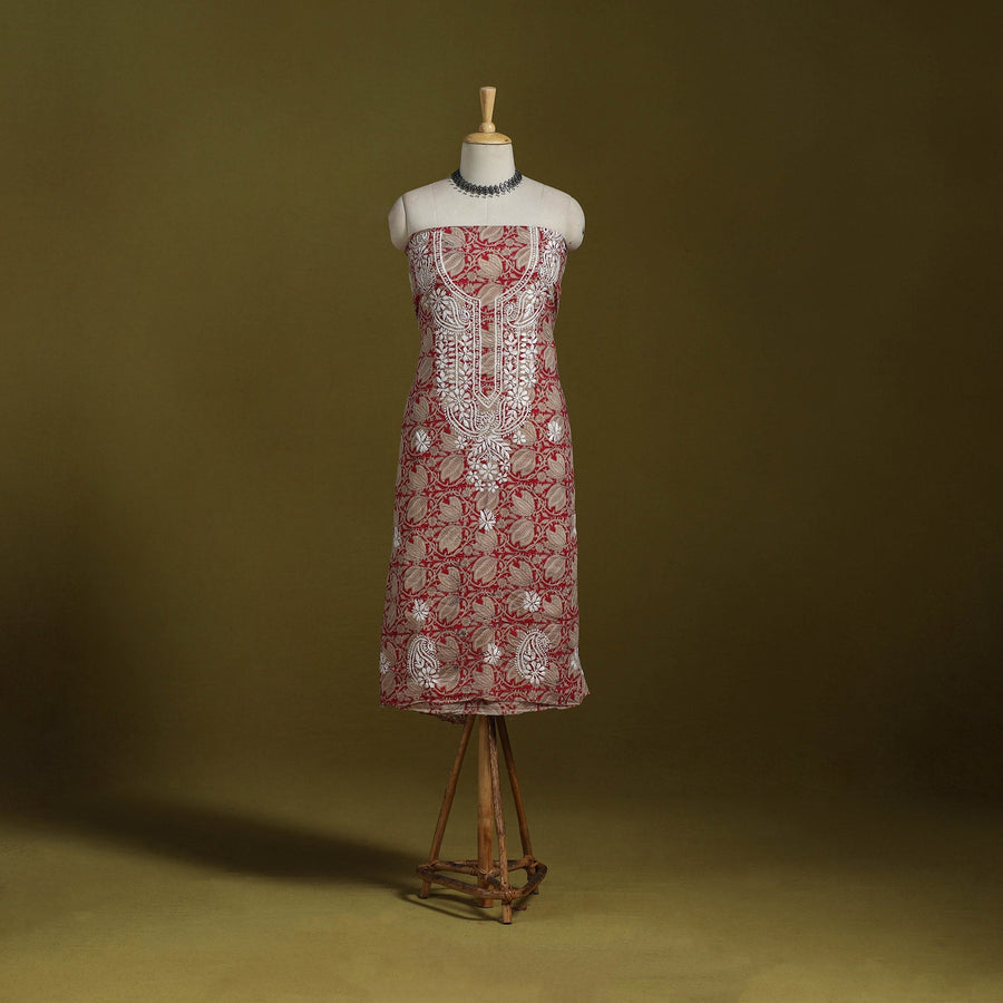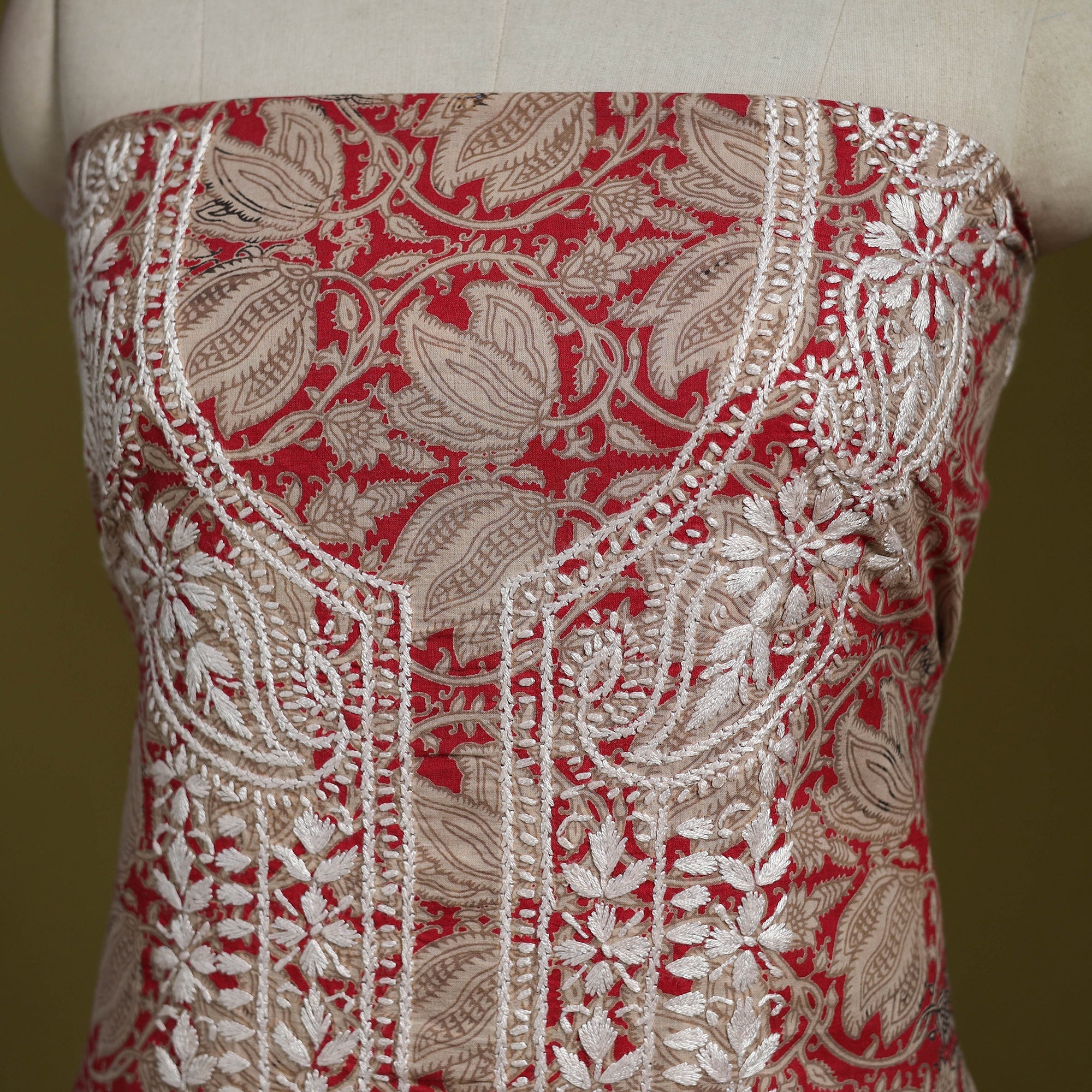Red Lucknowi chikankari cotton kalamkari unstitched kurta material brings together the intricate beauty of traditional chikankari hand embroidery with the charm of screen-printed kalamkari motifs. The blend of detailed needlework and artistic prints creates a refined fabric suitable for festive moments as well as elevated everyday wear. It can be tailored to your preferred style.
