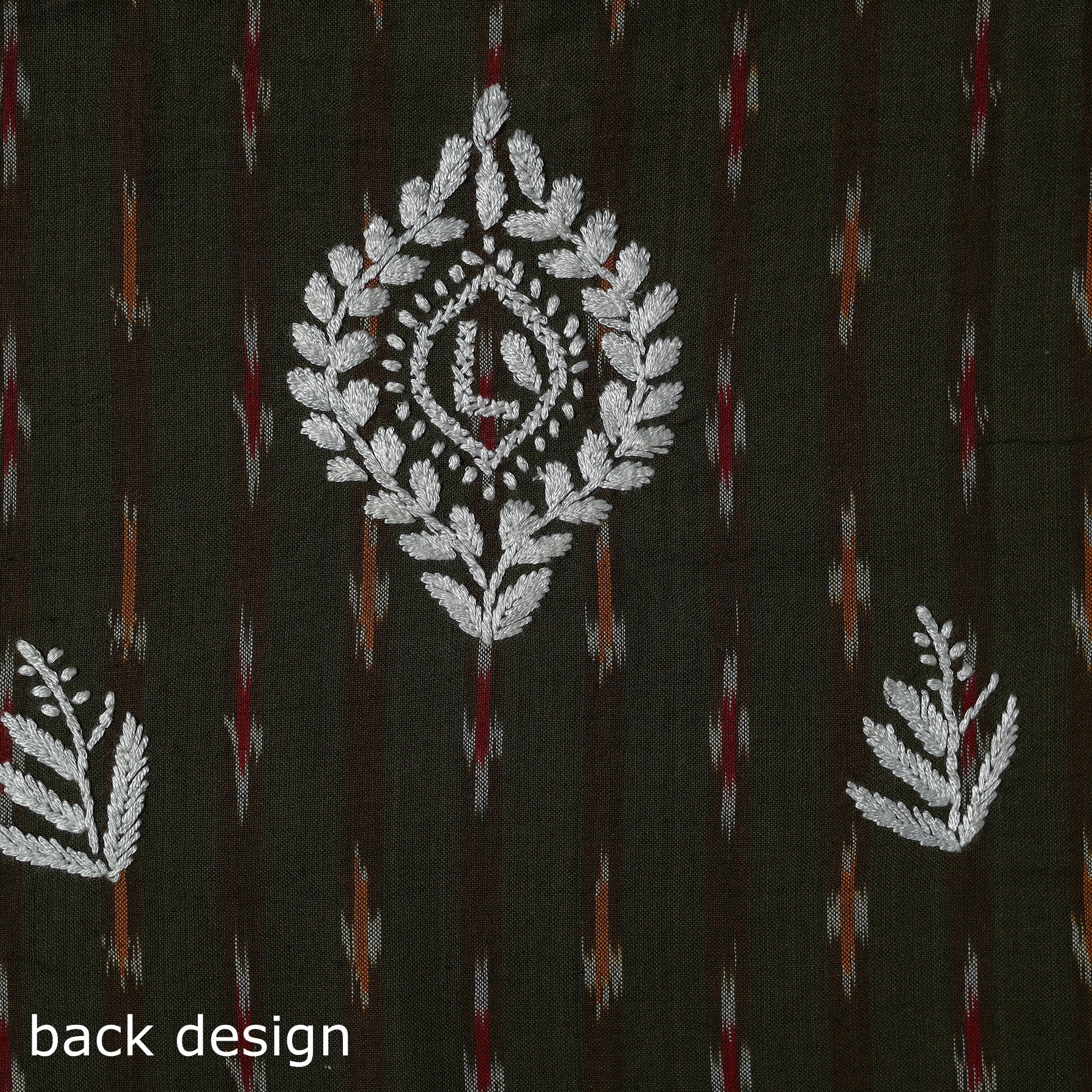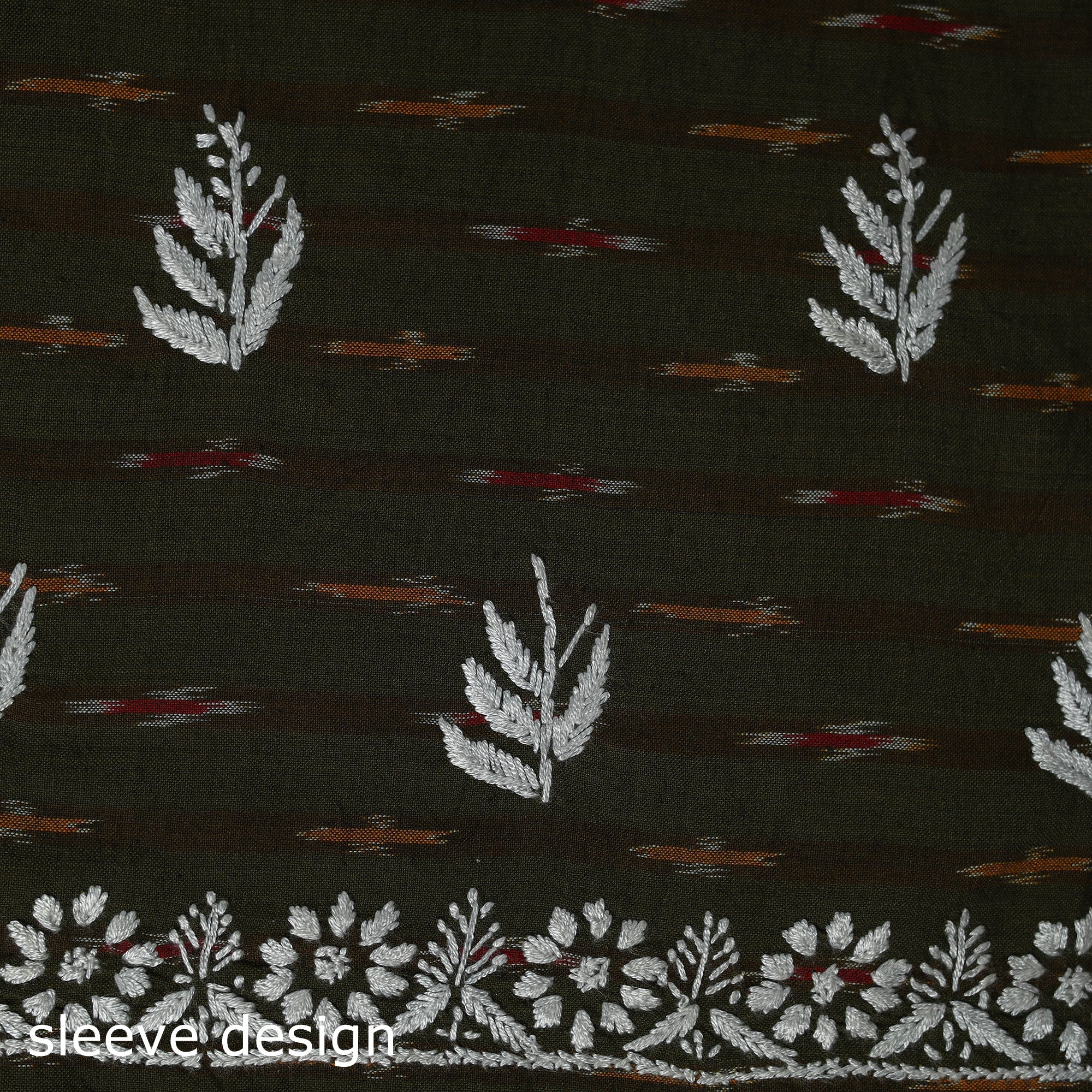 Green Lucknowi chikankari cotton pochampally ikat unstitched kurta material brings together the refined charm of Chikankari hand embroidery with the rich texture of pochampally ikat weaving. The delicate needlework from Lucknow blends beautifully with the woven patterns, giving the fabric a graceful and sophisticated appeal. Ideal for festive occasions or elevated everyday wear, it can be tailored to your preferred style.