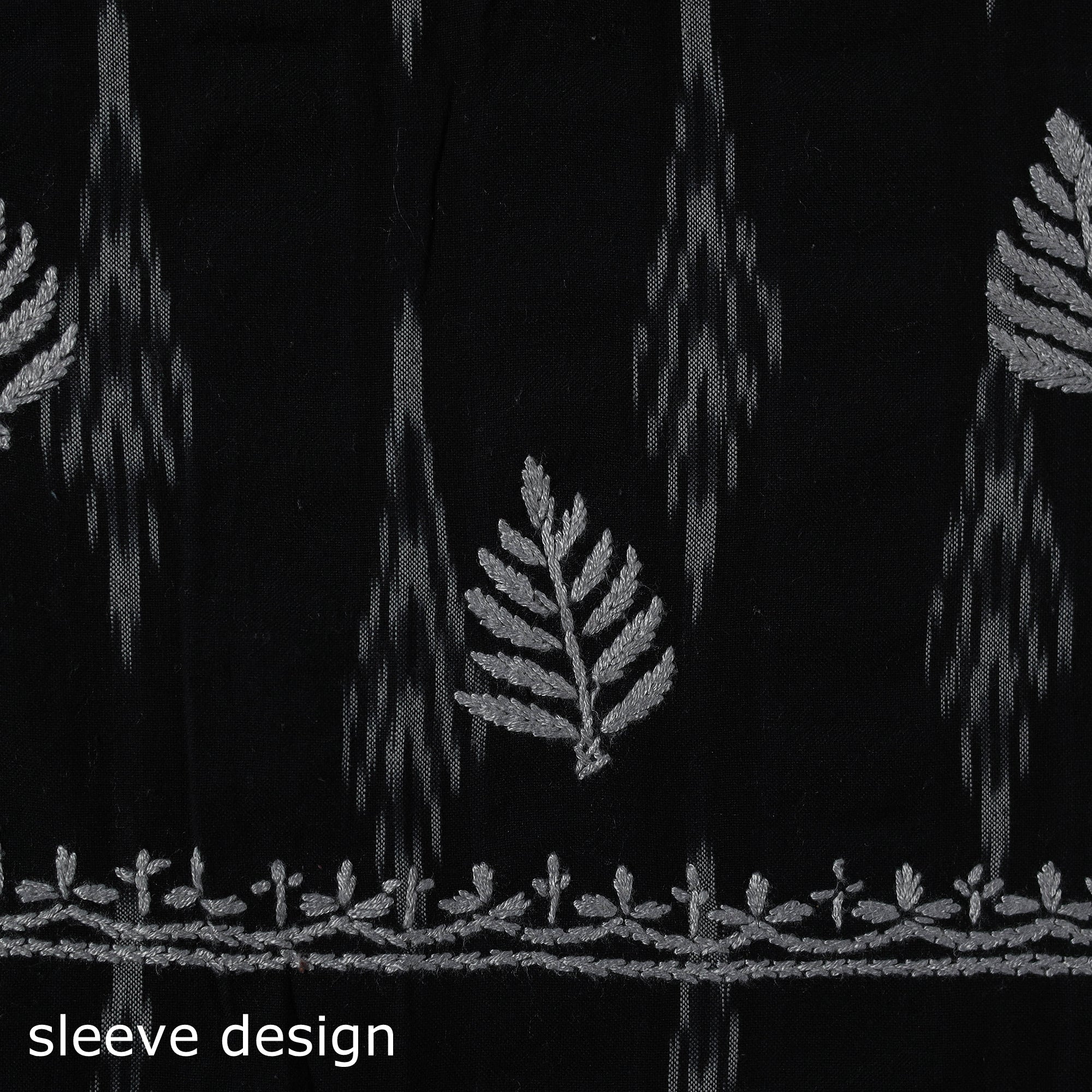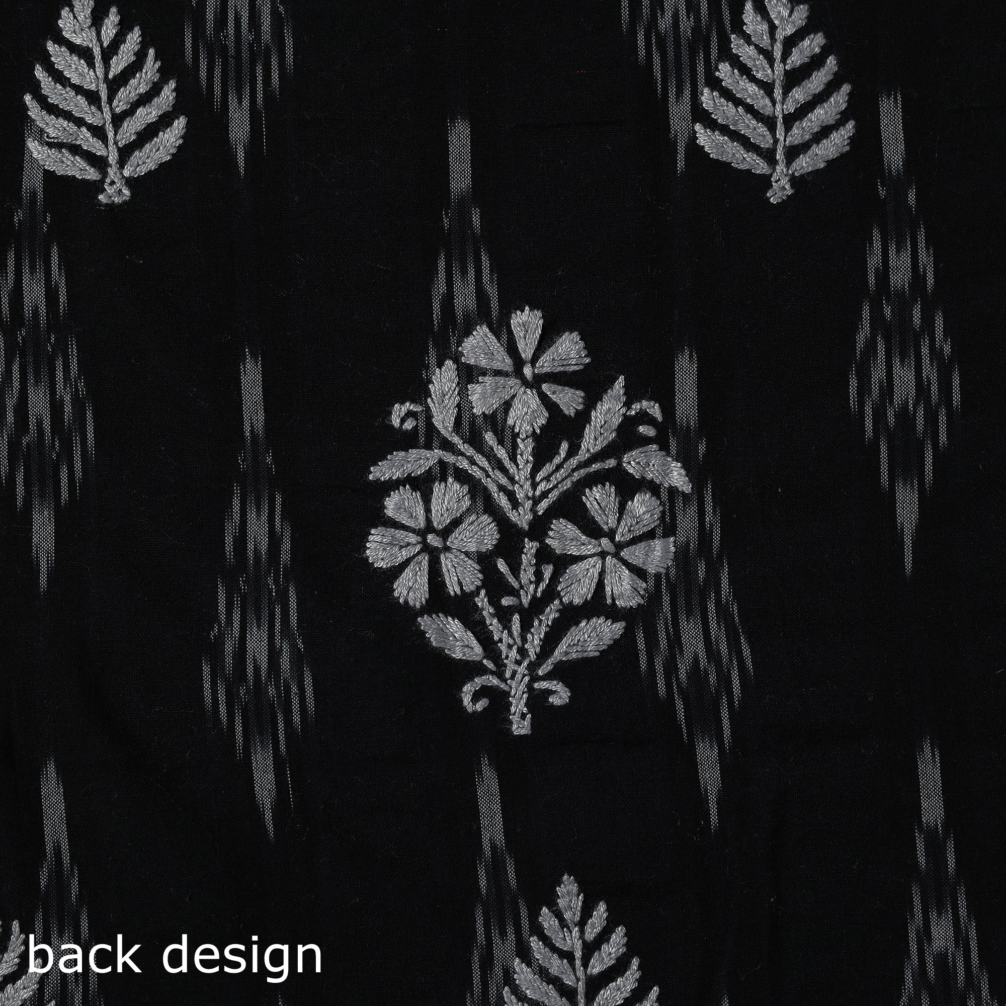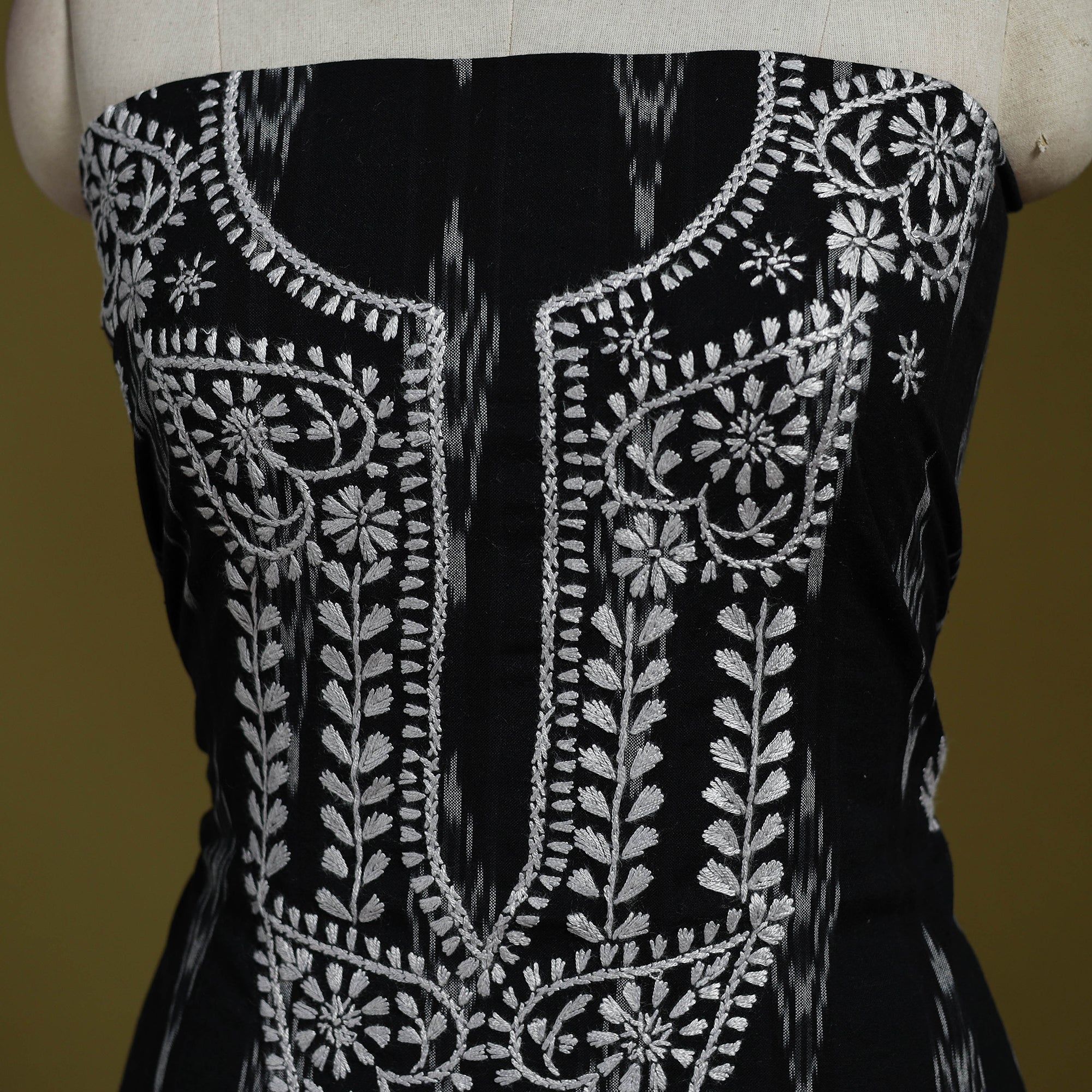 Black Lucknowi chikankari cotton pochampally ikat unstitched kurta material brings together the refined charm of Chikankari hand embroidery with the rich texture of pochampally ikat weaving. The delicate needlework from Lucknow blends beautifully with the woven patterns, giving the fabric a graceful and sophisticated appeal. Ideal for festive occasions or elevated everyday wear, it can be tailored to your preferred style.