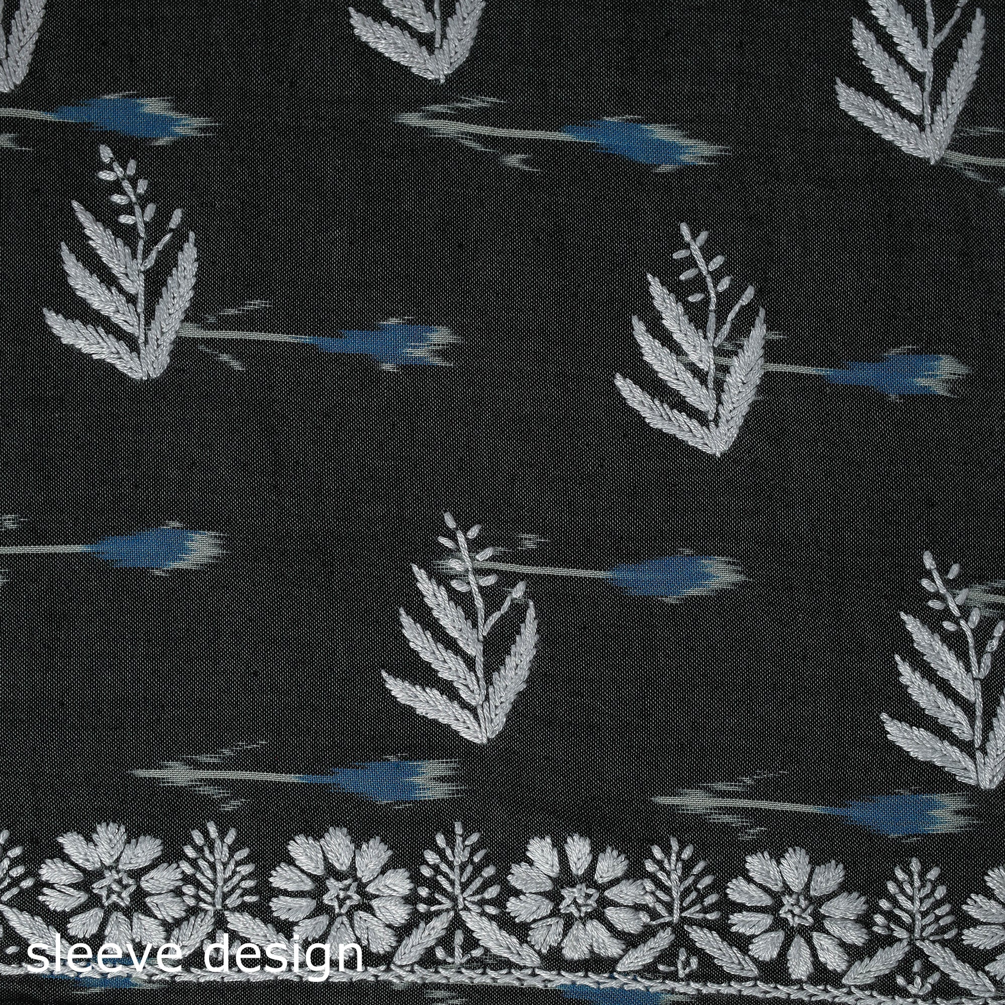Black Lucknowi chikankari cotton pochampally ikat unstitched kurta material brings together the refined charm of Chikankari hand embroidery with the rich texture of pochampally ikat weaving. The delicate needlework from Lucknow blends beautifully with the woven patterns, giving the fabric a graceful and sophisticated appeal. Ideal for festive occasions or elevated everyday wear, it can be tailored to your preferred style.