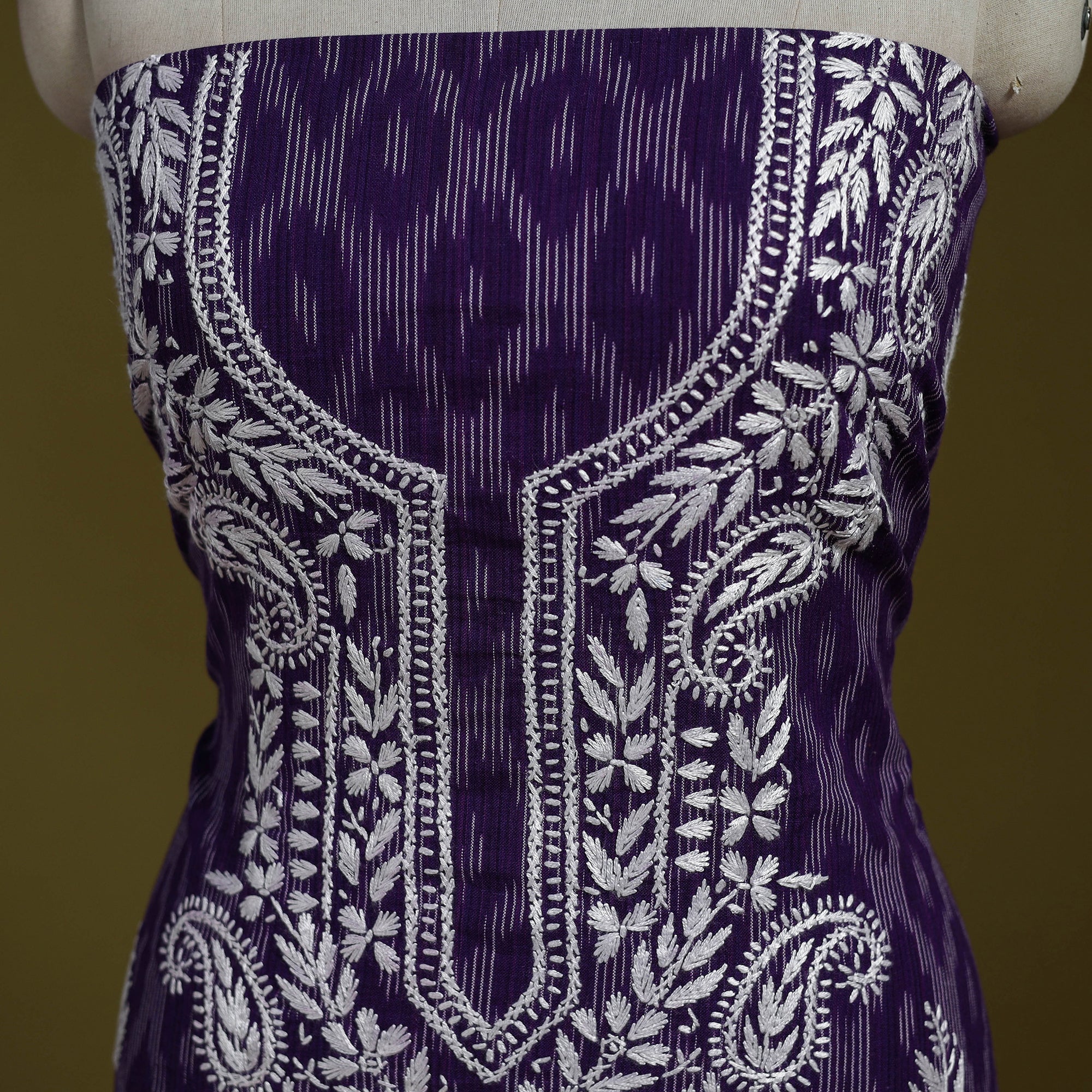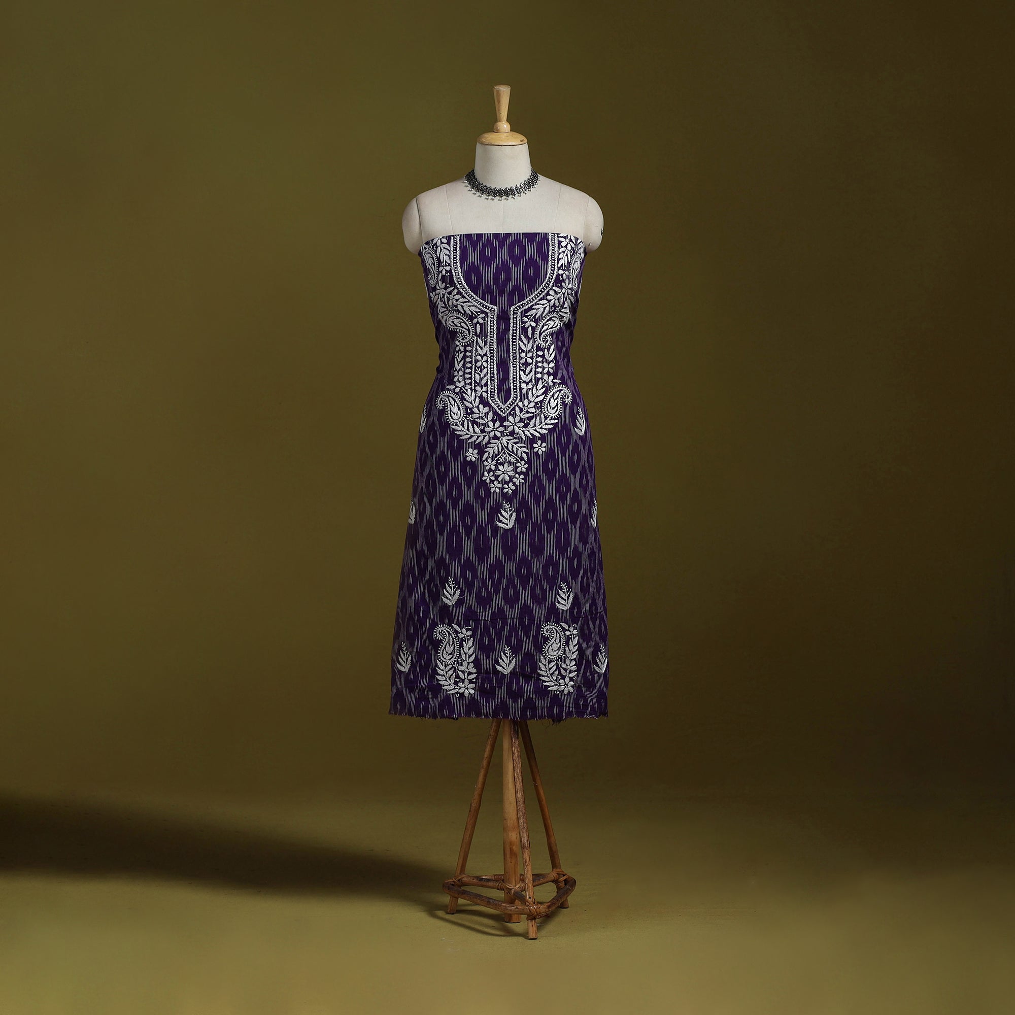 Purple Lucknowi chikankari cotton pochampally ikat unstitched kurta material brings together the refined charm of Chikankari hand embroidery with the rich texture of pochampally ikat weaving. The delicate needlework from Lucknow blends beautifully with the woven patterns, giving the fabric a graceful and sophisticated appeal. Ideal for festive occasions or elevated everyday wear, it can be tailored to your preferred style.