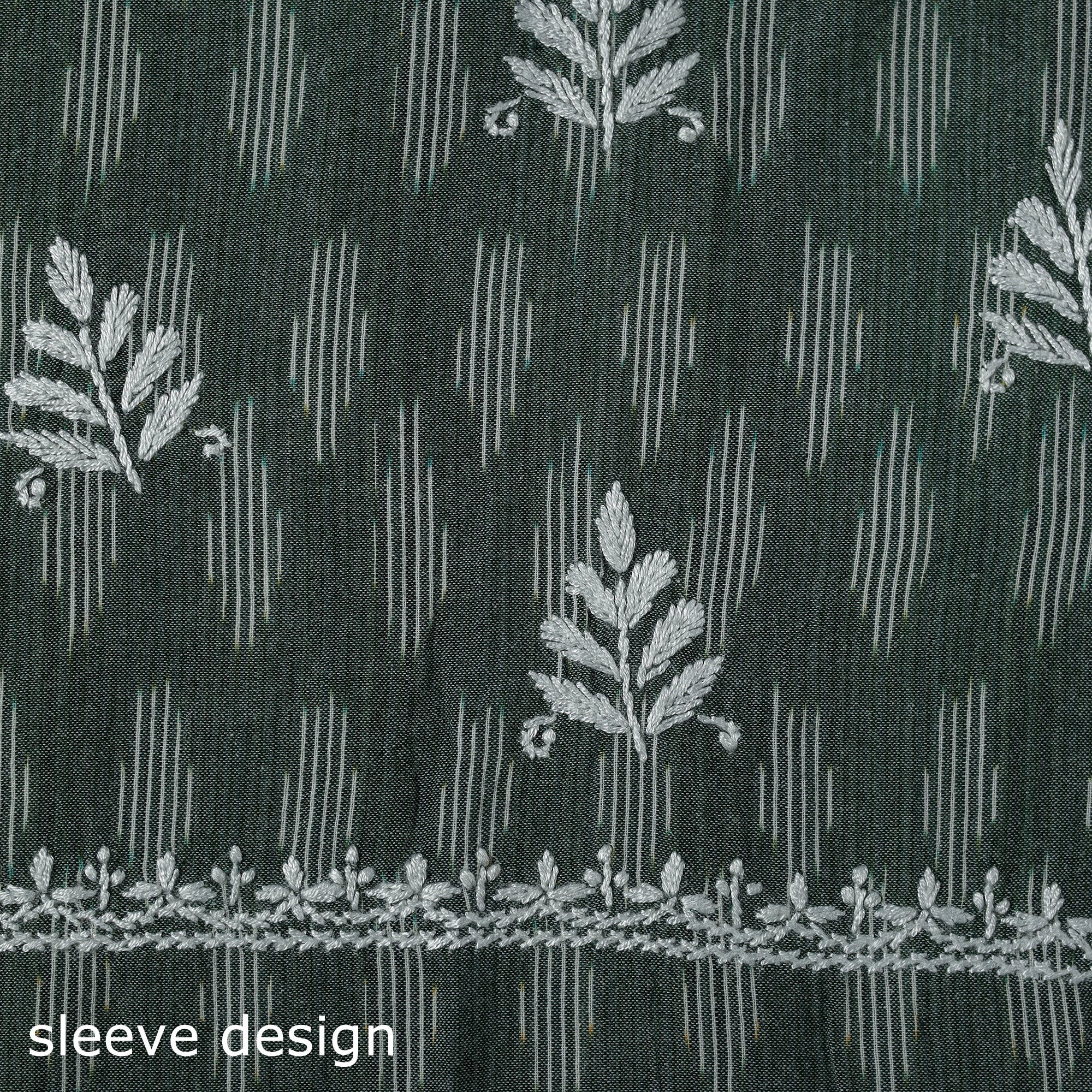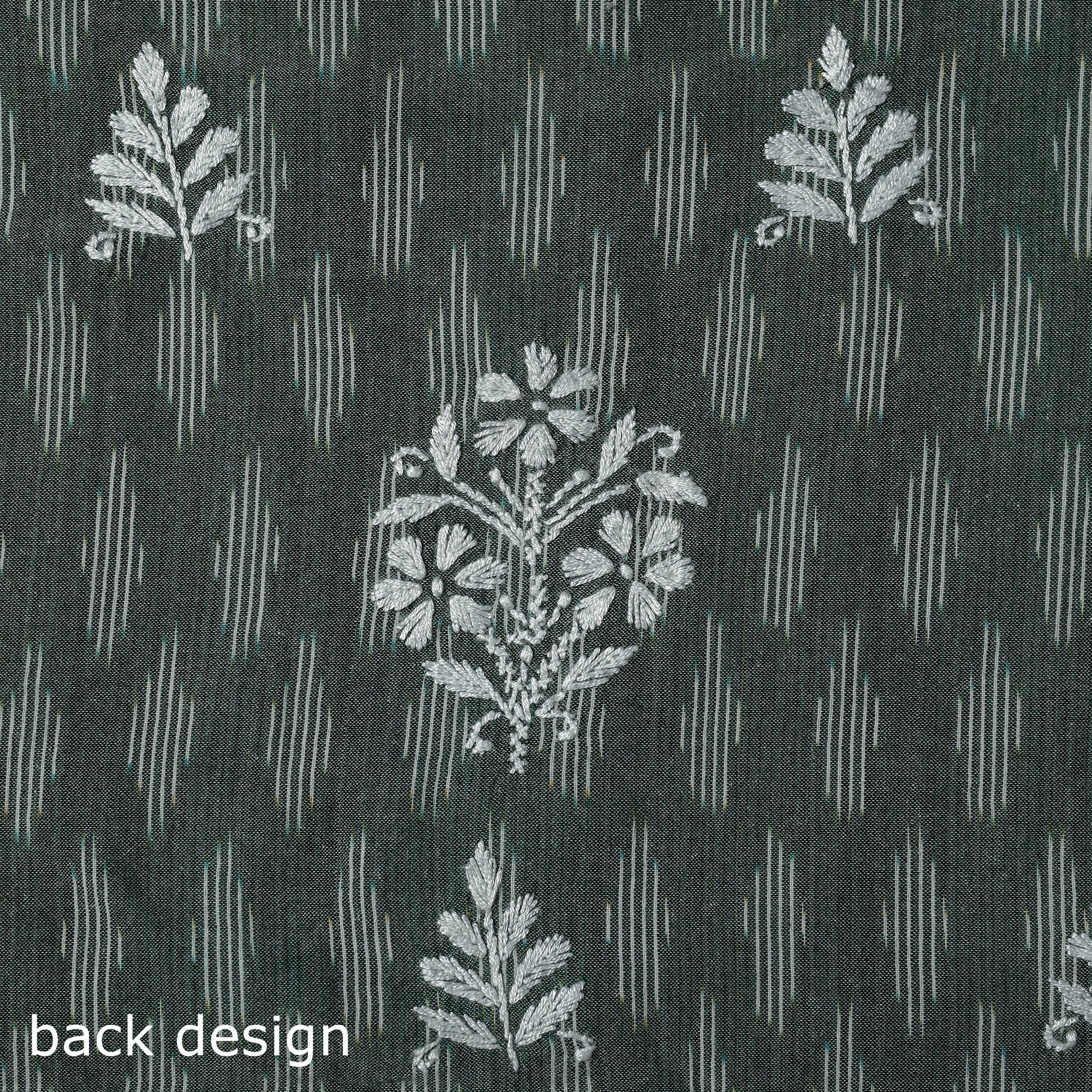 Green Lucknowi chikankari cotton pochampally ikat unstitched kurta material brings together the refined charm of Chikankari hand embroidery with the rich texture of pochampally ikat weaving. The delicate needlework from Lucknow blends beautifully with the woven patterns, giving the fabric a graceful and sophisticated appeal. Ideal for festive occasions or elevated everyday wear, it can be tailored to your preferred style.