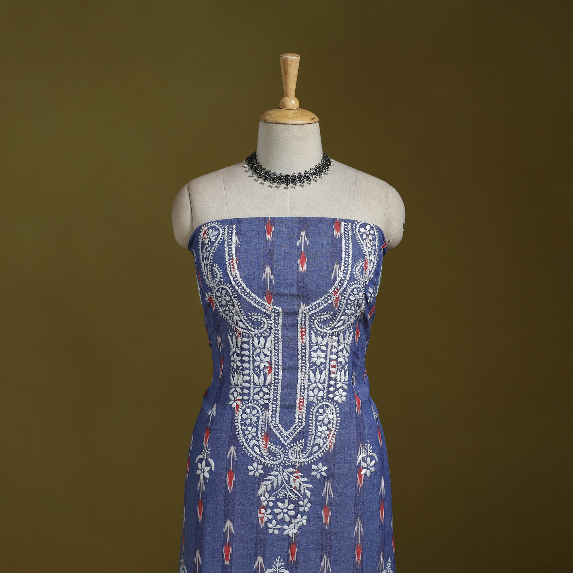 Blue Lucknowi chikankari cotton pochampally ikat unstitched kurta material brings together the refined charm of Chikankari hand embroidery with the rich texture of pochampally ikat weaving. The delicate needlework from Lucknow blends beautifully with the woven patterns, giving the fabric a graceful and sophisticated appeal. Ideal for festive occasions or elevated everyday wear, it can be tailored to your preferred style.