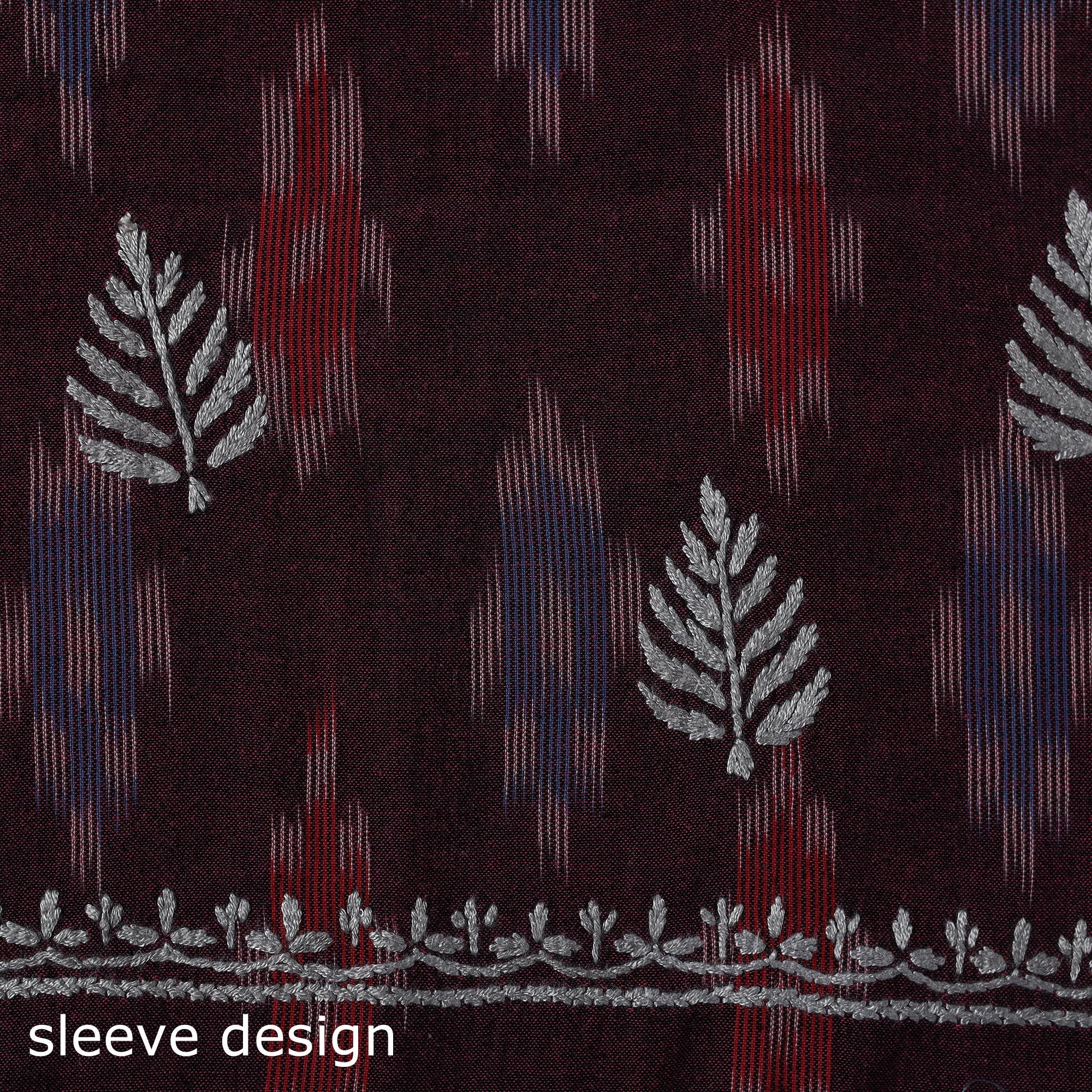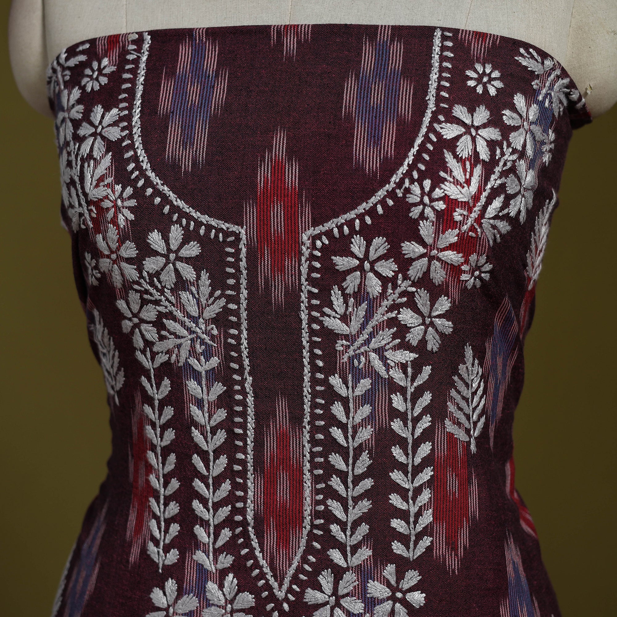 Maroon Lucknowi chikankari cotton pochampally ikat unstitched kurta material brings together the refined charm of Chikankari hand embroidery with the rich texture of pochampally ikat weaving. The delicate needlework from Lucknow blends beautifully with the woven patterns, giving the fabric a graceful and sophisticated appeal. Ideal for festive occasions or elevated everyday wear, it can be tailored to your preferred style.
