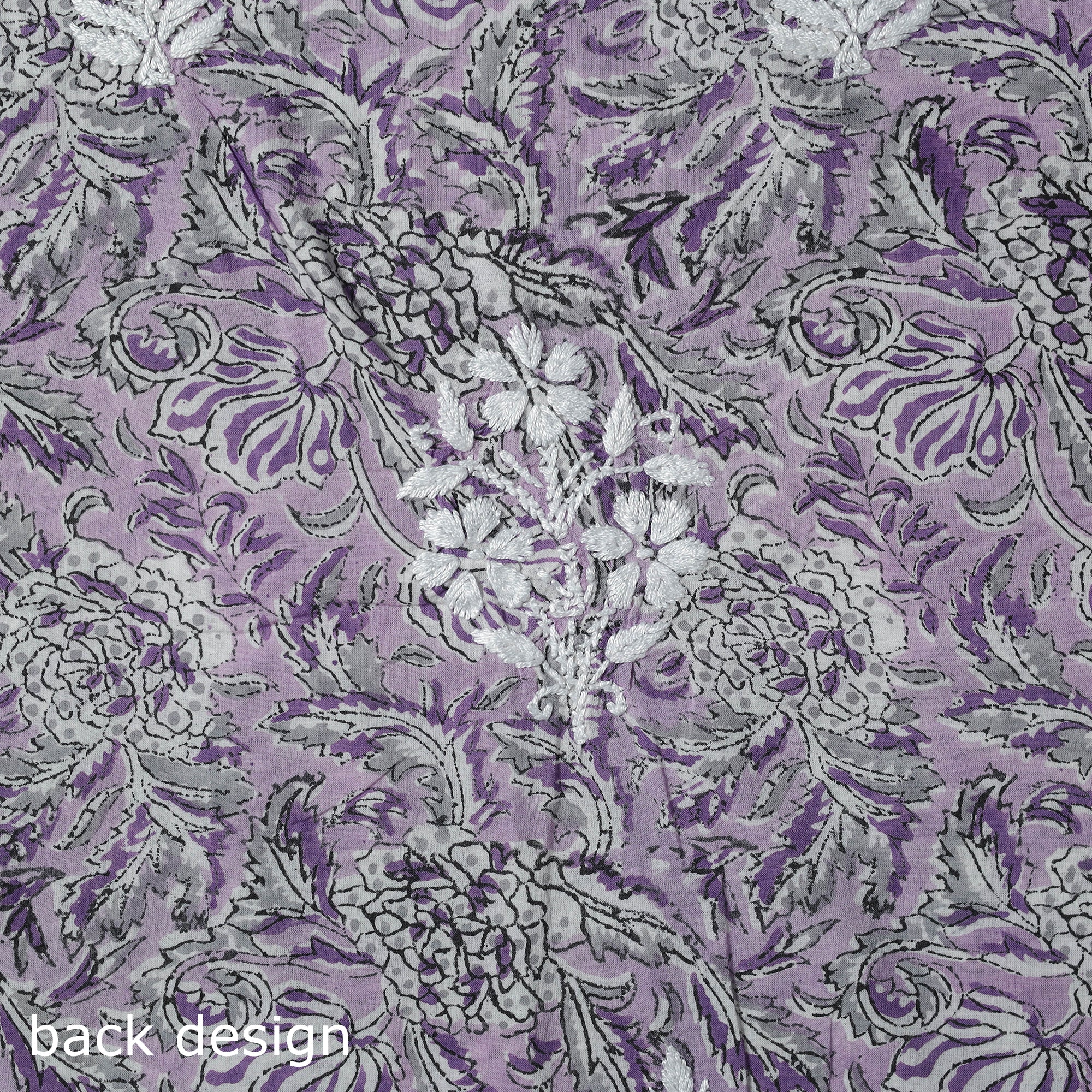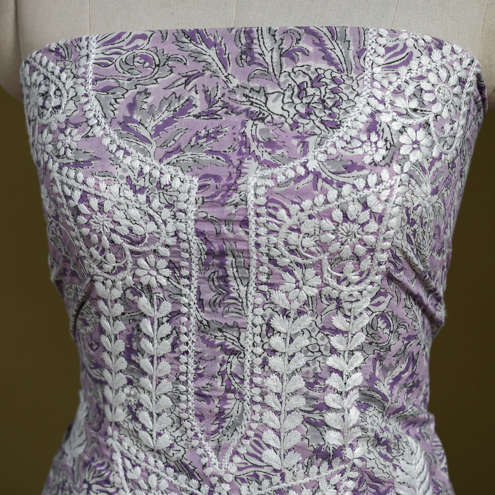 This purple lucknowi chikankari cotton sanganeri unstitched kurta material brings together the intricate beauty of Chikankari hand embroidery and the delicacy of sanganeri hand block prints. The blend of textures creates a refined fabric suitable for festive moments as well as elevated everyday wear. It can be tailored to your preferred style for a polished and timeless look.