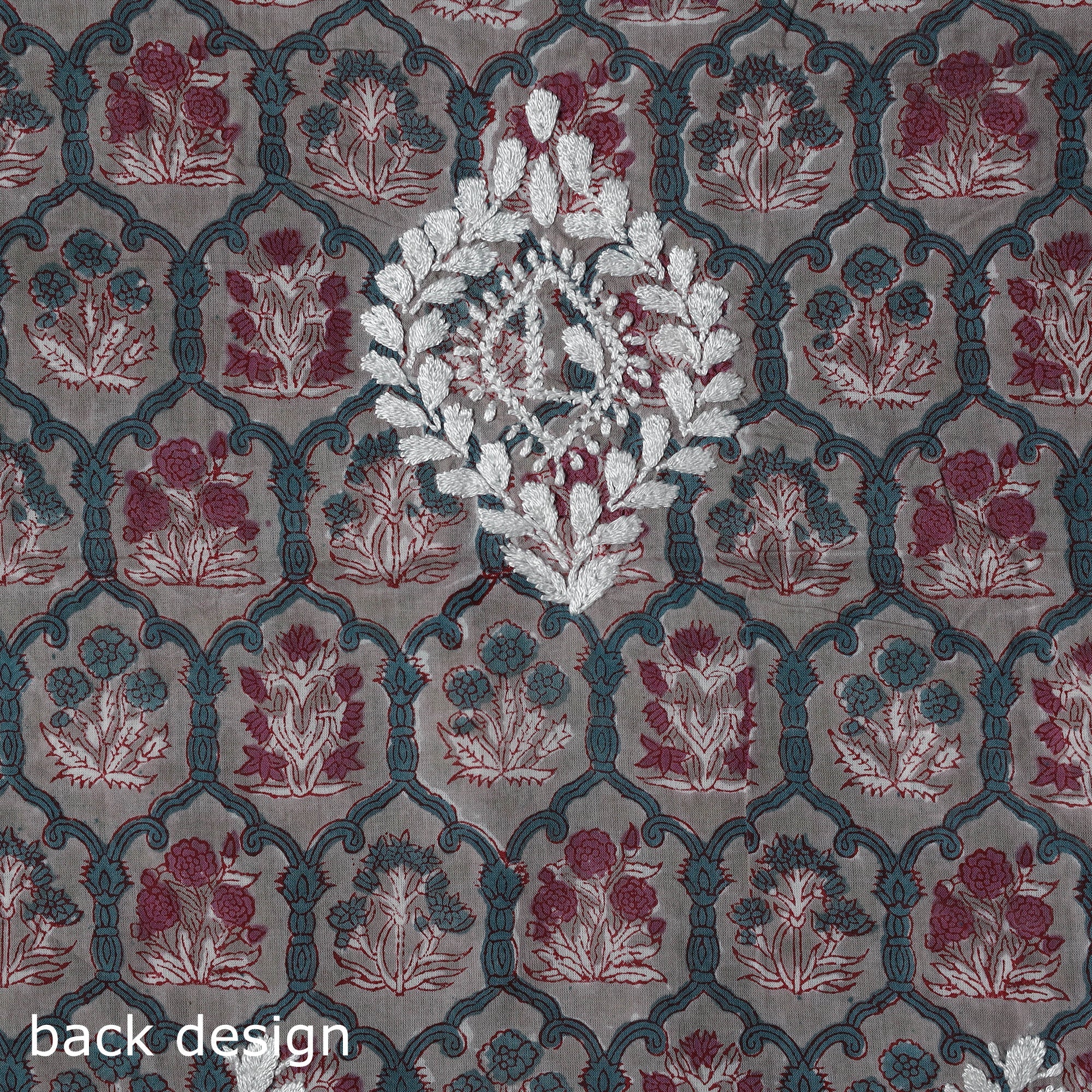 This grey lucknowi chikankari cotton sanganeri unstitched kurta material brings together the intricate beauty of Chikankari hand embroidery and the delicacy of sanganeri hand block prints. The blend of textures creates a refined fabric suitable for festive moments as well as elevated everyday wear. It can be tailored to your preferred style for a polished and timeless look.