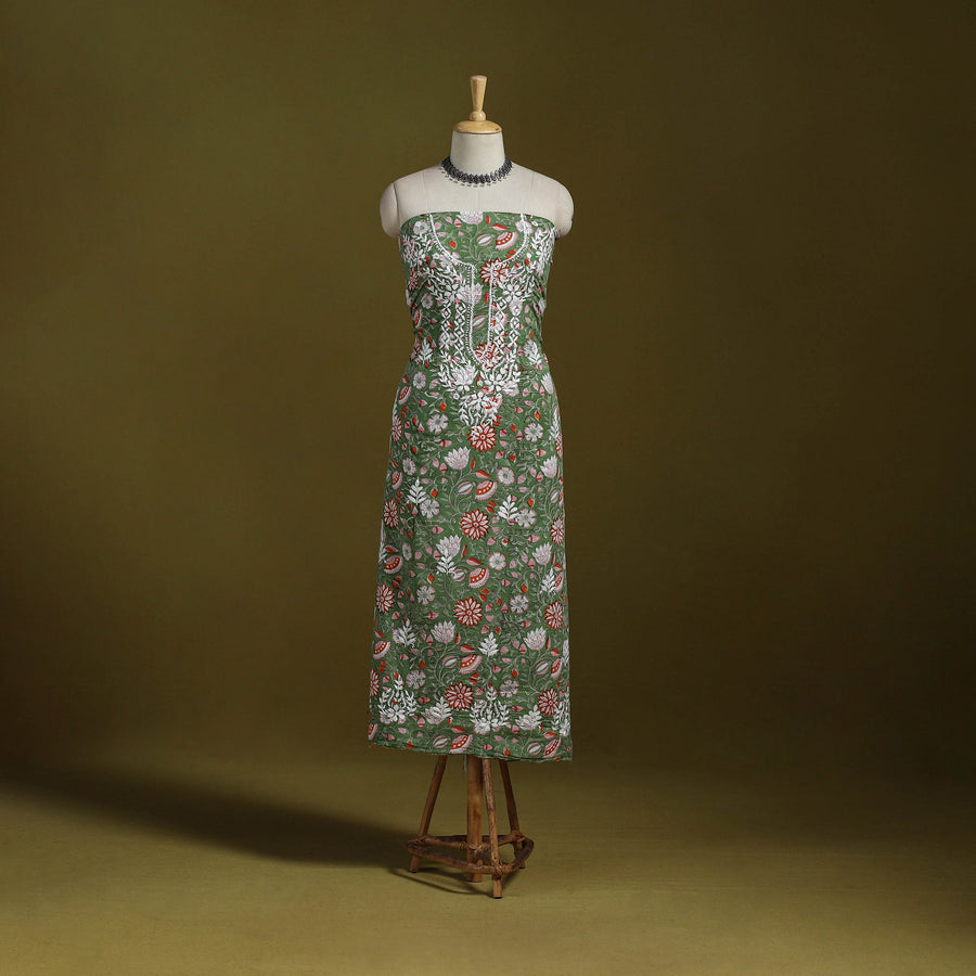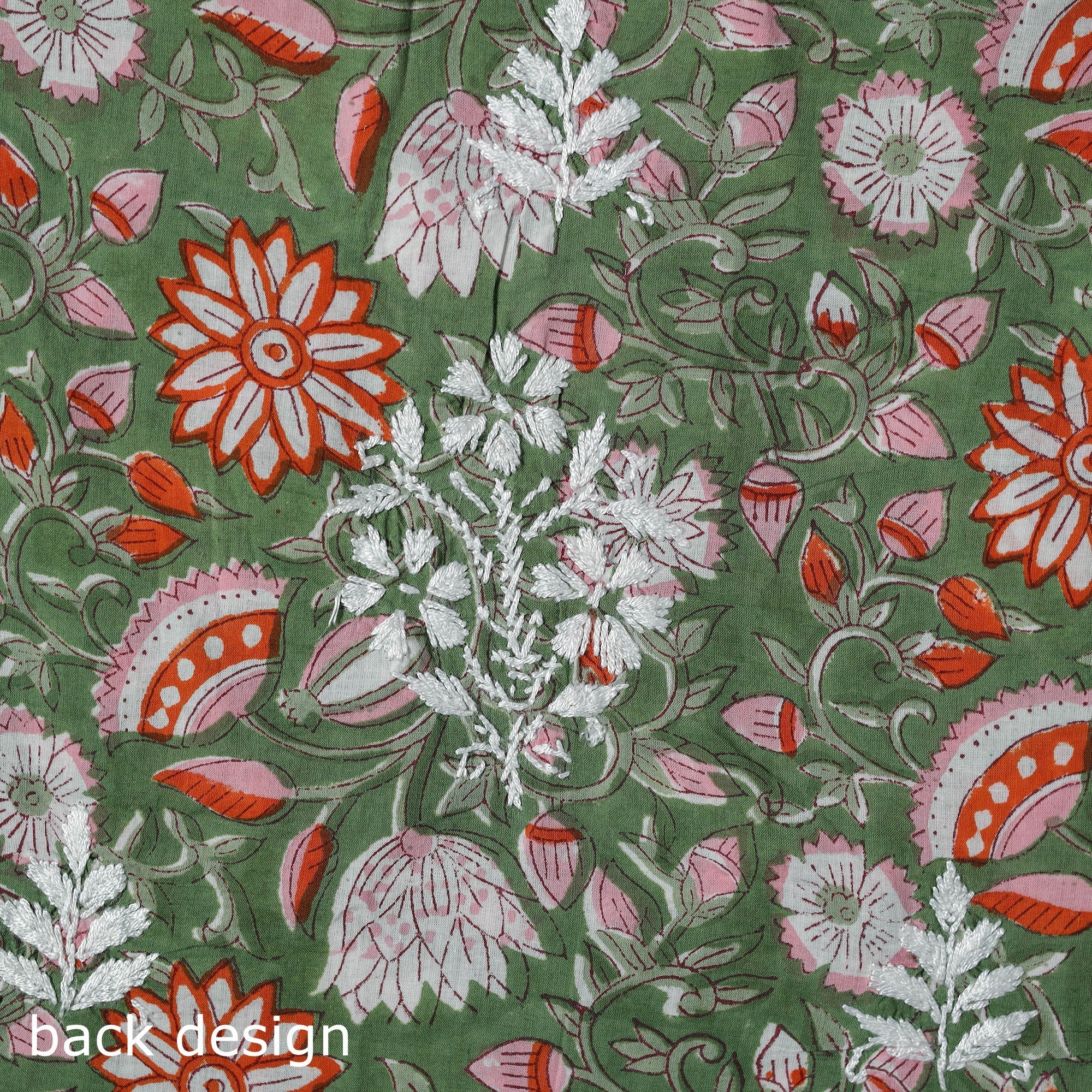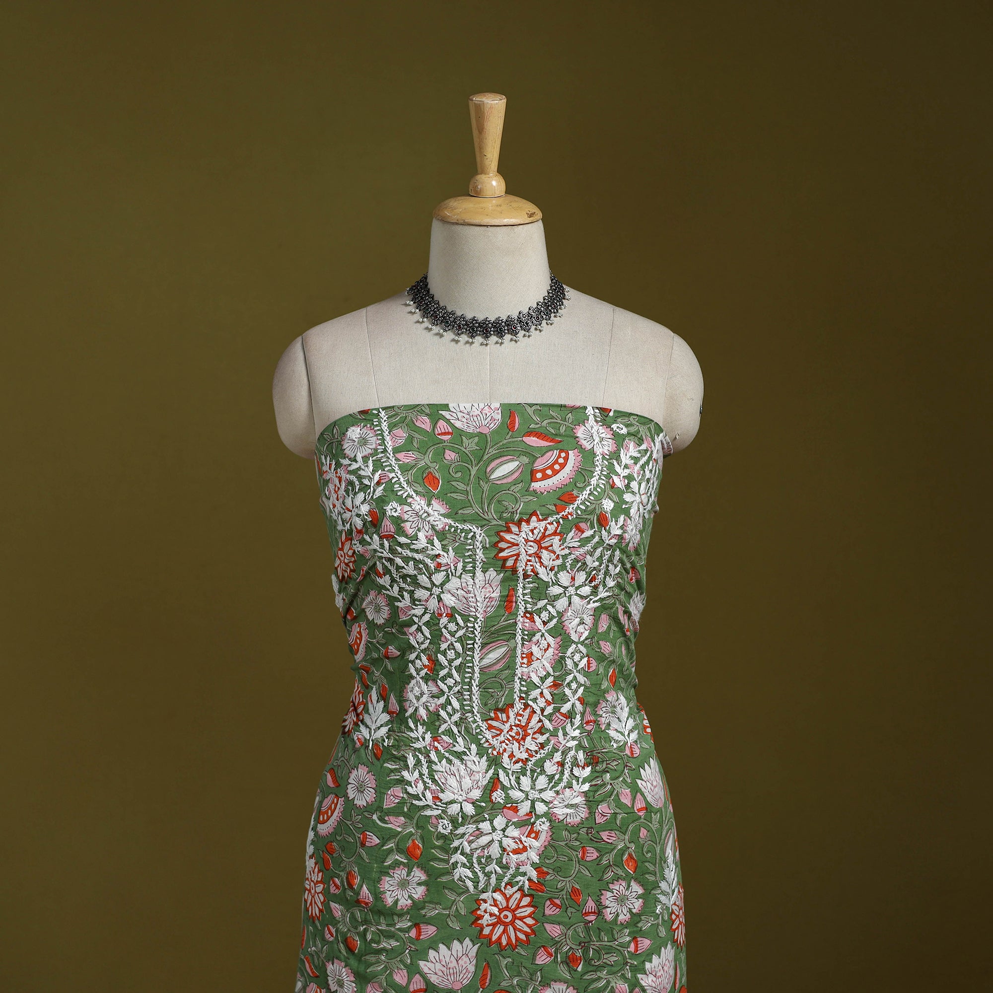 This green lucknowi chikankari cotton sanganeri unstitched kurta material brings together the intricate beauty of Chikankari hand embroidery and the delicacy of sanganeri hand block prints. The blend of textures creates a refined fabric suitable for festive moments as well as elevated everyday wear. It can be tailored to your preferred style for a polished and timeless look.