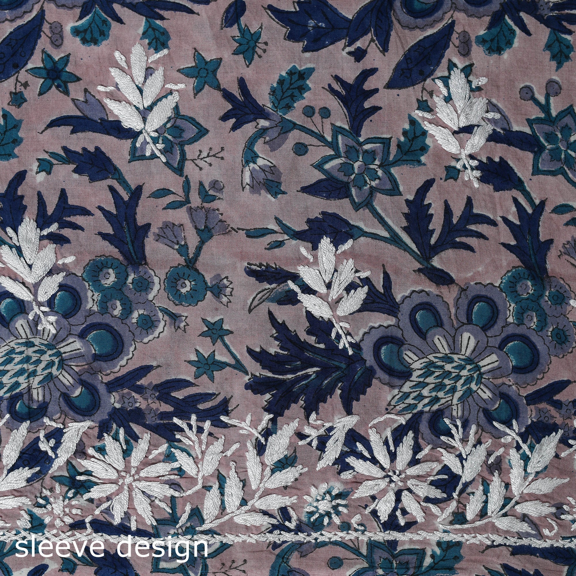 This pink lucknowi chikankari cotton sanganeri unstitched kurta material brings together the intricate beauty of Chikankari hand embroidery and the delicacy of sanganeri hand block prints. The blend of textures creates a refined fabric suitable for festive moments as well as elevated everyday wear. It can be tailored to your preferred style for a polished and timeless look.