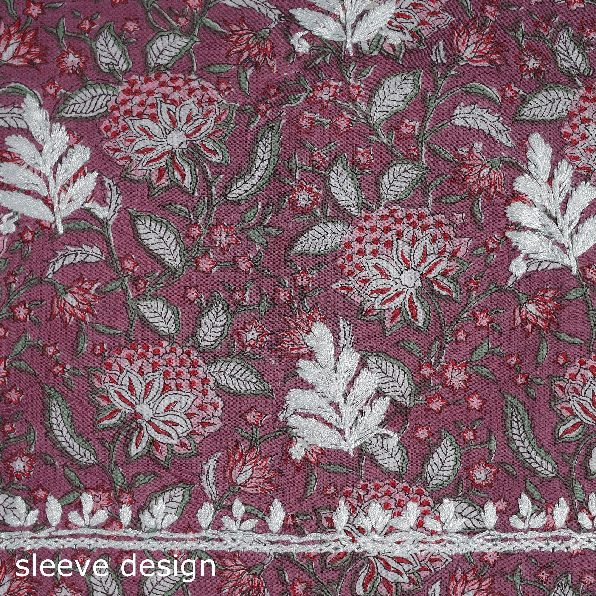 This purple lucknowi chikankari cotton sanganeri unstitched kurta material brings together the intricate beauty of Chikankari hand embroidery and the delicacy of sanganeri hand block prints. The blend of textures creates a refined fabric suitable for festive moments as well as elevated everyday wear. It can be tailored to your preferred style for a polished and timeless look.