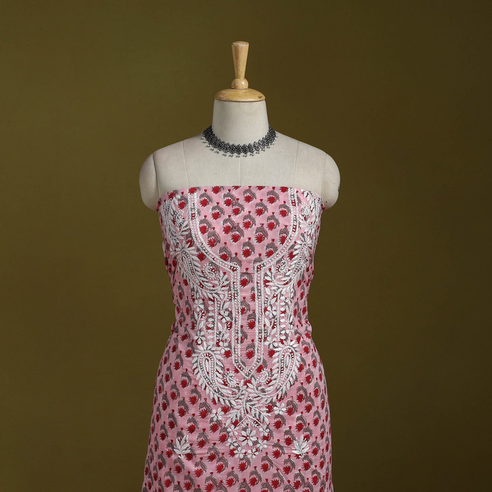 This pink lucknowi chikankari cotton sanganeri unstitched kurta material brings together the intricate beauty of Chikankari hand embroidery and the delicacy of sanganeri hand block prints. The blend of textures creates a refined fabric suitable for festive moments as well as elevated everyday wear. It can be tailored to your preferred style for a polished and timeless look.