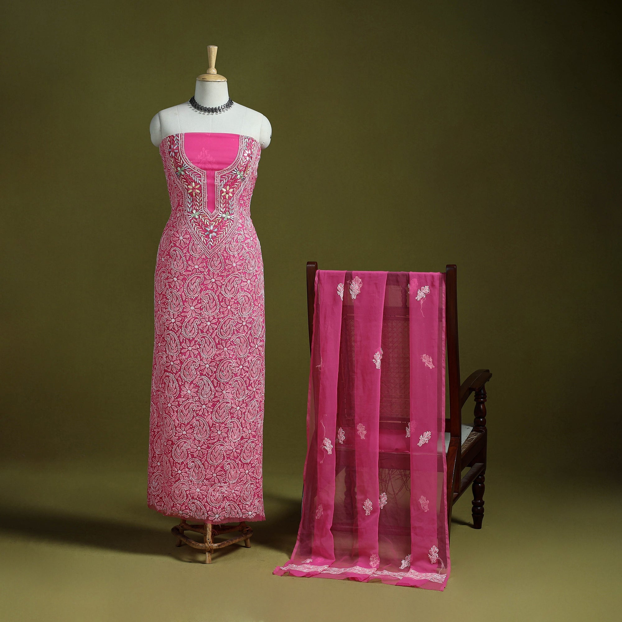Intricately and artfully crafted, this pink 3pc chikankari georgette unstitched dress material celebrates the heritage handwork of Lucknow, Uttar Pradesh. Known for its resham thread motifs and subtle elegance, Chikankari features hand-embroidered designs made with soft pastel threads that form graceful floral and paisley patterns. perfect for weddings, cultural gatherings and elegant evening occasions.
