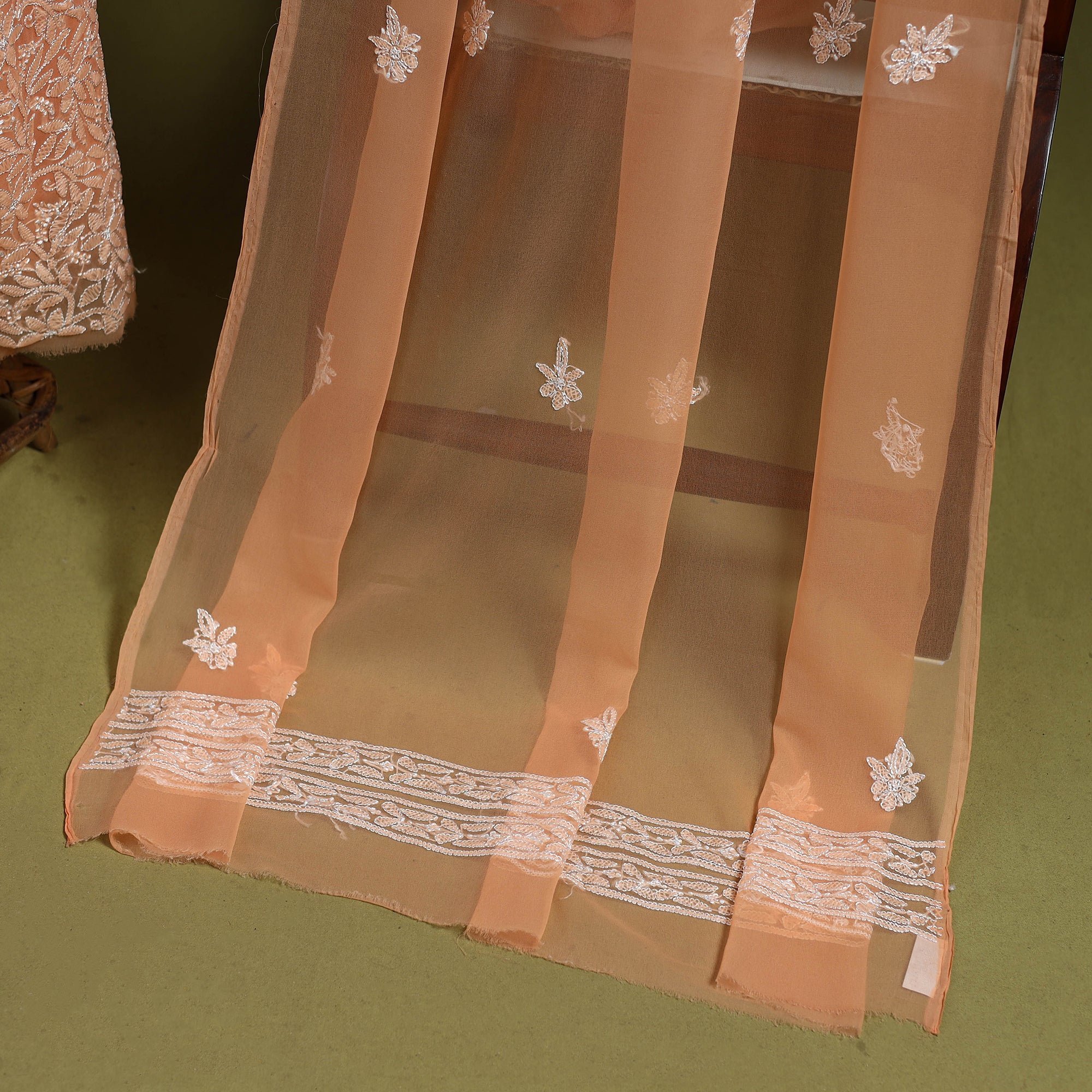 Intricately and artfully crafted, this orange3pc chikankari georgette unstitched dress material celebrates the heritage handwork of Lucknow, Uttar Pradesh. Known for its resham thread motifs and subtle elegance, Chikankari features hand-embroidered designs made with soft pastel threads that form graceful floral and paisley patterns. perfect for weddings, cultural gatherings and elegant evening occasions.